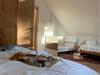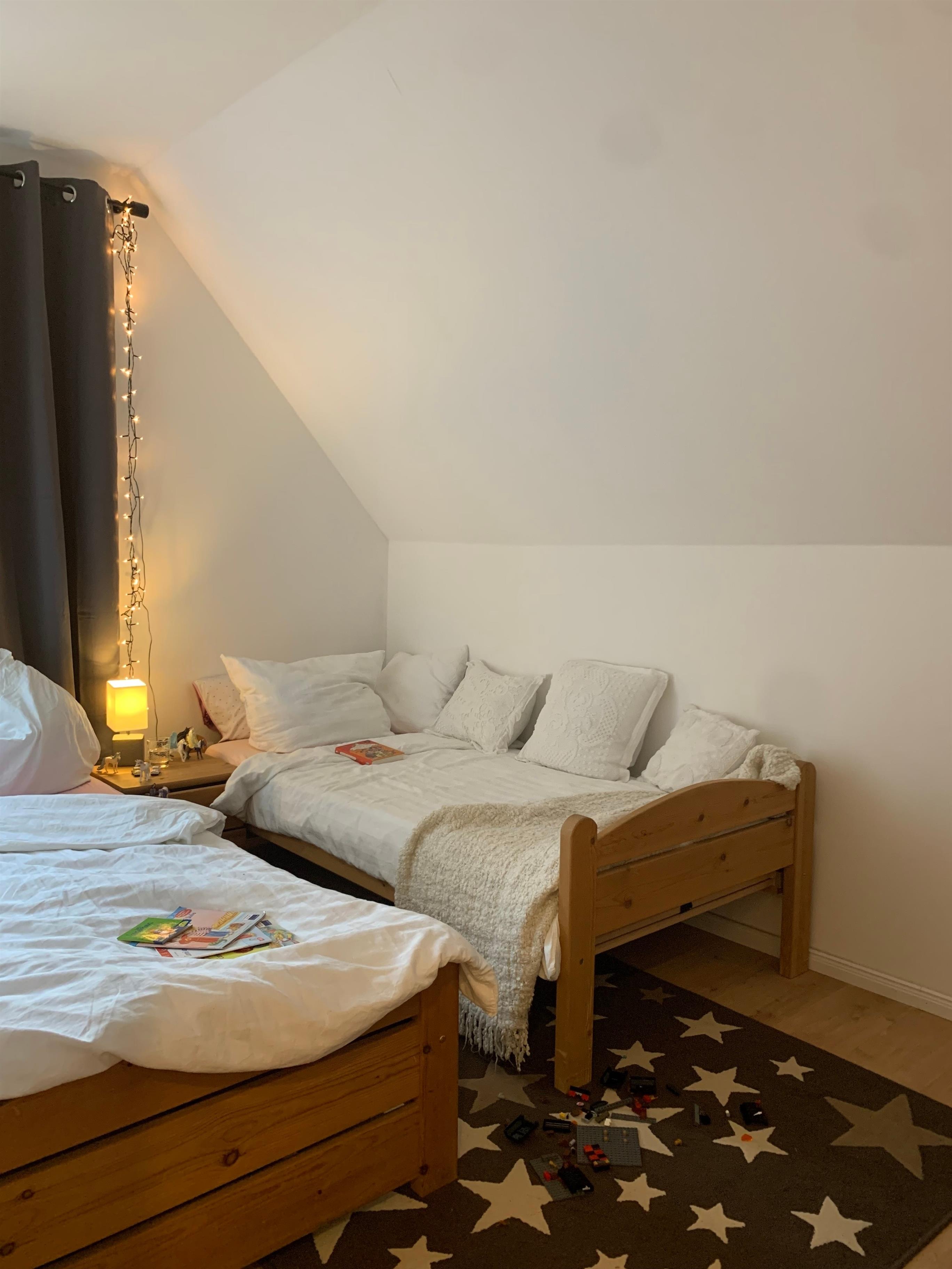 1. Schlafzimmer mit Doppelbett, Nachttischen, Leseleuchten, Einzelbett, Babybett und großem Kleiderschrank