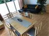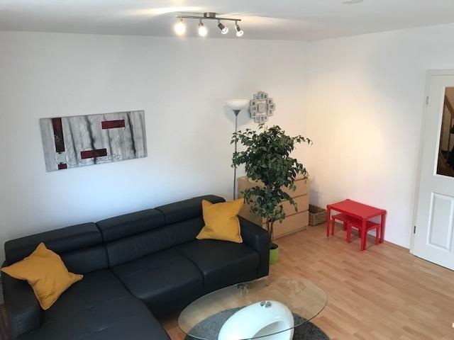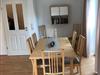 Das großzügige Wohn- und Esszimmer ist dank bodentiefer Fenster lichtdurchflutet und schafft eine freundliche, offene Atmosphäre. Die modernen Esszimmermöbel sind in hellem Holz gehalten. Der Wohnbereich verfügt über eine moderne Ledercouch. Vom Wohnzimmer aus haben die Sie direkten Zugang zur Terrasse und zum Garten.