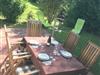 Von April bis Oktober stehen hier bequeme Gartenmöbel bereit, ideal für gemütliche Stunden im Freien.