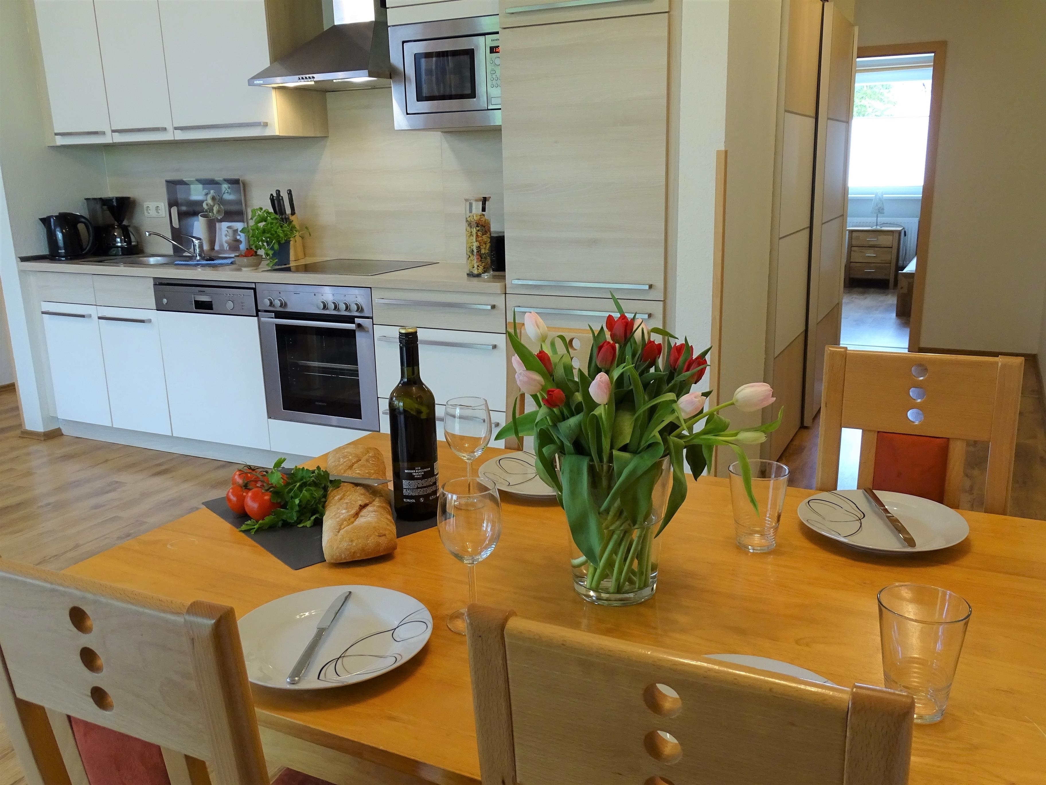 Unsere schöne und geräumige Ferienwohnung (ca.64m²) in ruhiger, strandnaher Lage ist ausgestattet für 4 Personen und verfügt über 2 separate Schlafzimmer. Sie bietet ein modernes Wohnzimmer mit Couch- und Essecke, SAT-Flachbild-TV und integrierte offene Küchenzeile. Die Einbauküche ist mit Geschirrspüler, Backofen, Ceranfeld, Mikrowelle, Kaffeemaschine, Toaster uvm. ausgestattet... Die Schlafzimmer (einmal mit Doppelbett und eines mit getrennt stehenden Einzelbetten) sind gemütlich eingerichtet. Das Duschbad ist hell und geräumig. Genießen Sie Ihre Urlaubsstunden auch auf der sonnigen Terrasse direkt am Objekt.