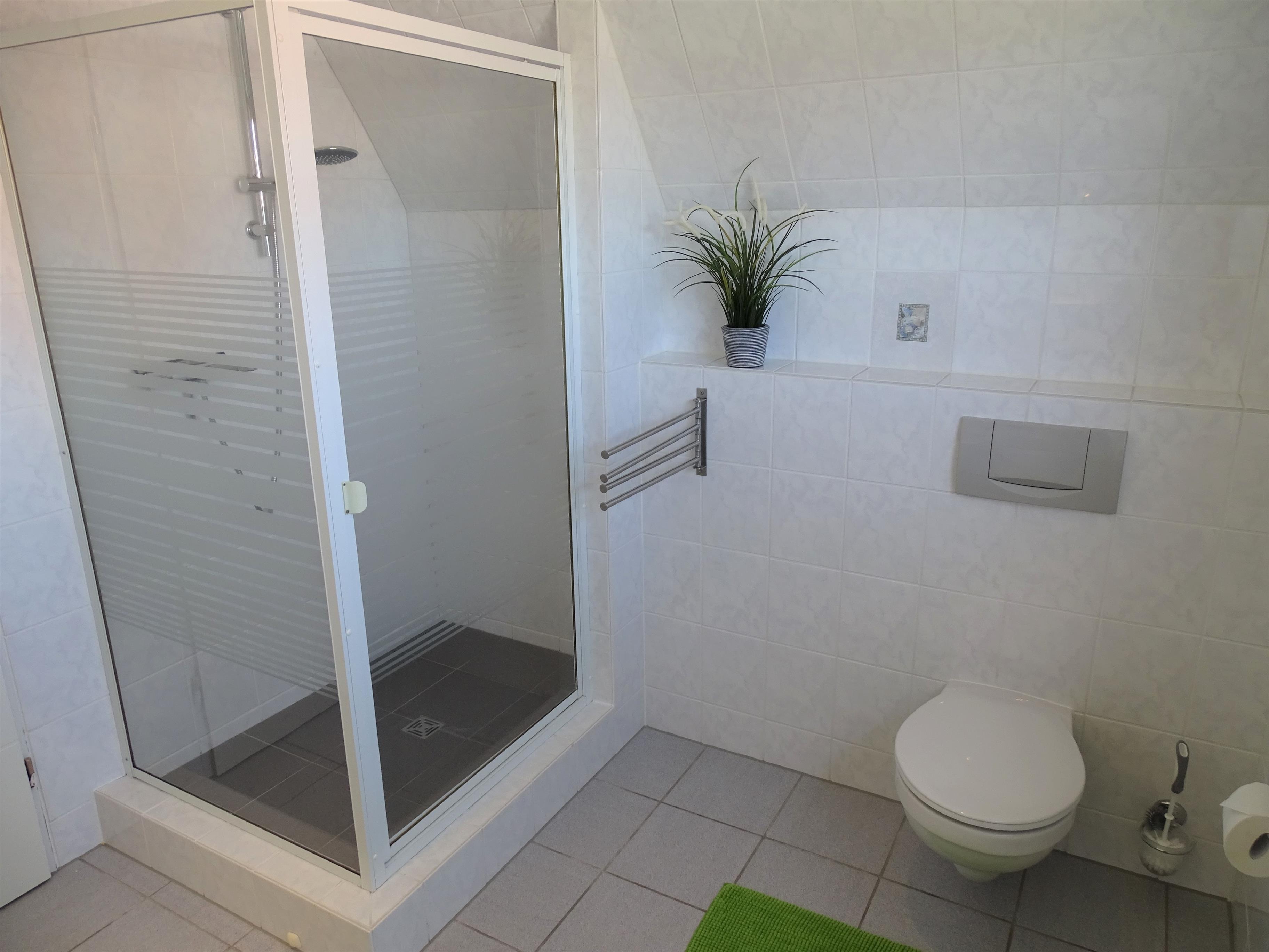 Das große Badezimmer verfügt über eine 1,20 x 0,85 m Dusche mit Trennwand. Kosmetikspiegel, Waage und Föhn gehören mit zur Ausstattung.