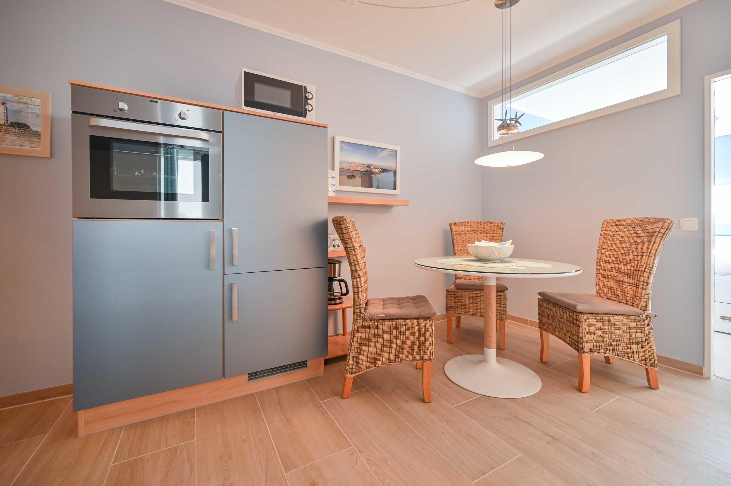 Die frisch renovierte 3 Raum Ferienwohnung besticht durch eine große, voll eingerichtete Küche .