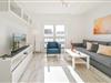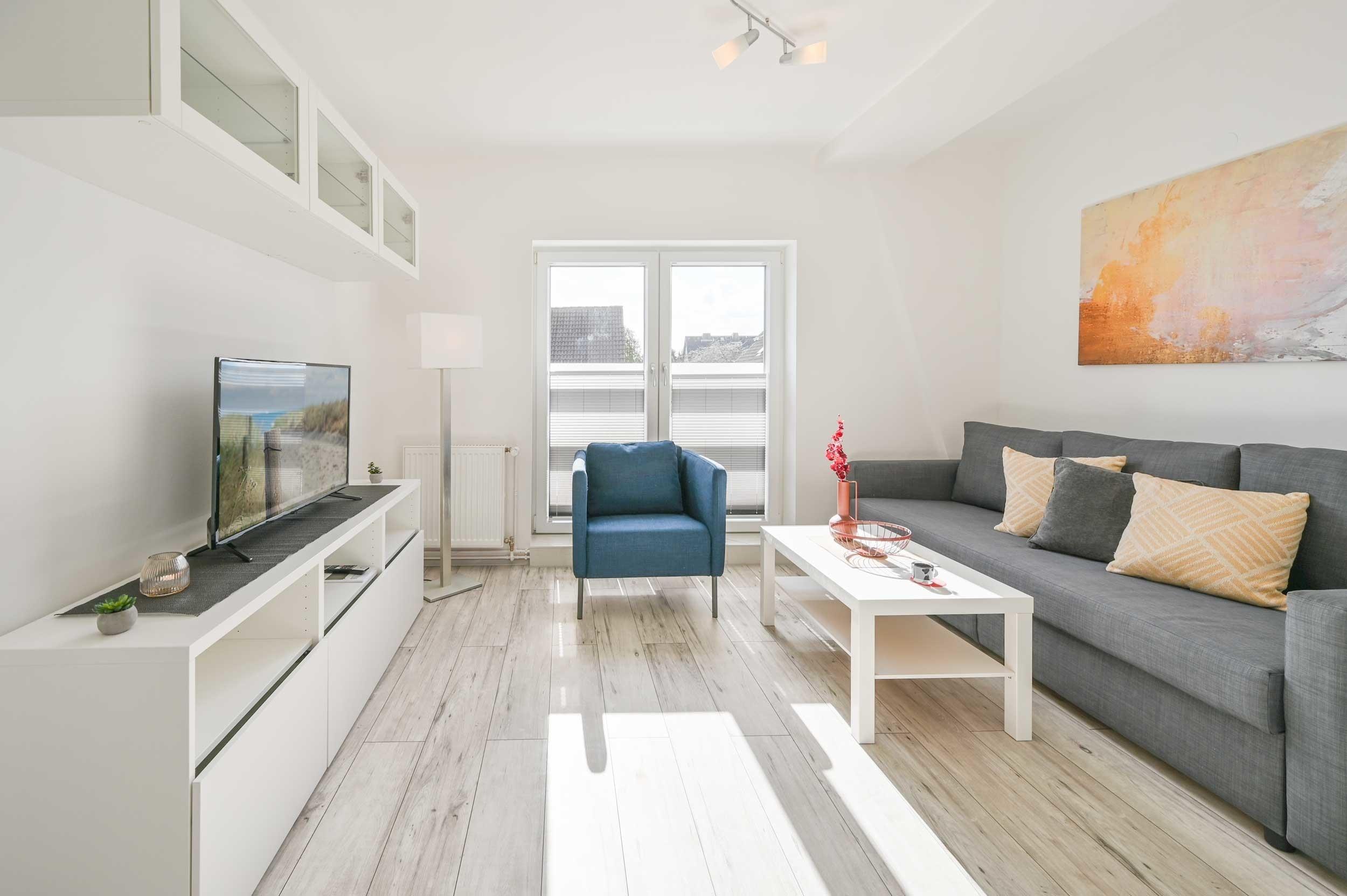 Wohnraum mit Schlafsofa, Couchtisch, TV-Möbel mit Flachbild-TV und Esstisch mit 4 Stühlen.