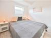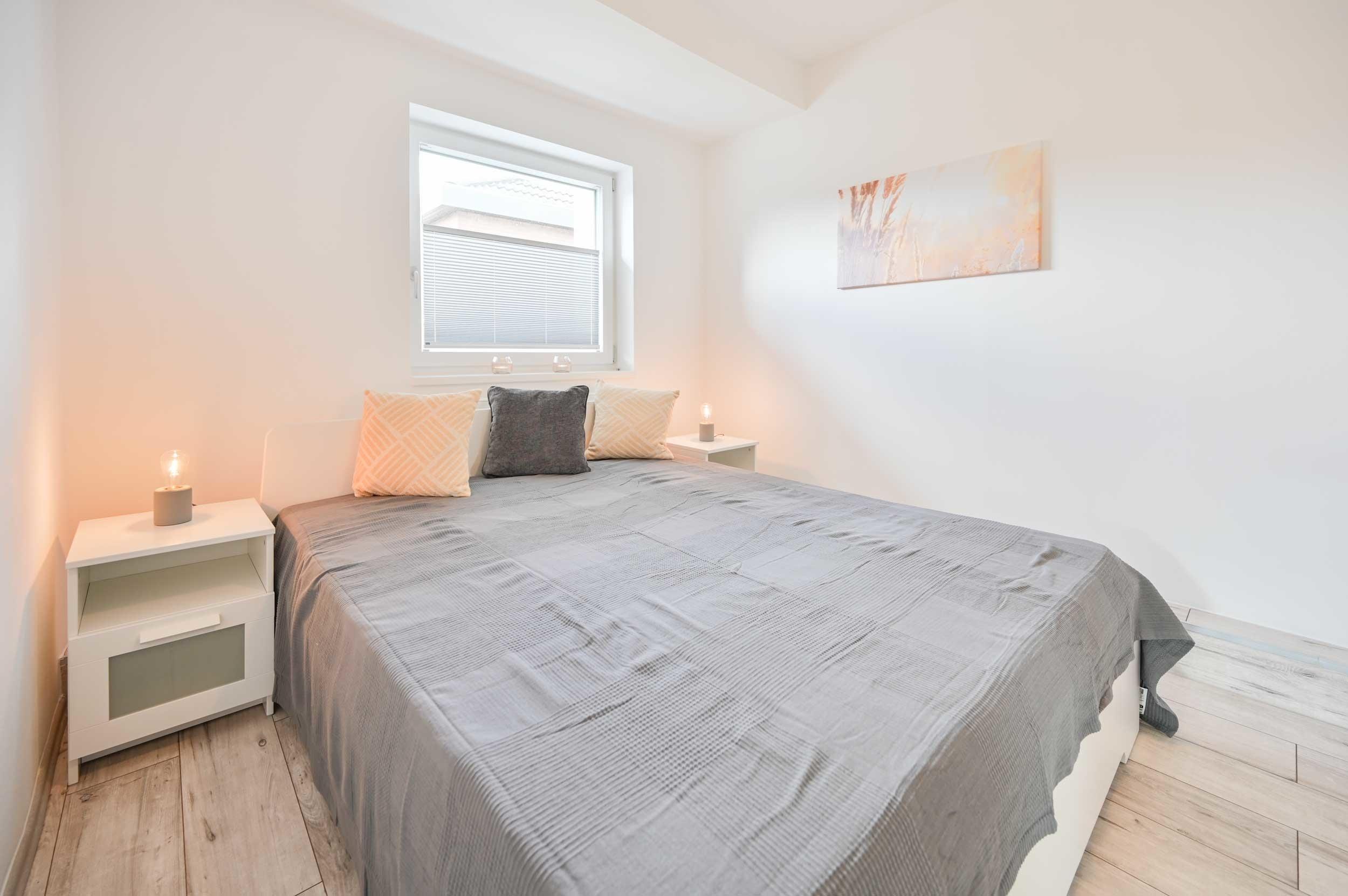 Schlafzimmer mit Doppelbett (160cm breit mit durchgehender Matratze), Nachttischen mit Leseleuchten und Kleiderschrank.