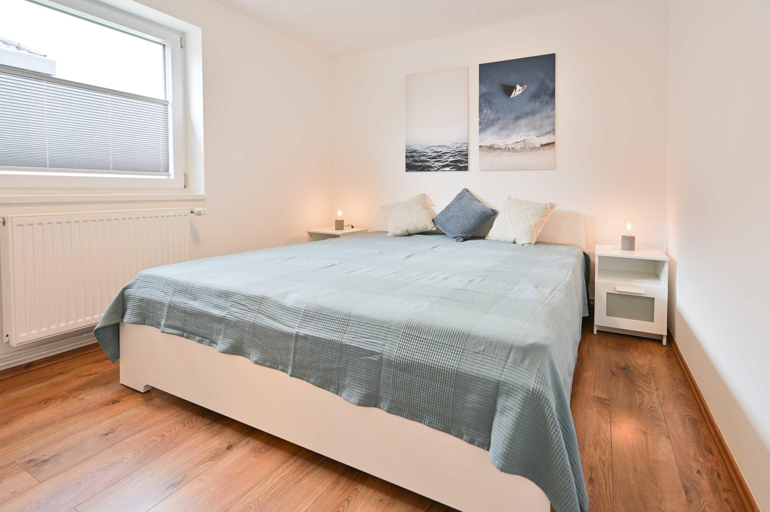 Das Schlafzimmer verfügt über ein Doppelbett, Nachttische mit Leseleuchten und Kleiderschrank.