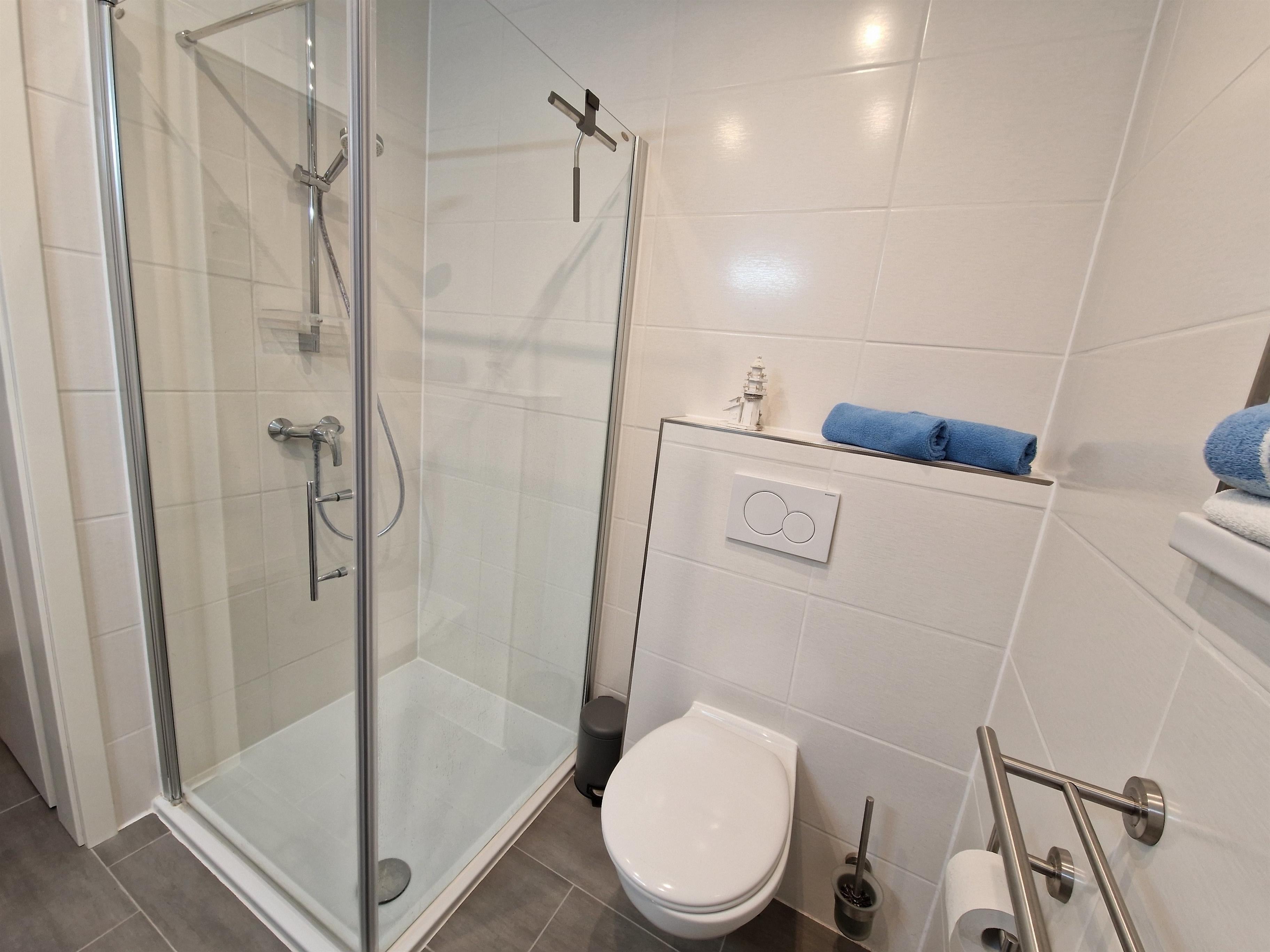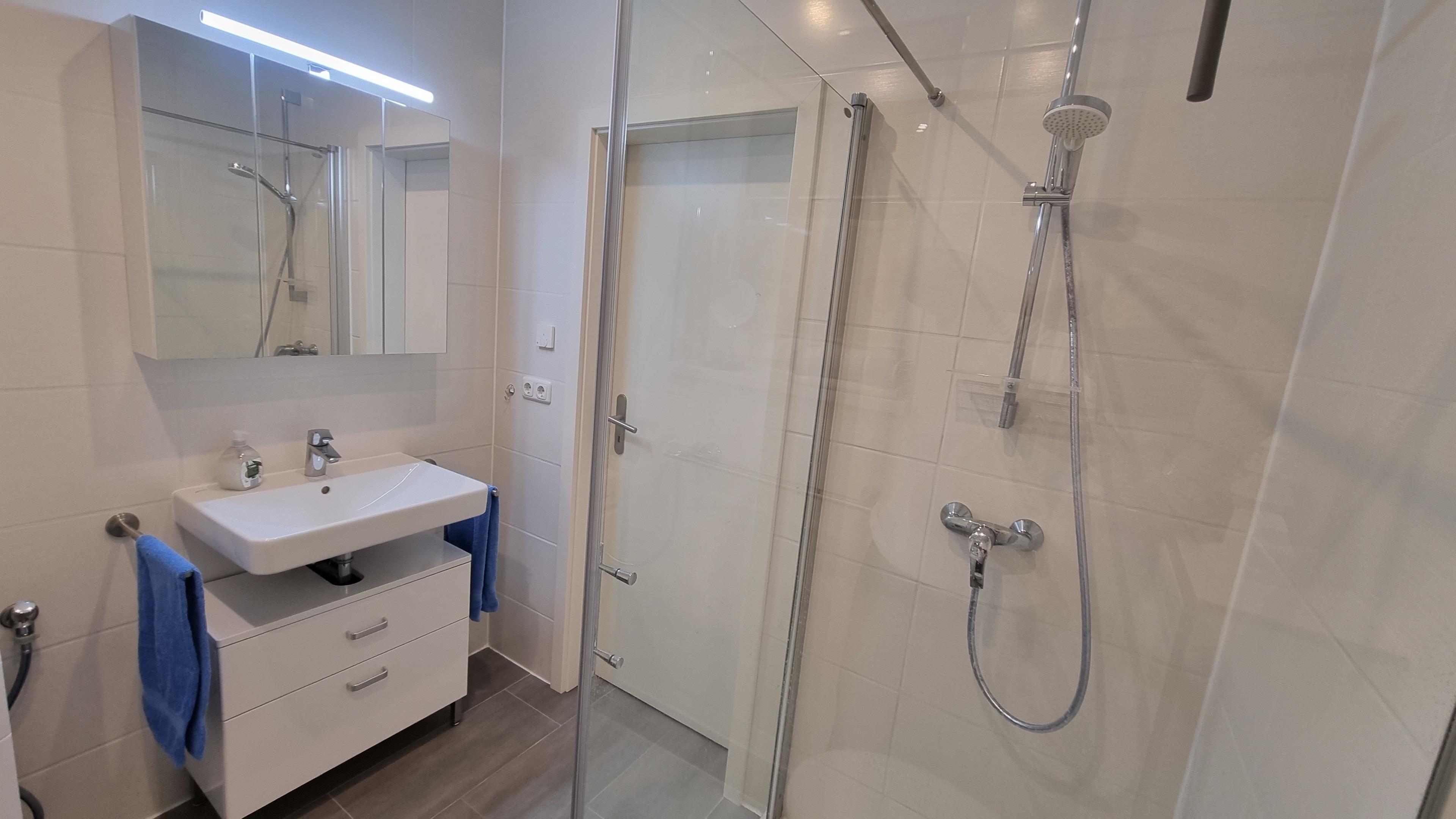 Das Badezimmer mit Tageslicht verfügt über eine Dusche mit niedrigem Einstieg, Waschbecken und WC. Auch ein Föhn und Schminkspiegel sind vorhanden.