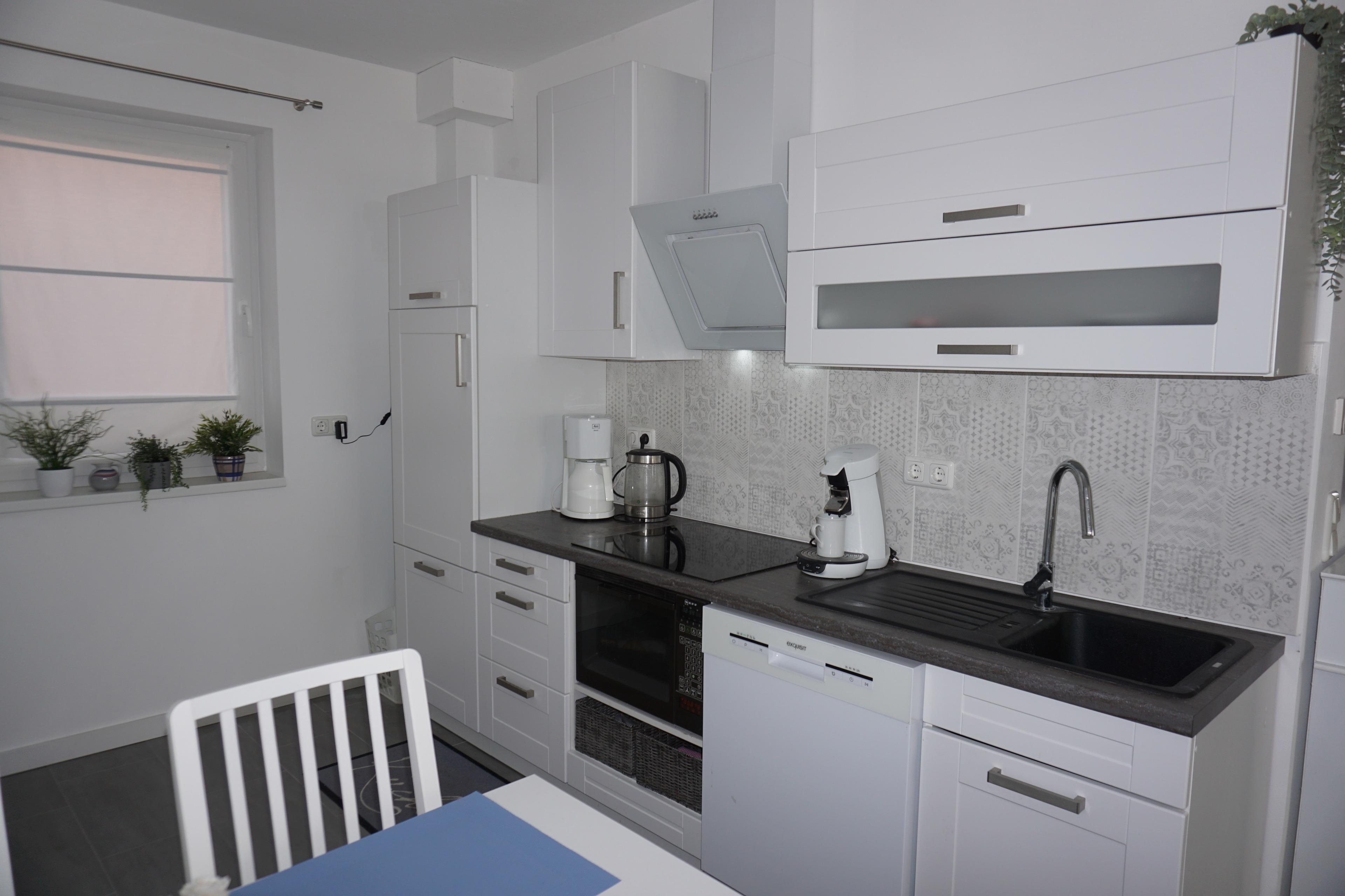 Die moderne Küche ist u.a. mit Geschirrspülmaschine, Kühlschrank mit Gefrierfach, Backofen, 4 Platten Cerankochfeld, Mikrowelle, Kaffeemaschine, Senseo-Padmaschine, Eierkocher, Wasserkocher und Toaster ausgestattet.