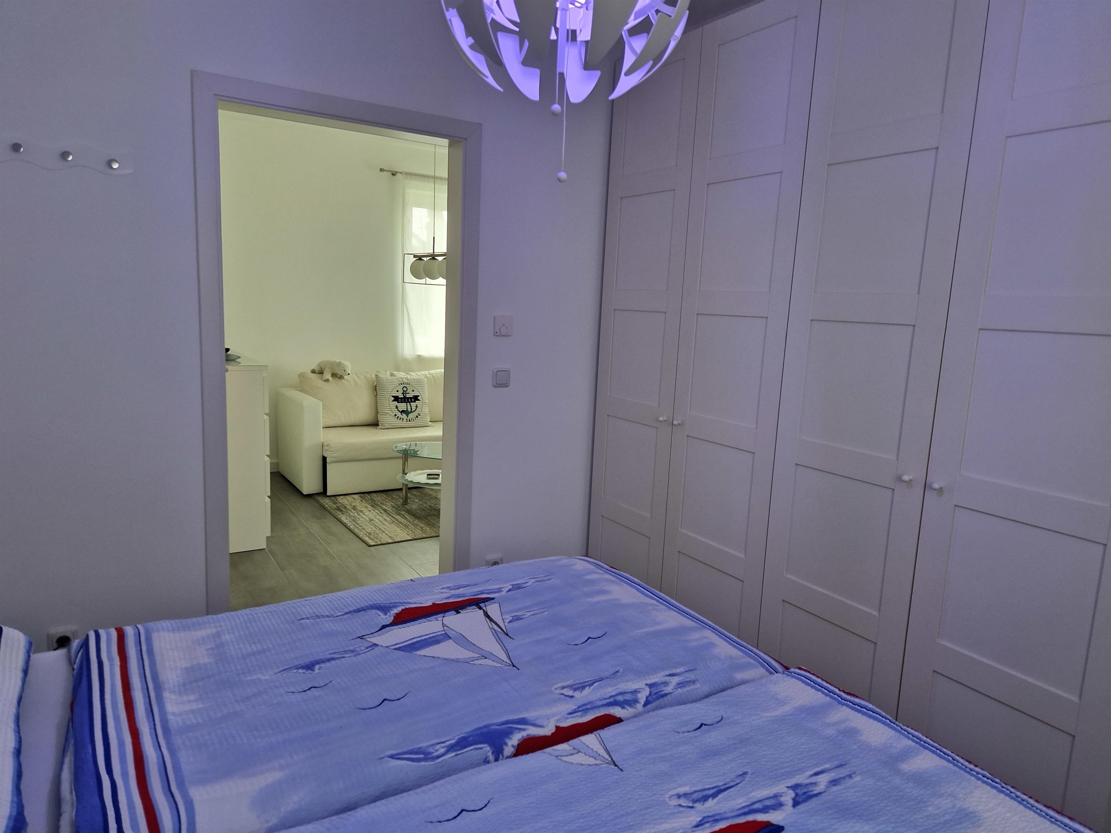 Im Schlafzimmer befinden sich ein Doppelbett, zwei Nachttische mit Beleuchtung, ein großer Kleiderschrank und ein geräumiger Schuhschrank.