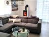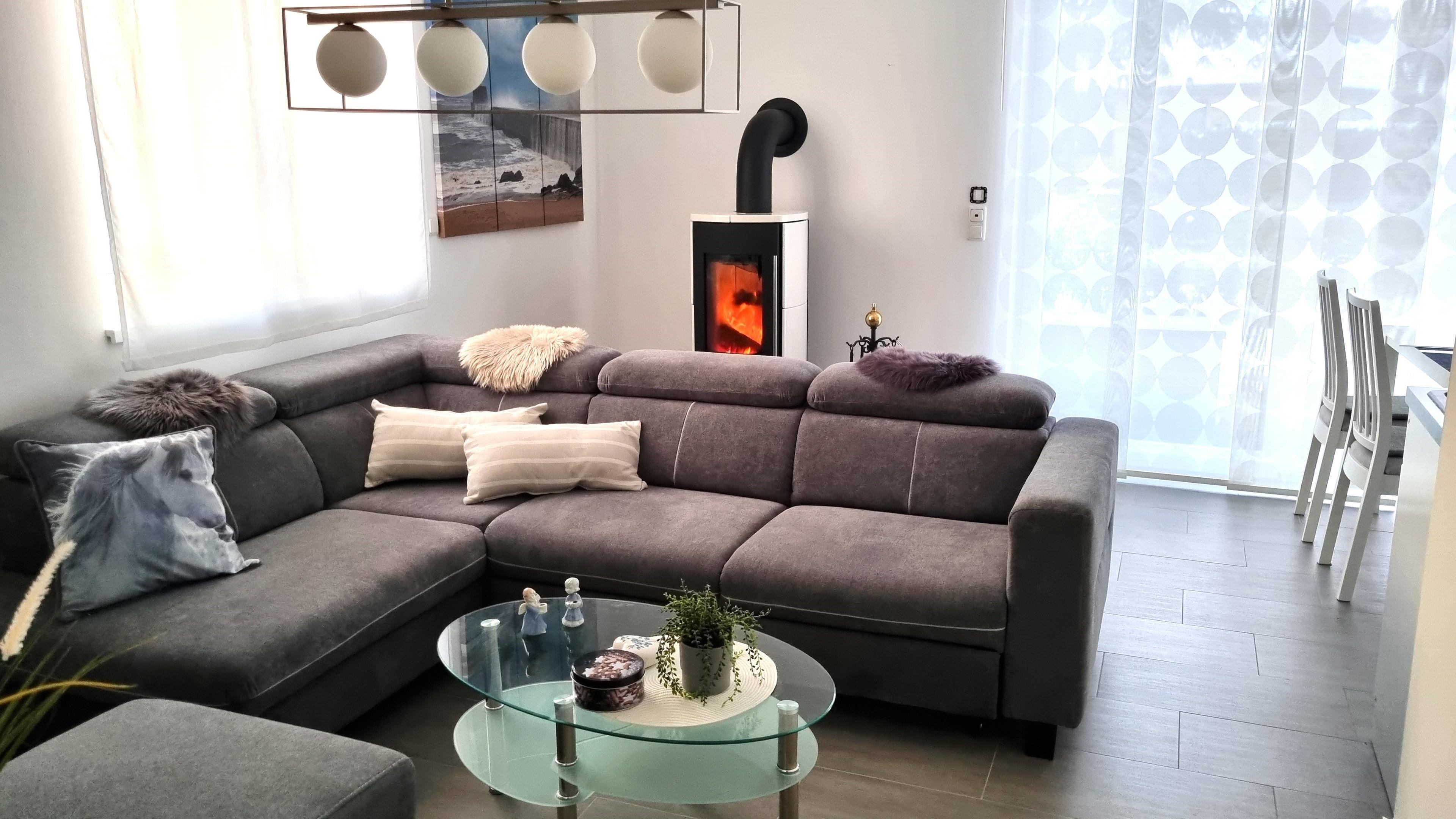 Der 55-Zoll TV Bildschirm im Wohnzimmer lädt zu gemütlichen Fernsehabenden auf der L-förmigen Couch ein.