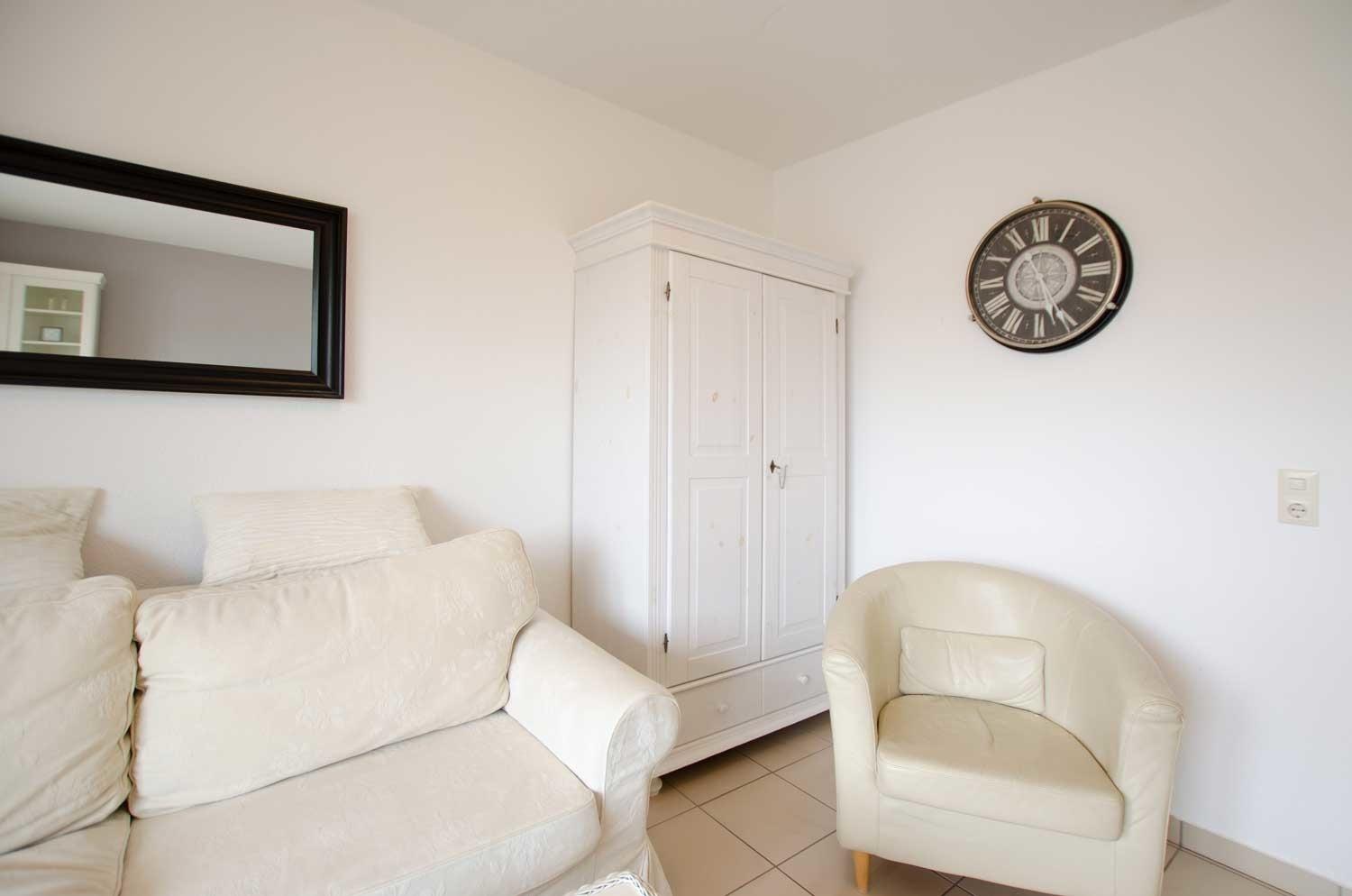 Besucher finden zudem ein separates, kleines Schlafzimmer mit Doppelbett, Kommode und Nachttisch mit Lampe vor.