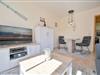 Das Wohnzimmer ist mit einem Ecksofa mit Schlaffunktion ausgestattet. Weiterhin befindet sich darin ein Esstisch mit 2 Stühlen sowie ein Fernseher und eine Musikanlage.