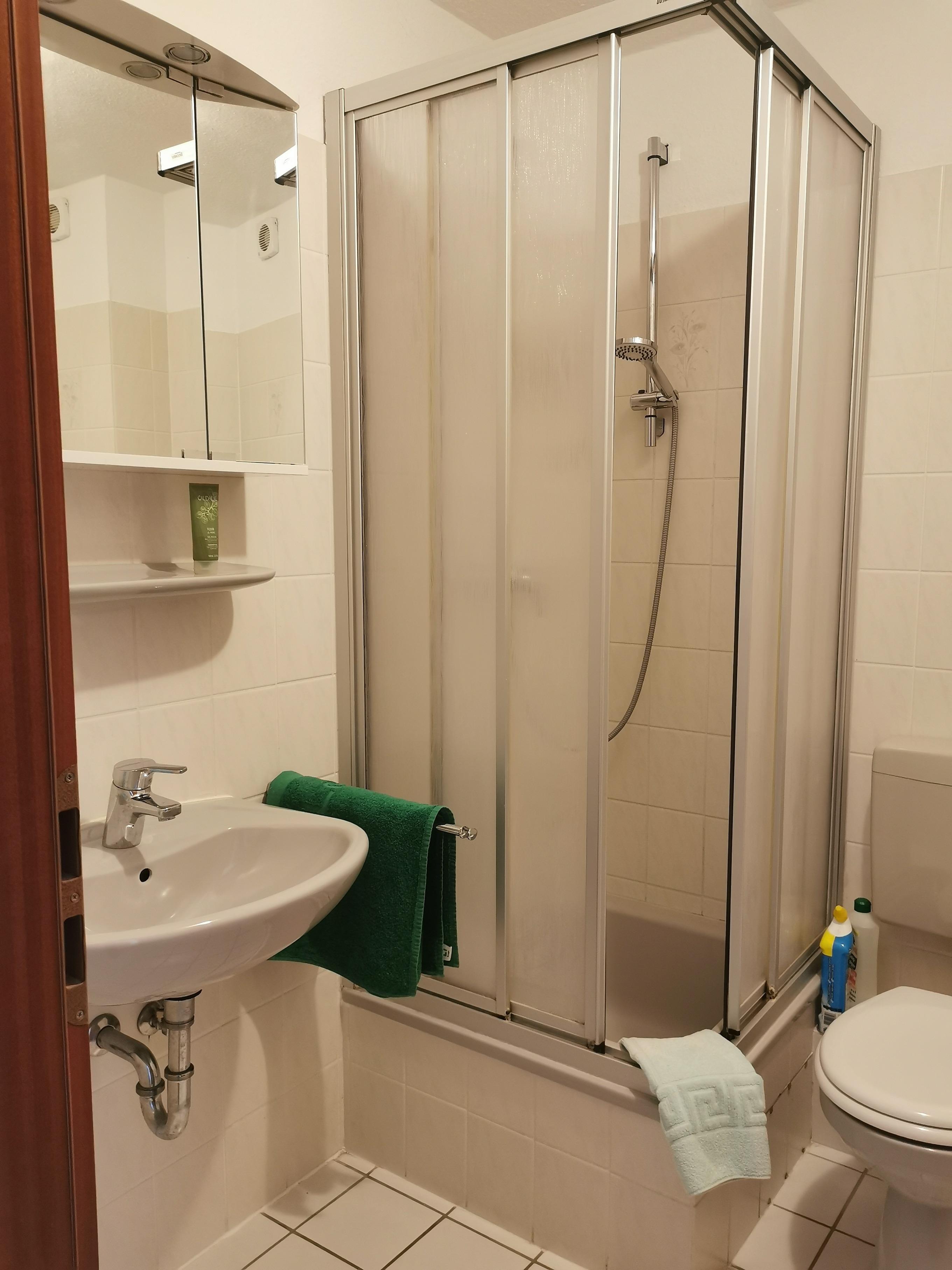 Das Badezimmer im Obergeschoss verfügt über eine Dusche und ein WC.