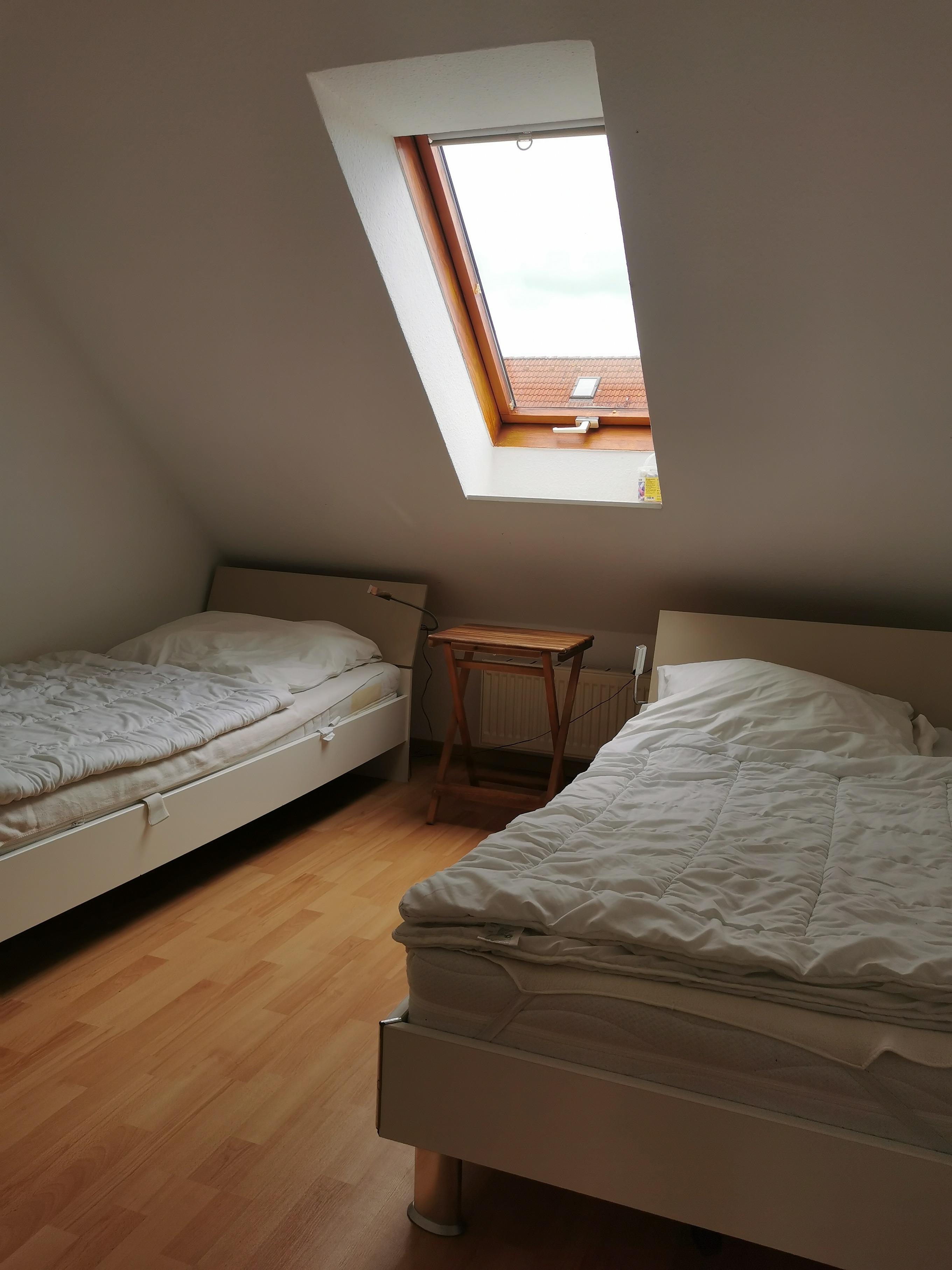 Eine Treppe führt Sie in das Obergeschoss, wo Sie zwei Schlafzimmer vorfinden. Das erste Schlafzimmer ist mit einem Doppelbett ausgestattet und das zweite Schlafzimmer bietet Einzelbetten für erholsame Nächte. Hier finden Sie Kleiderschränke, um Ihre Kleidung und persönlichen Gegenstände ordentlich zu verstauen.