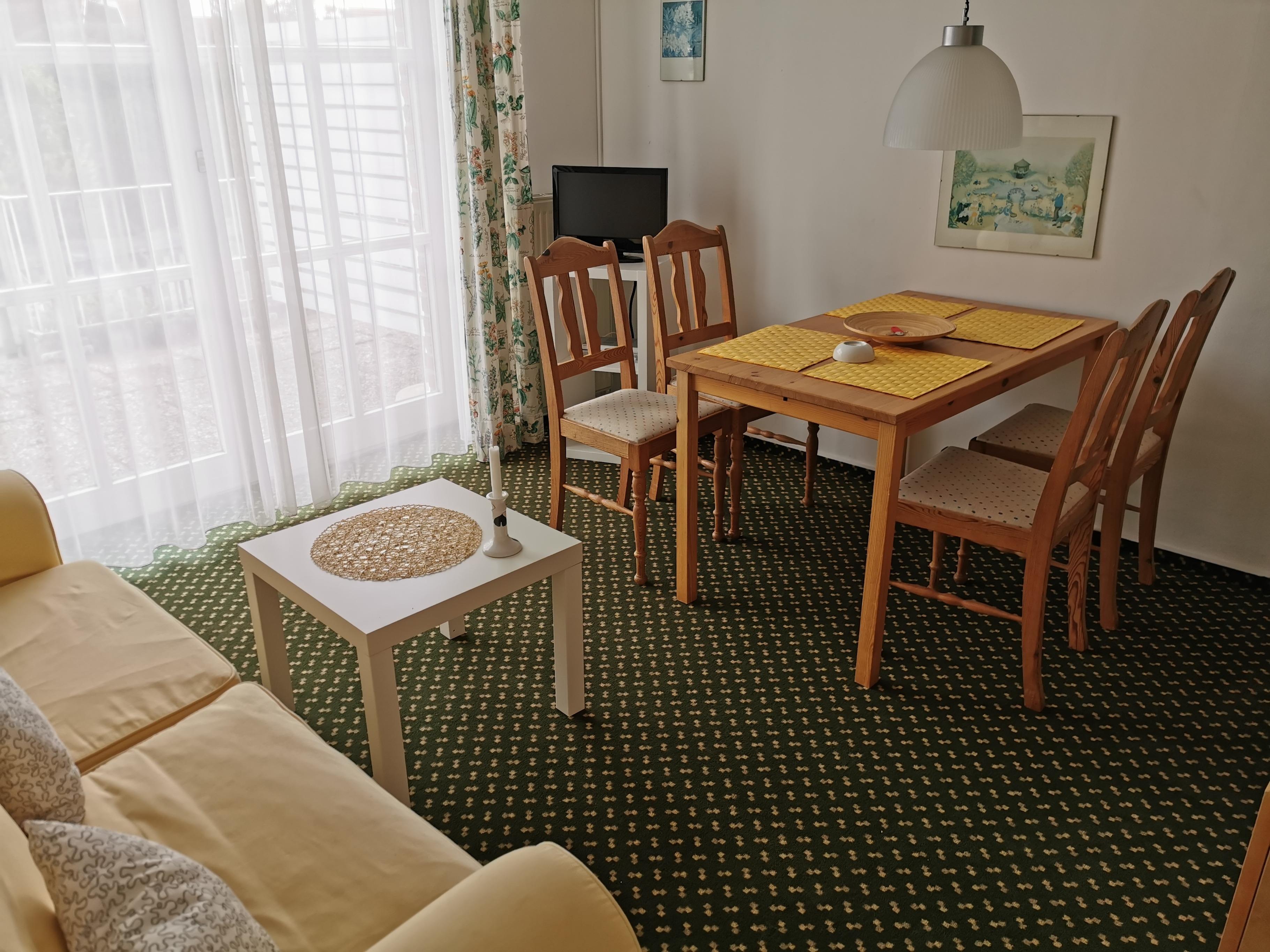 Schlafraum mit Doppelbett (1,60 m breit), Wohnzimmer mit Doppelschlafcouch, Küche, Kühlschrank mit Gefrierfach, 4-Platten-Herd mit Backofen, Duschbad. Auf Wunsch stellen wir Ihnen eine Mikrowelle, Kinderbett und Hochstuhl unentgeltlich zur Verfügung. Waschmaschine und Trockner werden über einen Münzautomaten abgerechnet. Über WLAN haben Sie kostenlosen Internetzugang. Unseren Garten können Sie zum Spielen, Grillen und Entspannen nutzen. Sandkasten und Schaukelgerät, Liegestühle und sonstige Gartenmöbel stehen Ihnen zur Verfügung. Ein Haustier (Hund) ist in der Nebensaison erlaubt.