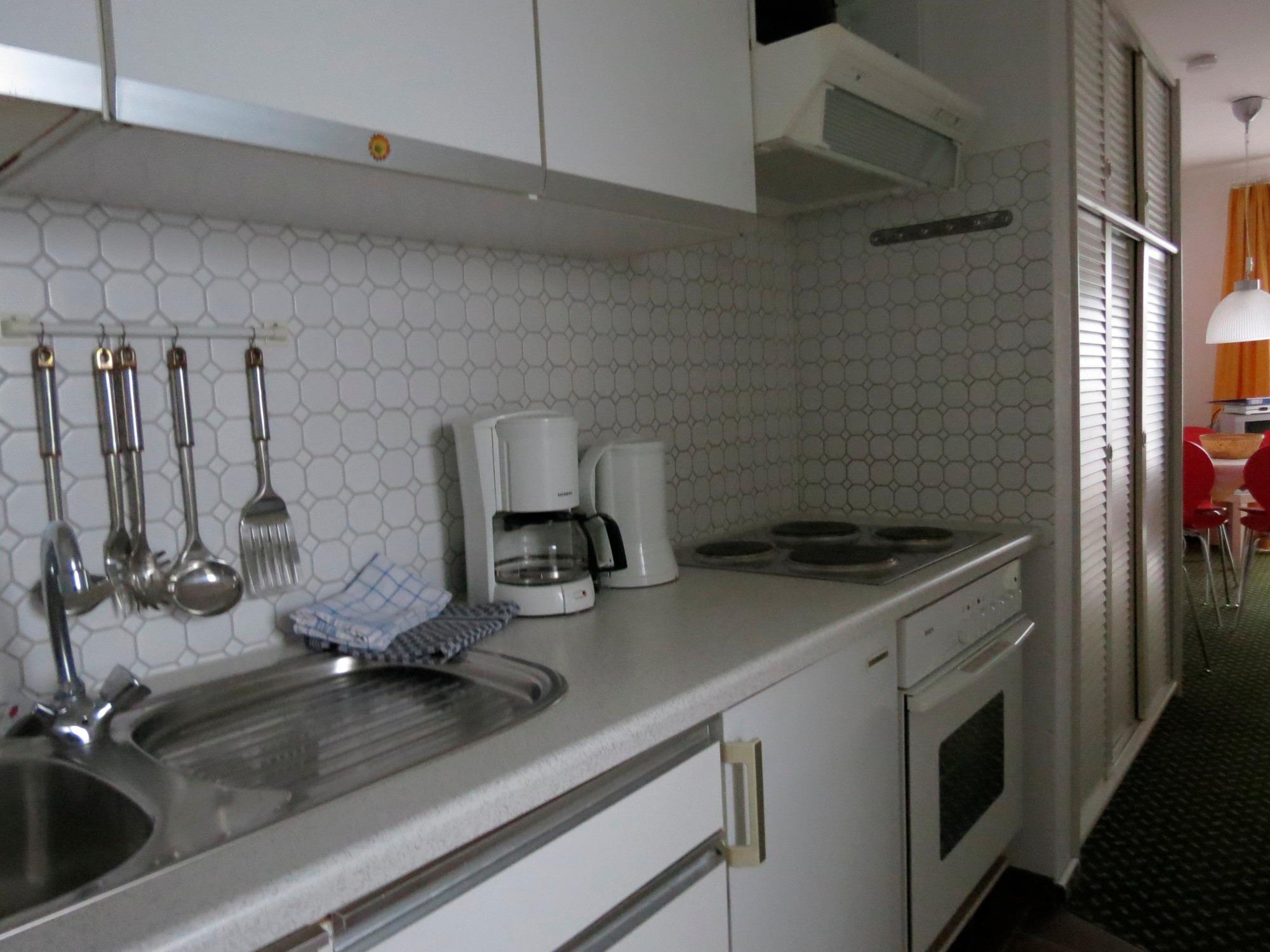 Küche mit Geschirrspüler, Herd mit Ceranfeld und Backofen, Mikrowelle auf Anfrage, Kühlschrank mit TK-Fach.