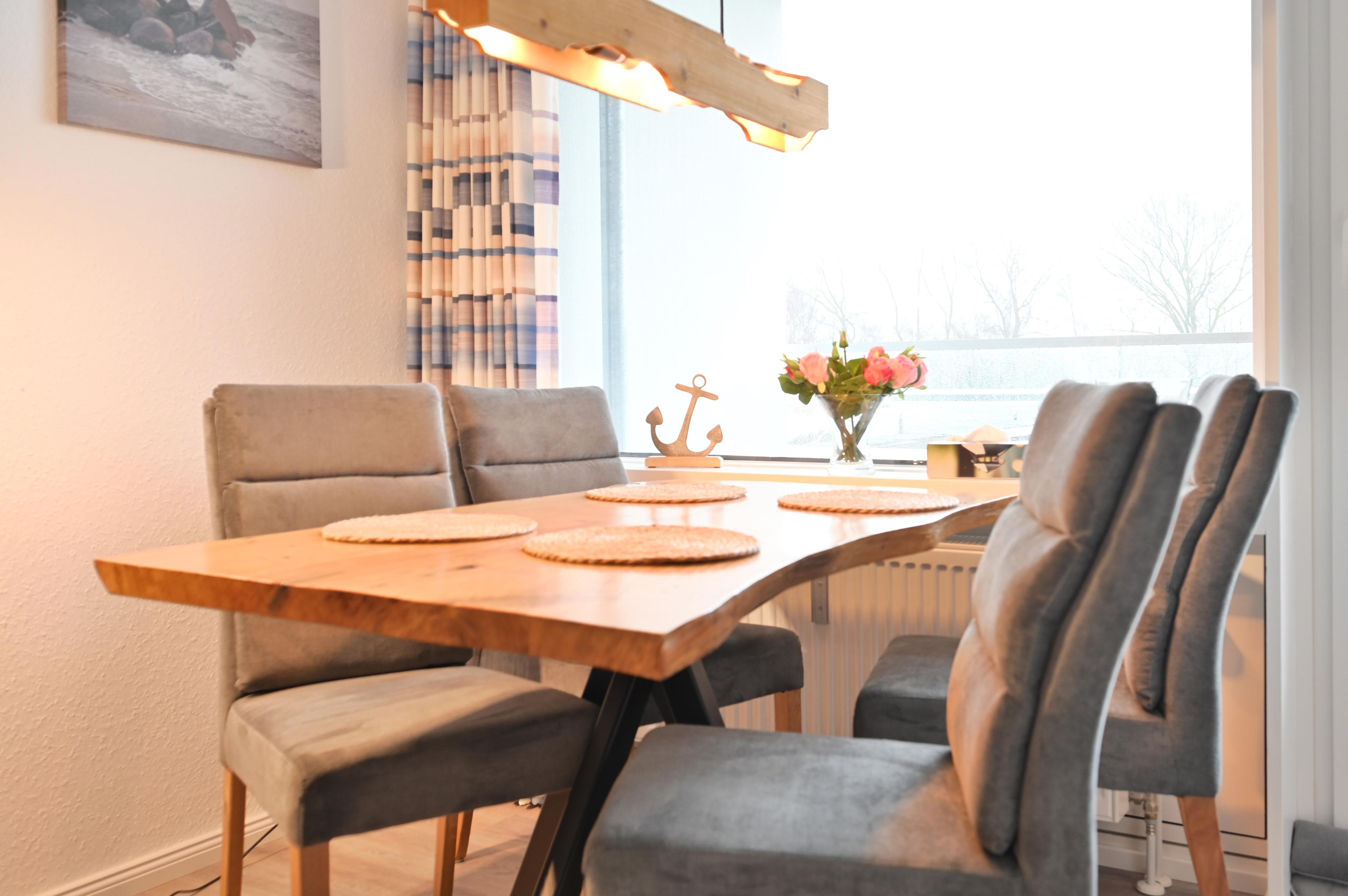 Der helle und gemütliche Wohn Schlafraum bildet das Herzstück der Wohnung. Hier befindet sich ein komfortables Doppelbett in der Größe 160 x 200 cm sowie ein großer Esstisch mit vier Stühlen, der direkt am Fenster steht. Von hier aus genießen Sie nicht nur Ihre Mahlzeiten, sondern auch den Blick nach draußen. Der angrenzende Balkon lädt dazu ein, die frische Ostseeluft zu genießen und den Ausblick auf die Ostsee auf sich wirken zu lassen.