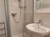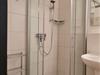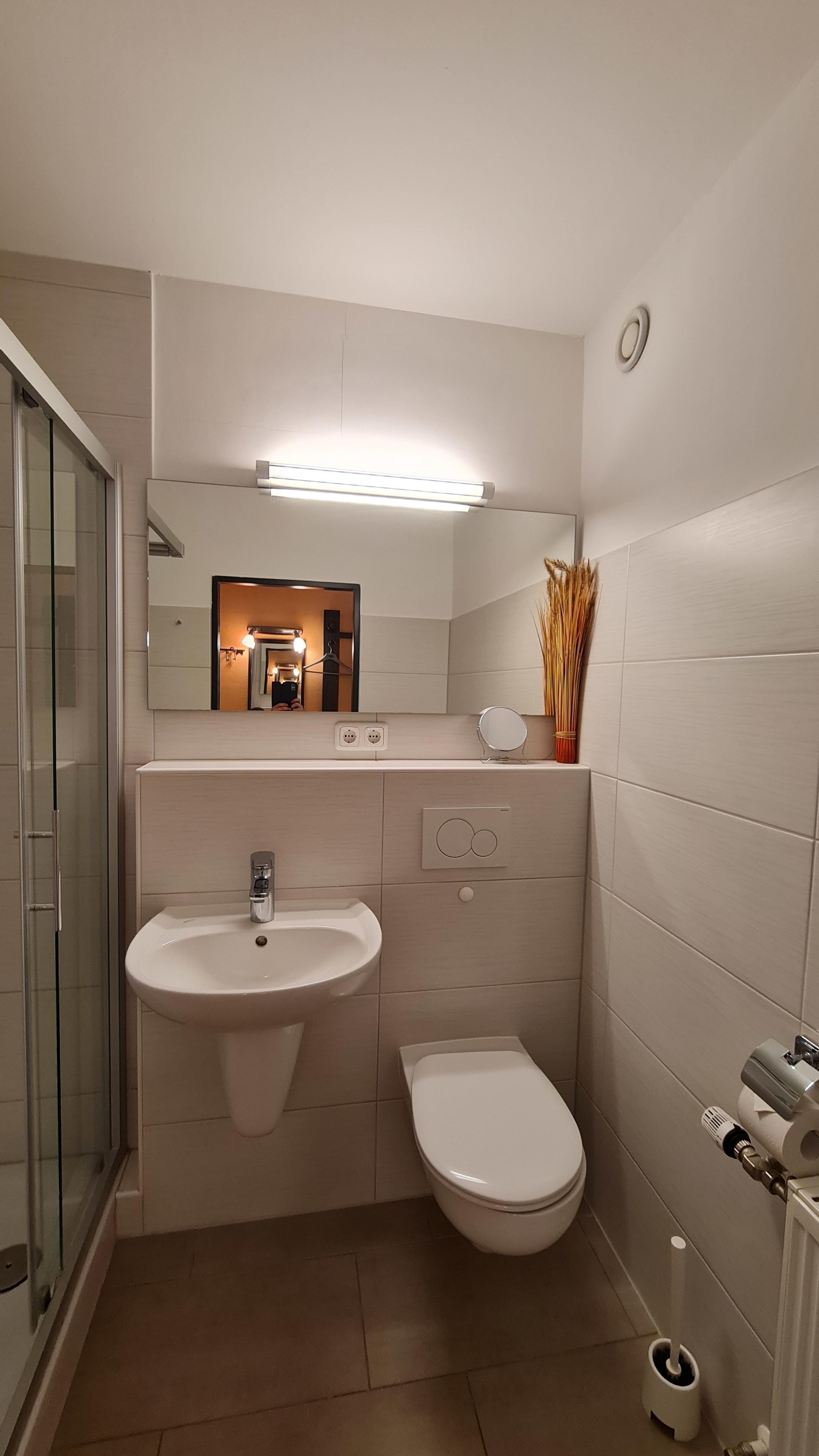 Das moderne Badezimmer ist mit Dusche und WC ausgestattet. Ein einladender Flur