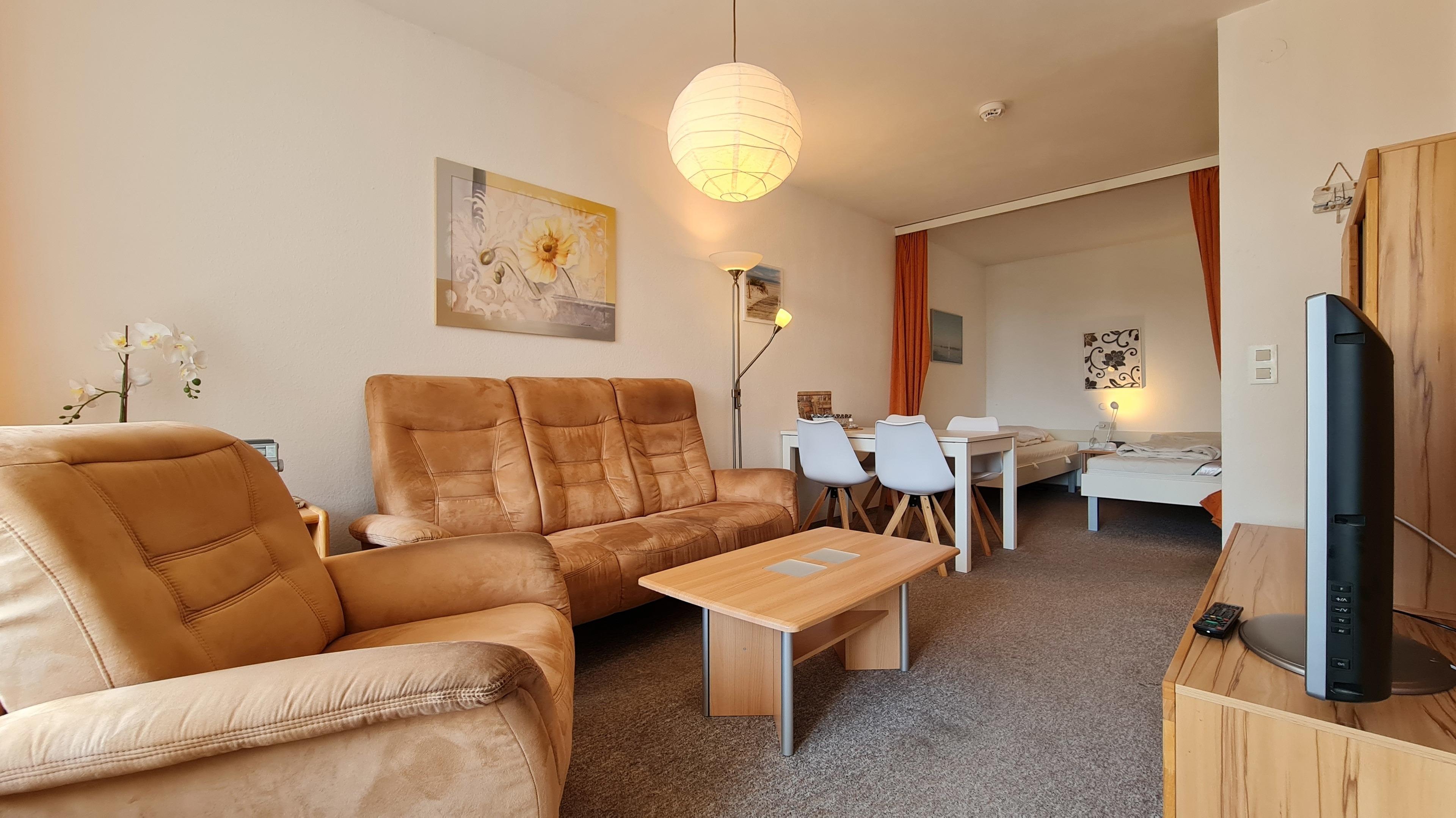 Im Wohnbereich erwartet Sie eine gemütliche Sofalandschaft mit einem bequemen 2-
