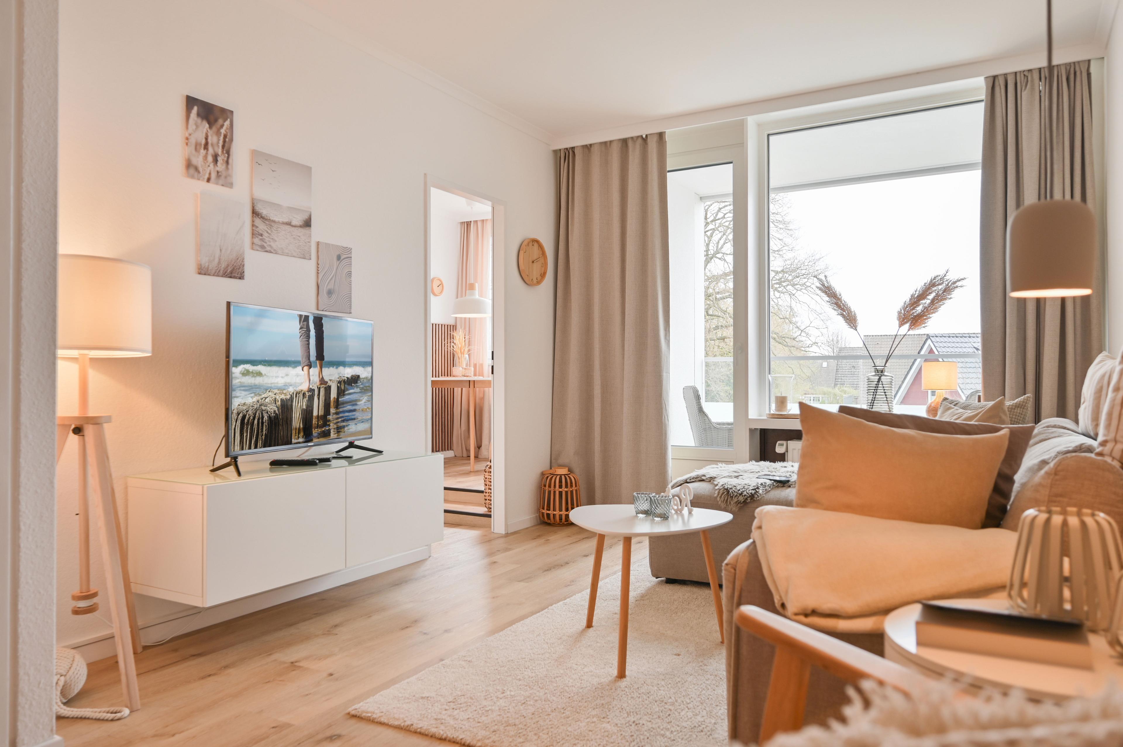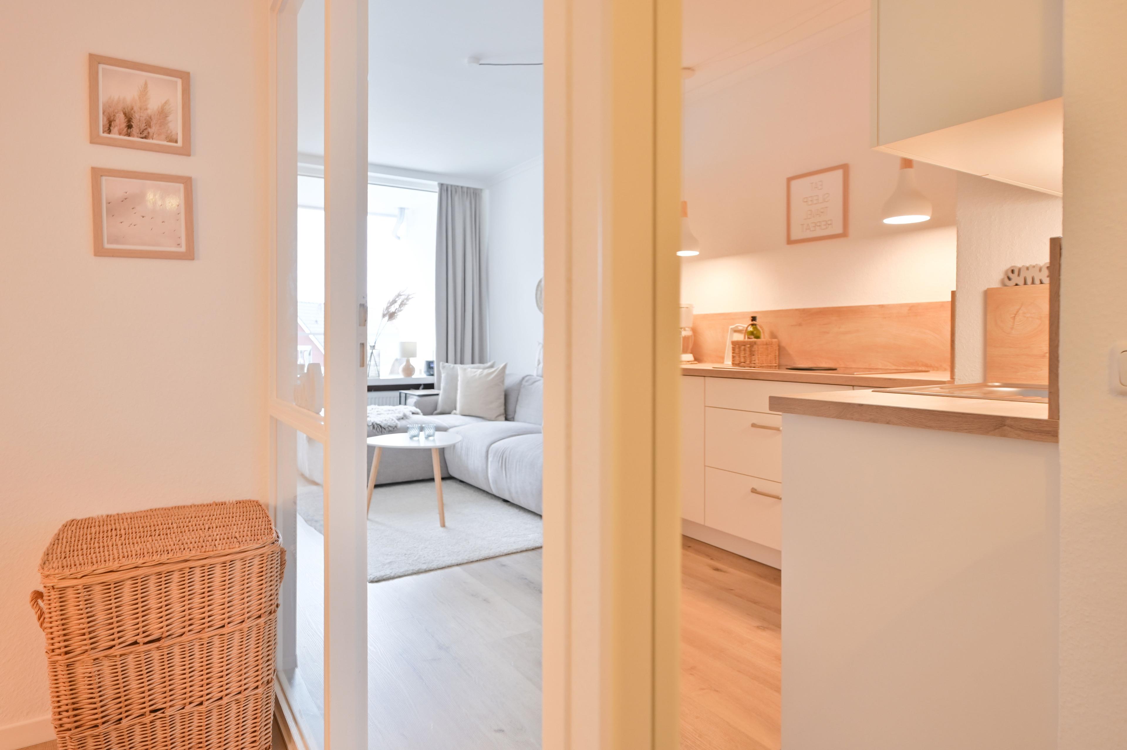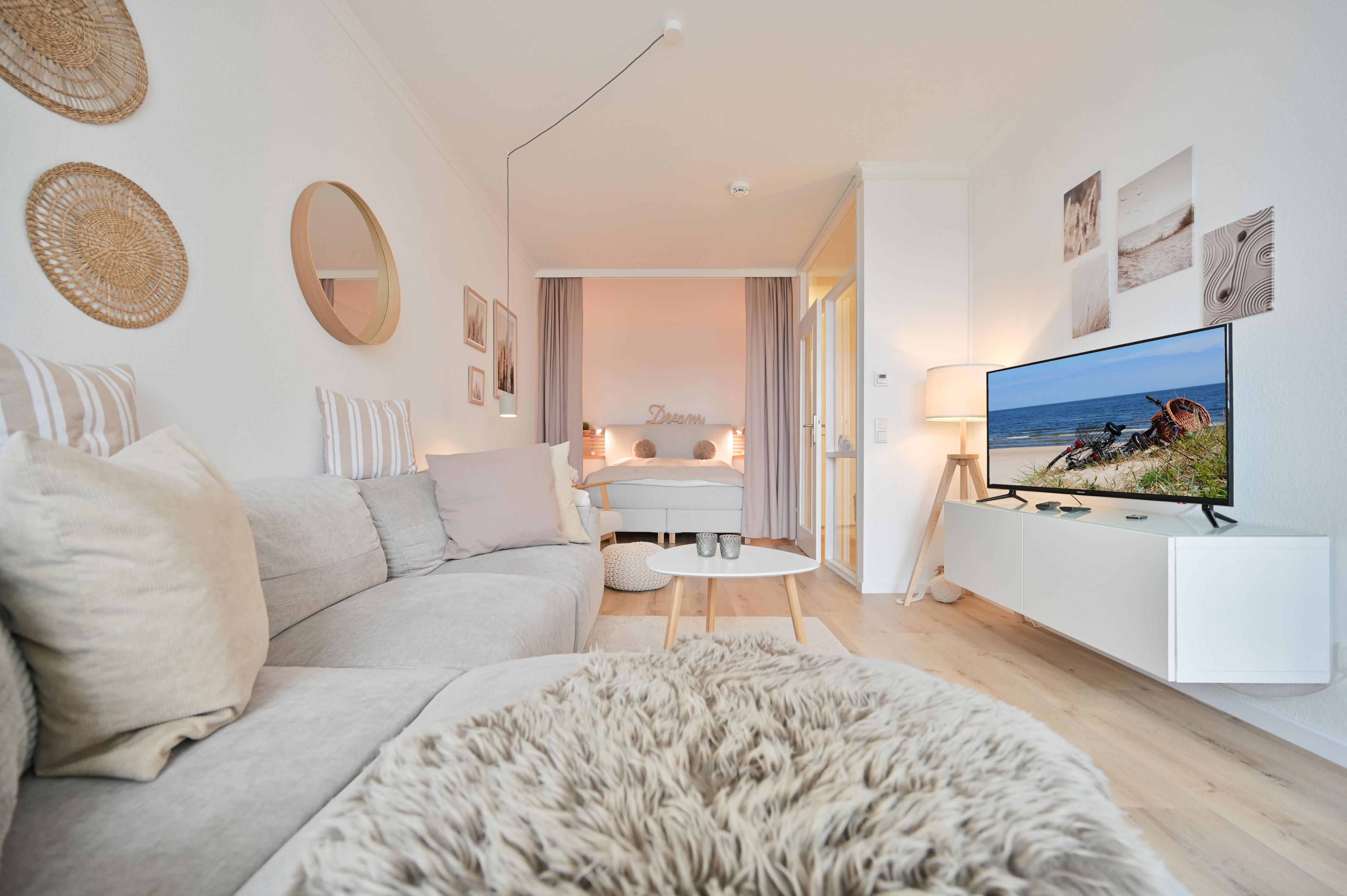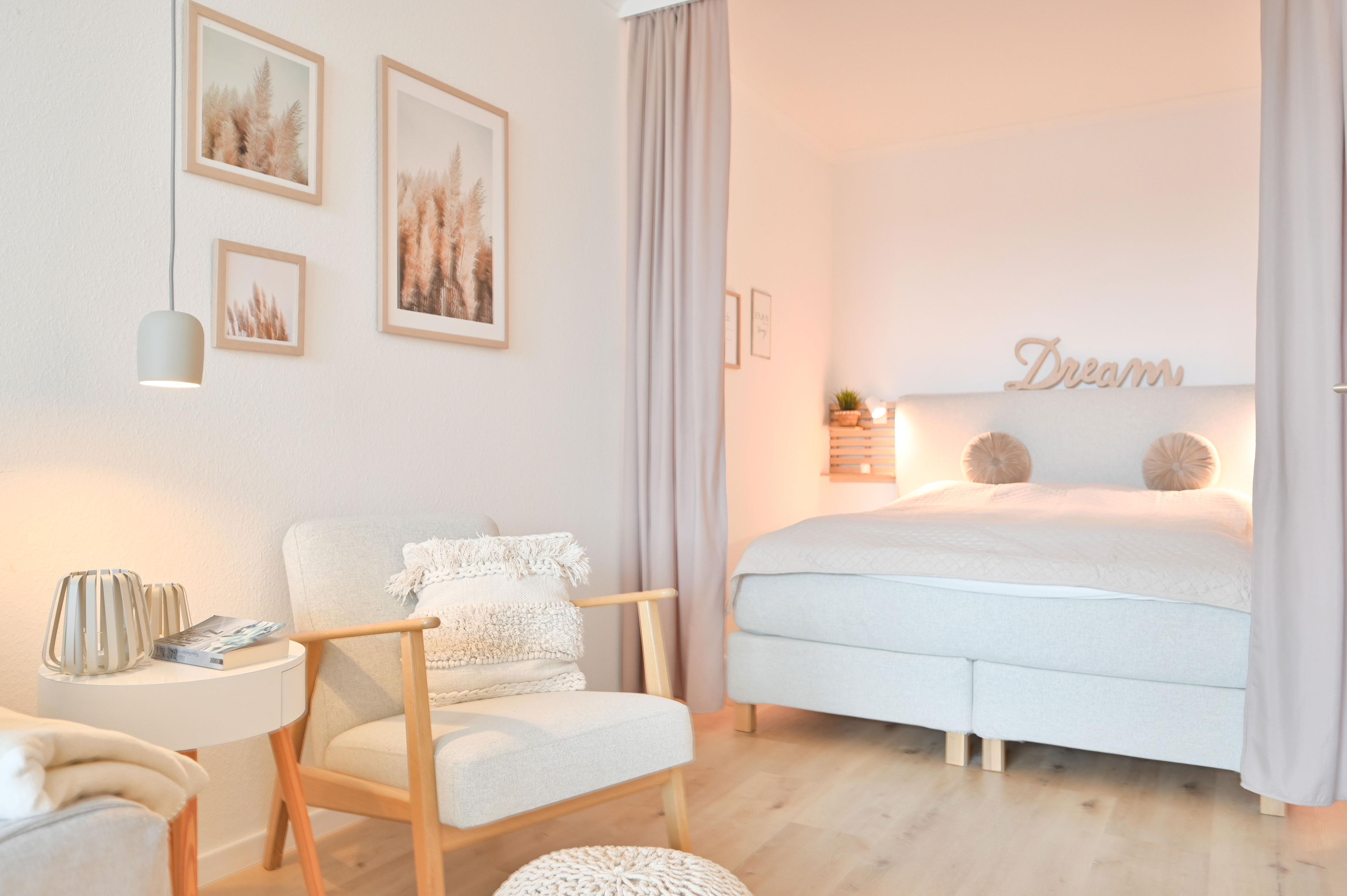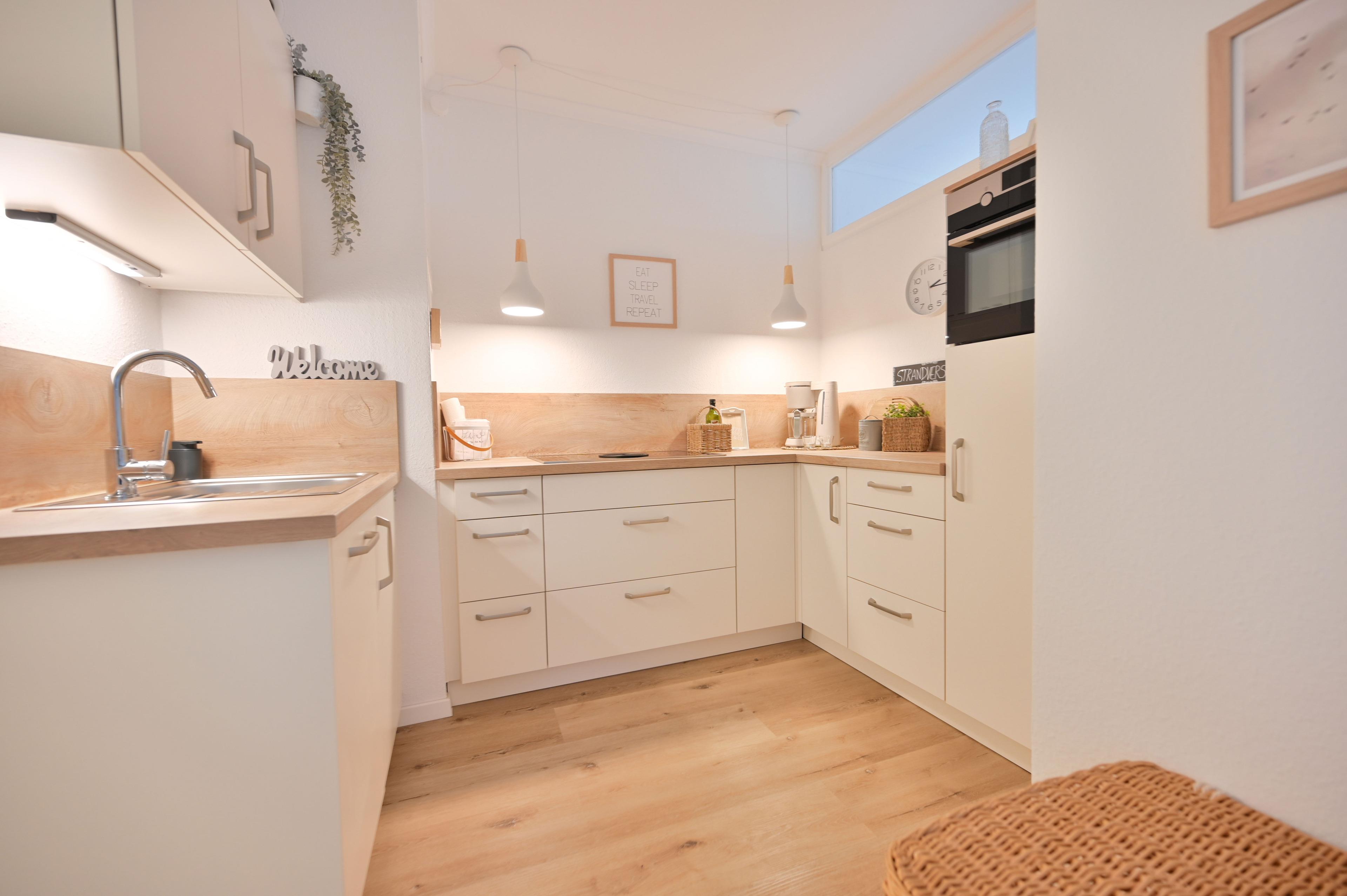 Mit einer toppneuen und modernen Ausstattung begrüßt Sie Ihre Ferienwohnung für die bevorstehenden Urlaubstage. Es erwartet Sie ein heller Wohn- & Schlafbereich, der modern und großzügig eingerichtet ist. Machen Sie es sich auf der Couch oder im Boxspringbett (160 cm) des optisch abgetrennten Schlafbereichs gemütlich. Die im Flur integrierte, geräumige neue Küche ist perfekt mit nahezu allen Annehmlichkeiten (Spülmaschine, Kühlschrank mit Gefrierfach von Liebherr, Induktionsherd mit BORA Dunstabzug, AEG Backofen mit Mikrowelle) ausgestattet und lädt zum Kochen ein- wenn Sie möchten. Das tolle neue Bad ist mit einer geräumiger Walk-in-Dusche (150 cm) mit großer Glasabtrennung inkl. Tür, einem Waschtisch, Handtuchheizkörper, WC und beleuchtetem Spiegel ausgestattet. Des Weiteren verfügt die Wohnung über ein kleines Esszimmer mit rundem Tisch, der erhöht auf einem Podest am Fenster steht. In diesem Raum stehen auch die Kleiderschränke für Sie zur Verfügung. WLAN steht zur Verfügung.