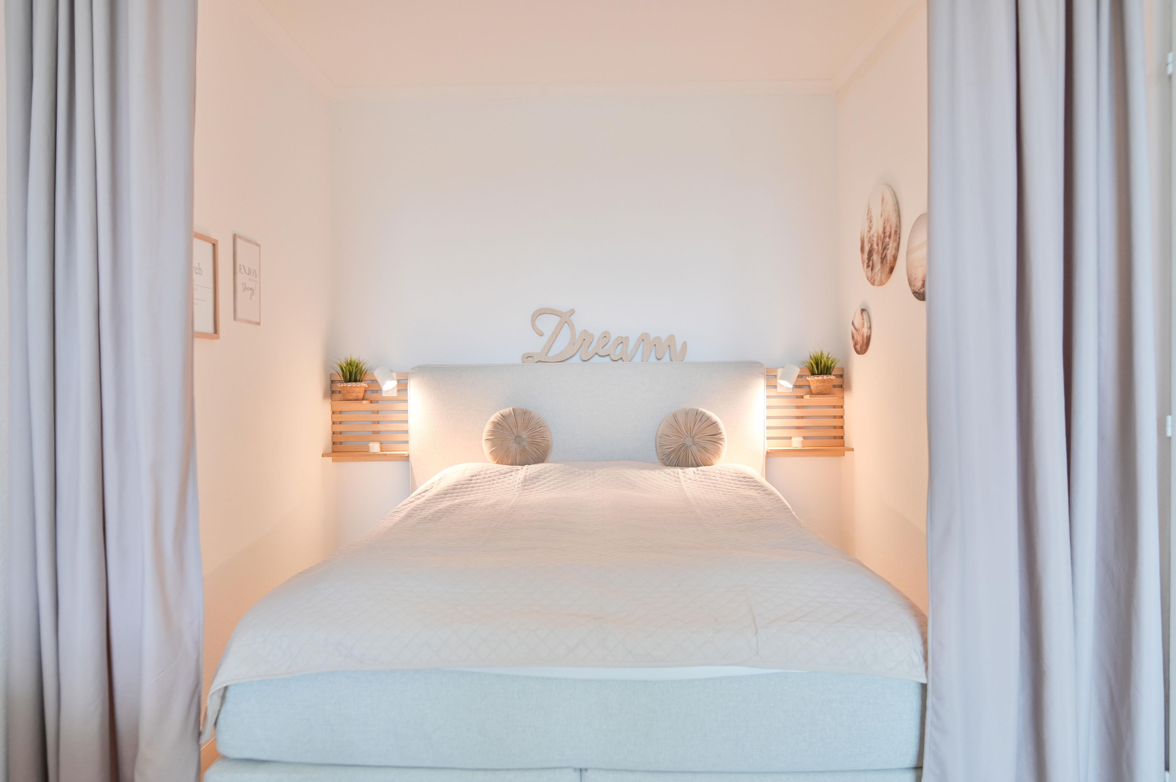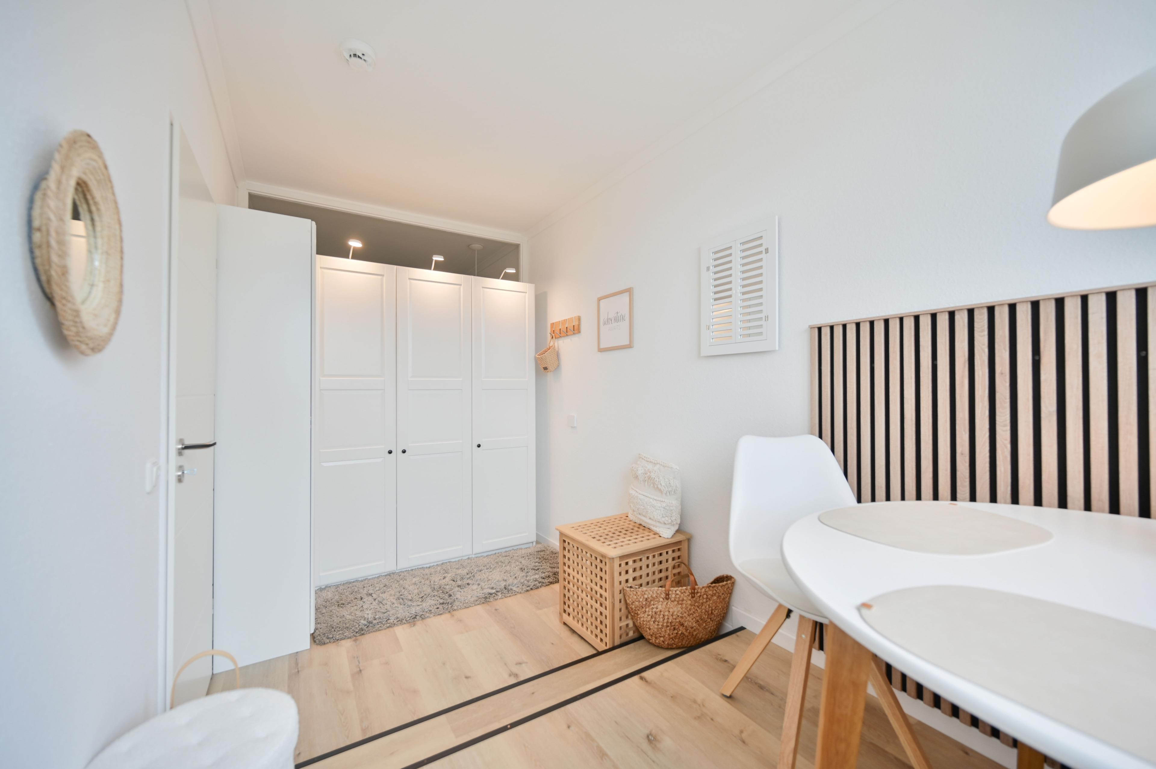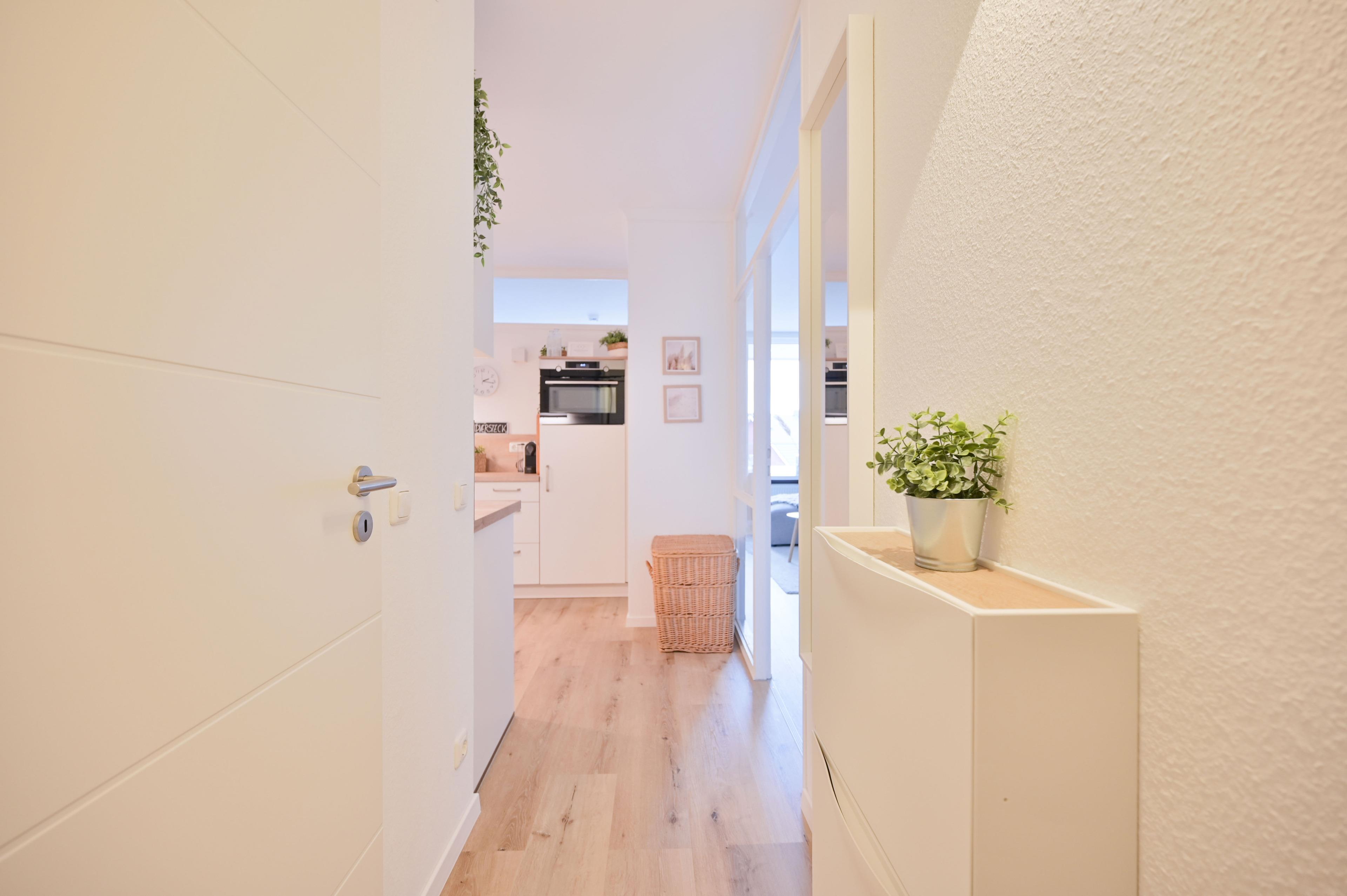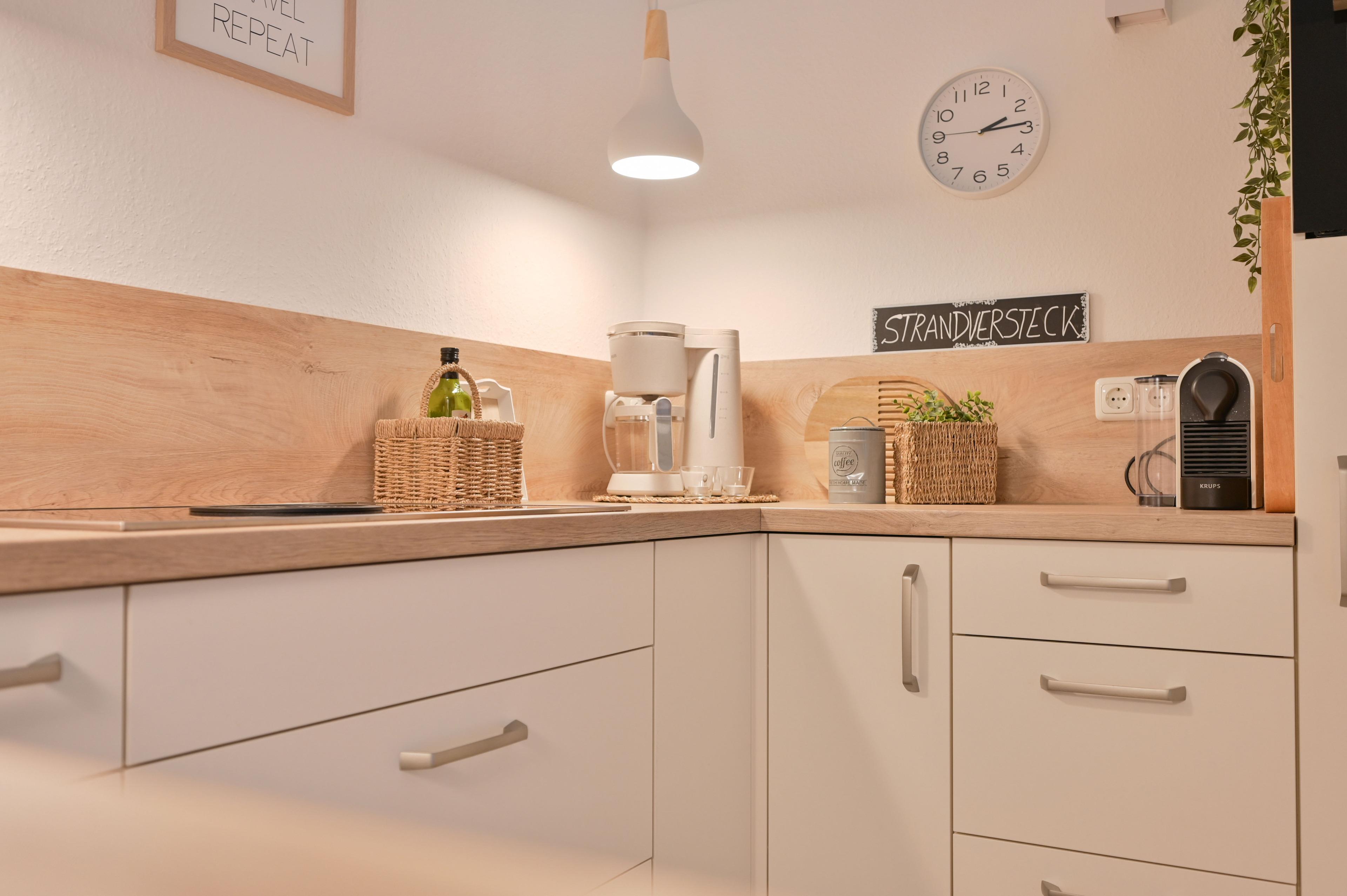 Mit einer toppneuen und modernen Ausstattung begrüßt Sie Ihre Ferienwohnung für die bevorstehenden Urlaubstage. Es erwartet Sie ein heller Wohn- & Schlafbereich, der modern und großzügig eingerichtet ist. Machen Sie es sich auf der Couch oder im Boxspringbett (160 cm) des optisch abgetrennten Schlafbereichs gemütlich. Die im Flur integrierte, geräumige neue Küche ist perfekt mit nahezu allen Annehmlichkeiten (Spülmaschine, Kühlschrank mit Gefrierfach von Liebherr, Induktionsherd mit BORA Dunstabzug, AEG Backofen mit Mikrowelle) ausgestattet und lädt zum Kochen ein- wenn Sie möchten. Das tolle neue Bad ist mit einer geräumiger Walk-in-Dusche (150 cm) mit großer Glasabtrennung inkl. Tür, einem Waschtisch, Handtuchheizkörper, WC und beleuchtetem Spiegel ausgestattet. Des Weiteren verfügt die Wohnung über ein kleines Esszimmer mit rundem Tisch, der erhöht auf einem Podest am Fenster steht. In diesem Raum stehen auch die Kleiderschränke für Sie zur Verfügung. WLAN steht zur Verfügung.