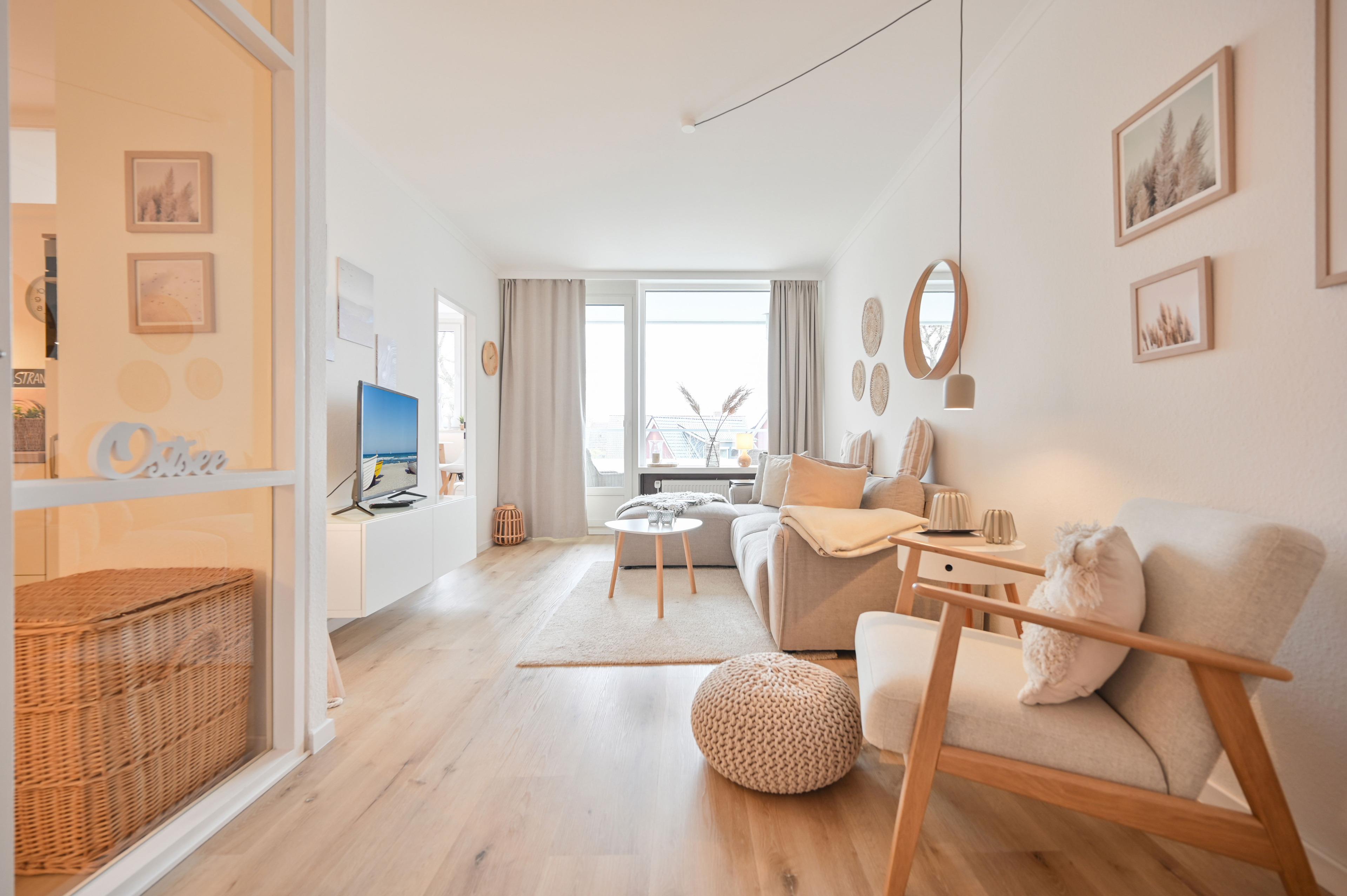 Verbringen Sie Ihren nächsten Urlaub in Kellenhusen in der Wohnanlage Strandappartements am Leuchtturmweg: Komplett neu renovierte strandnahe 1,5-Zimmer-Ferienwohnung im 2. Stock mit Loggia und einer Wohnfläche von ca. 43 m² für 2 Personen.