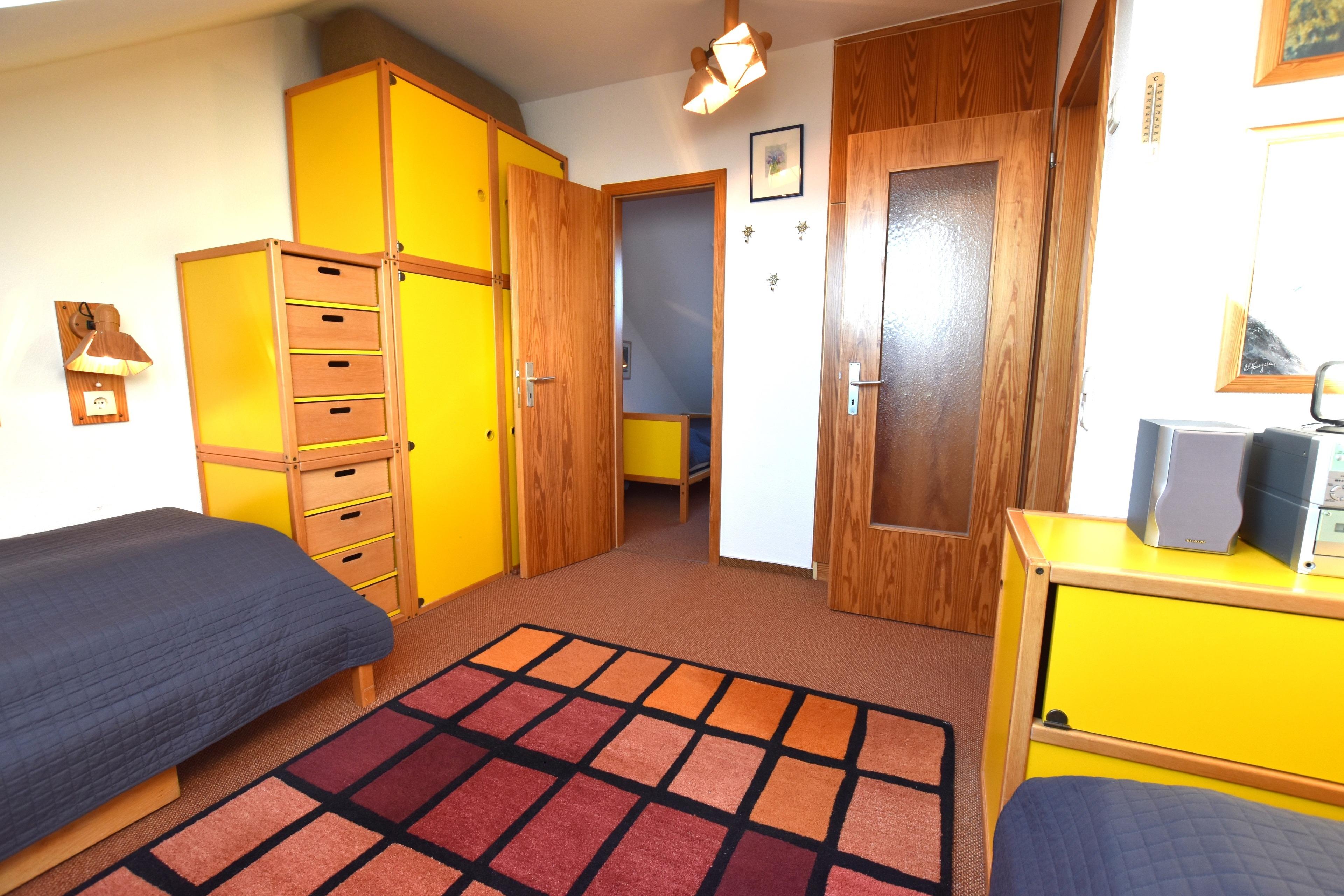 Auf derselben Etage befinden sich die platzsparende Küche mit Induktionsherd und Geschirrspüler sowie das zweckmäßige Duschbad. Zum Schlafen geht es innerhalb der Wohnung mit einer Treppe ins Dachgeschoss. Hier stehen Ihnen zwei separate Schlafzimmer zur Verfügung. Beide verfügen jeweils über 2 getrennt stehenden Betten (je 90x200 cm) und einem TV-Gerät. Hier kann man wunderbar von den Urlaubserlebnissen des Tages träumen.
