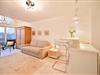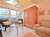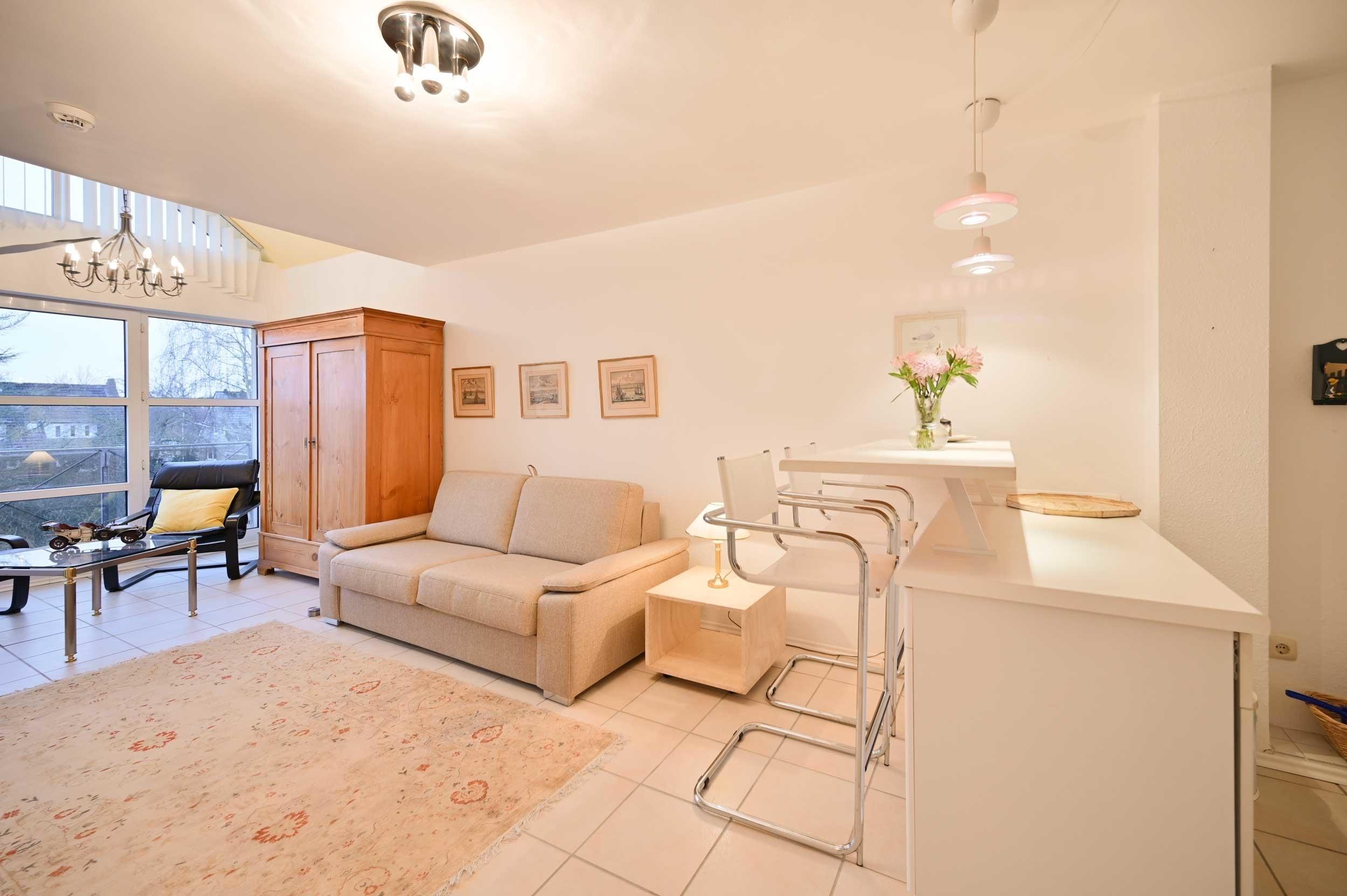 Der helle Wohnbereich ist mit zwei gemütlichen Lesesesseln, Couchtisch, Schlafsofa für zwei Schlafgelegenheiten (1,60m) zu. Kleiderschrank, TV Möbel mit Flachbild-TV und einer integrierten Küchenzeile mit Speisetresen eingerichtet.