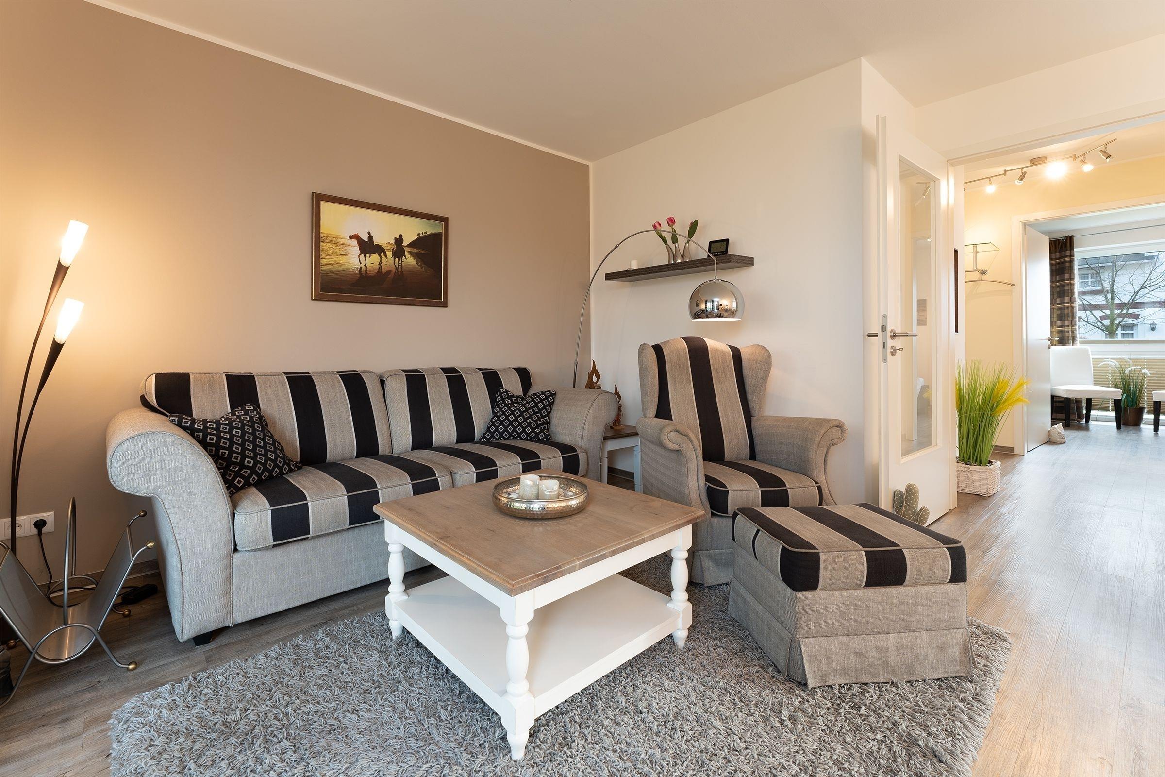 Diese modern ausgestattete Ferienwohnung im Erdgeschoss der gepflegten Anlage Strandhäuser bietet mit einer Wohnfläche von ca. 75 qm, 2 Schlafzimmern und Terrasse ausreichend Platz und Komfort für bis zu 4 Personen plus Baby.