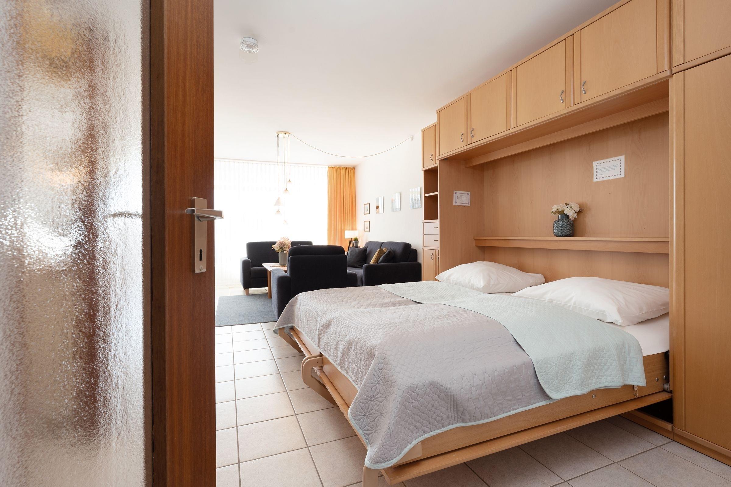 Wohnzimmer: 1 Schrankwand-Doppelbett (ca. 180 x200 cm), TV, Kleiderschrank, Verdunkelungsmöglichkeit