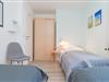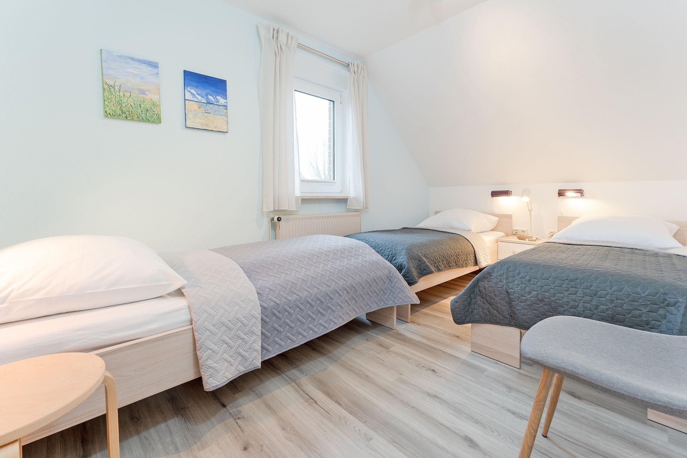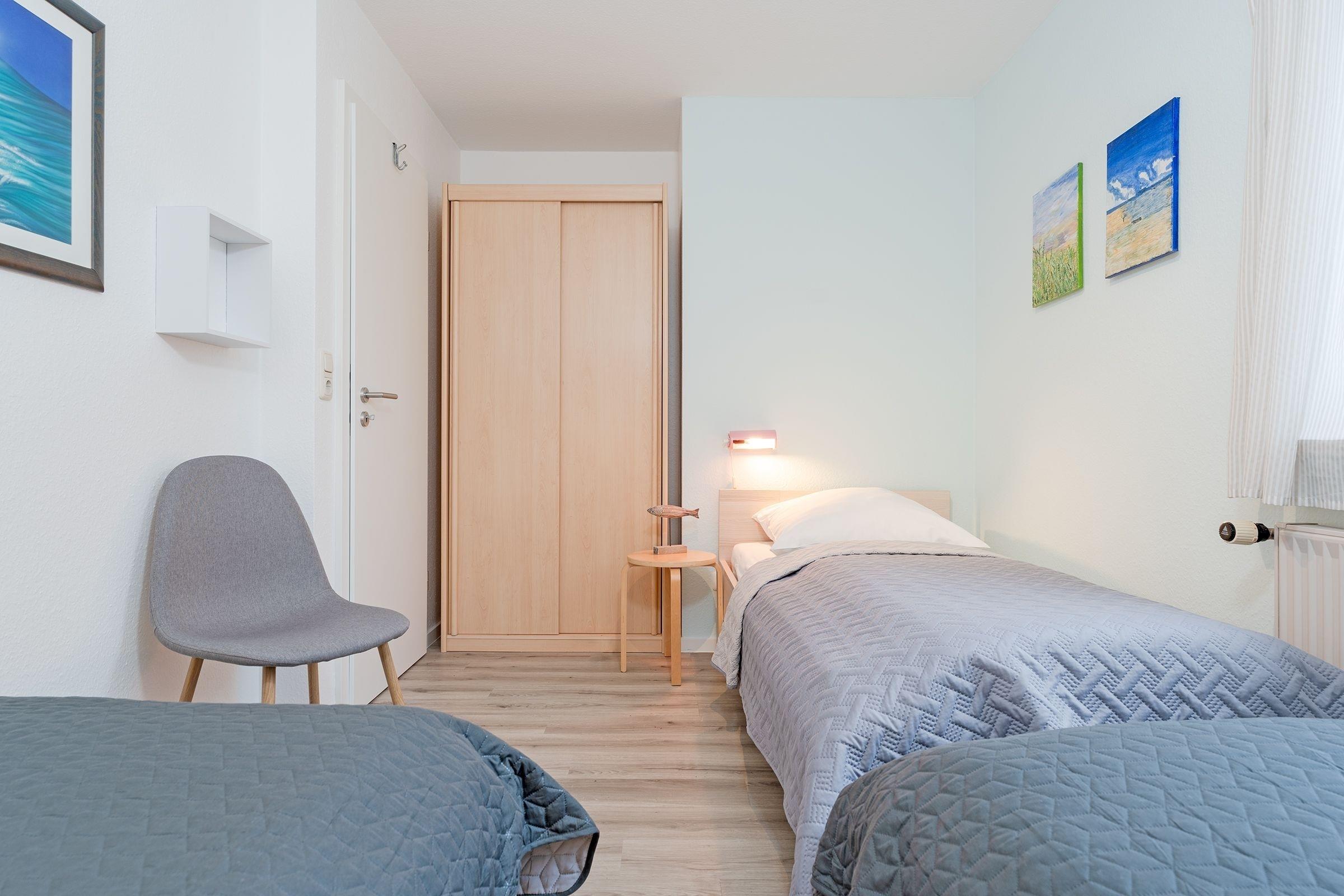 Schlafzimmer 2: 3 Einzelbetten (3x 90x200 cm), Kleiderschrank, Verdunkelung (Außenrollläden), Insektenschutz am Fenster.