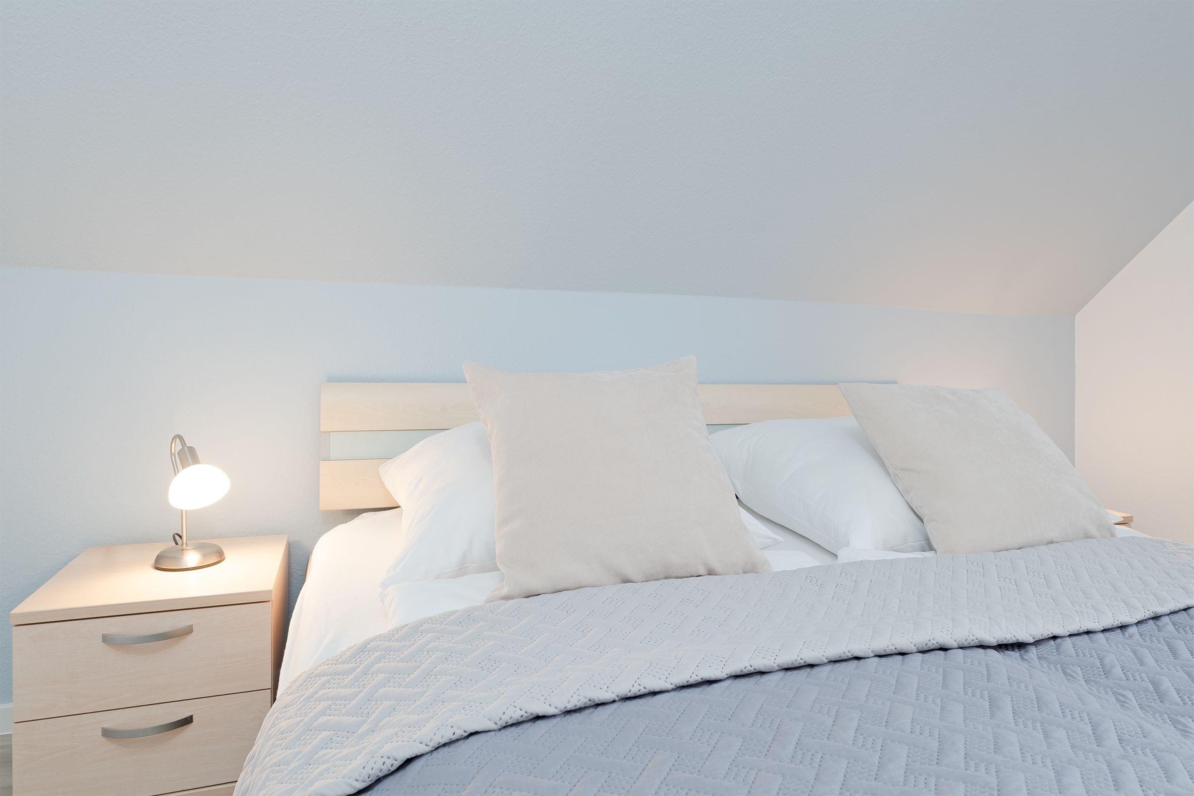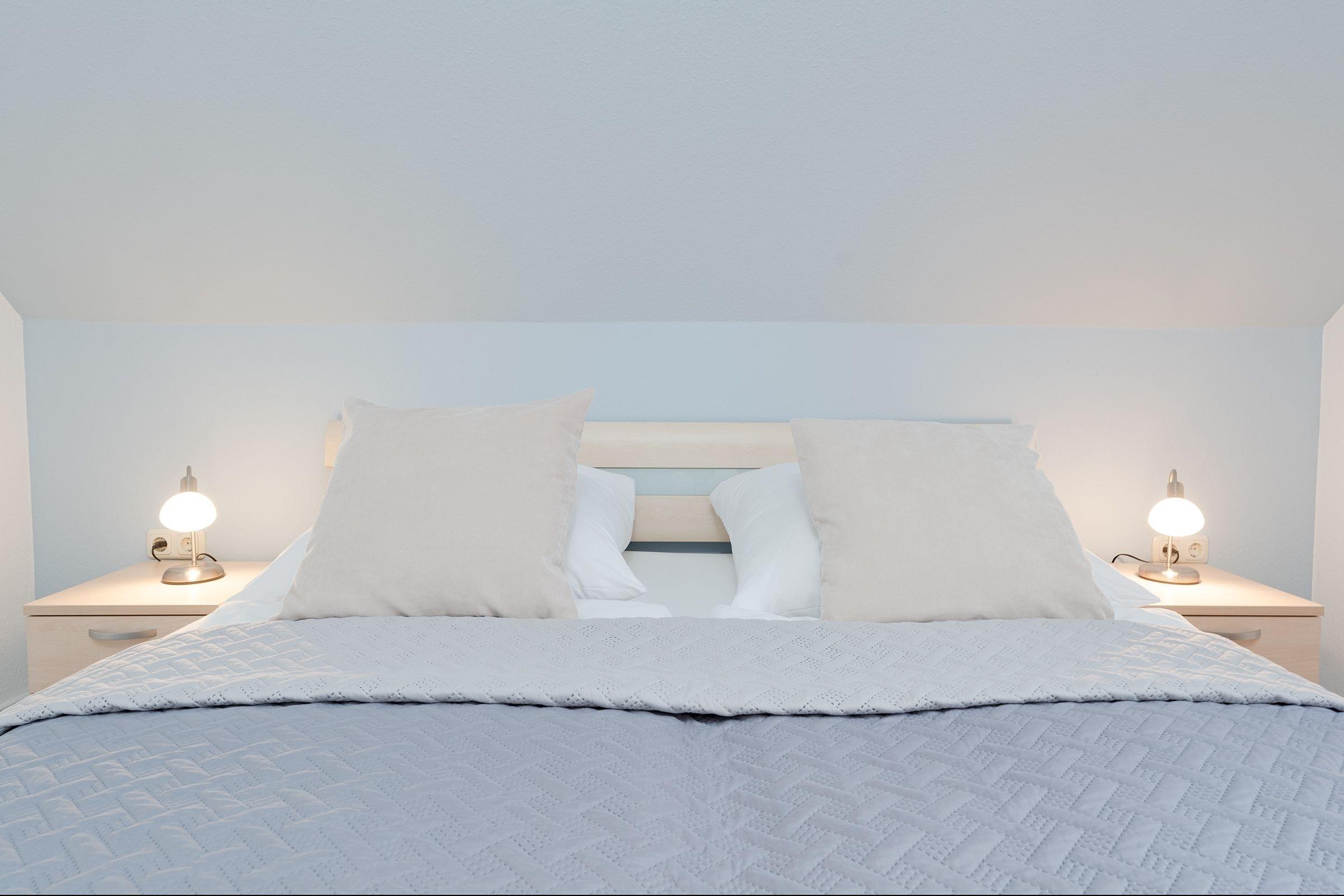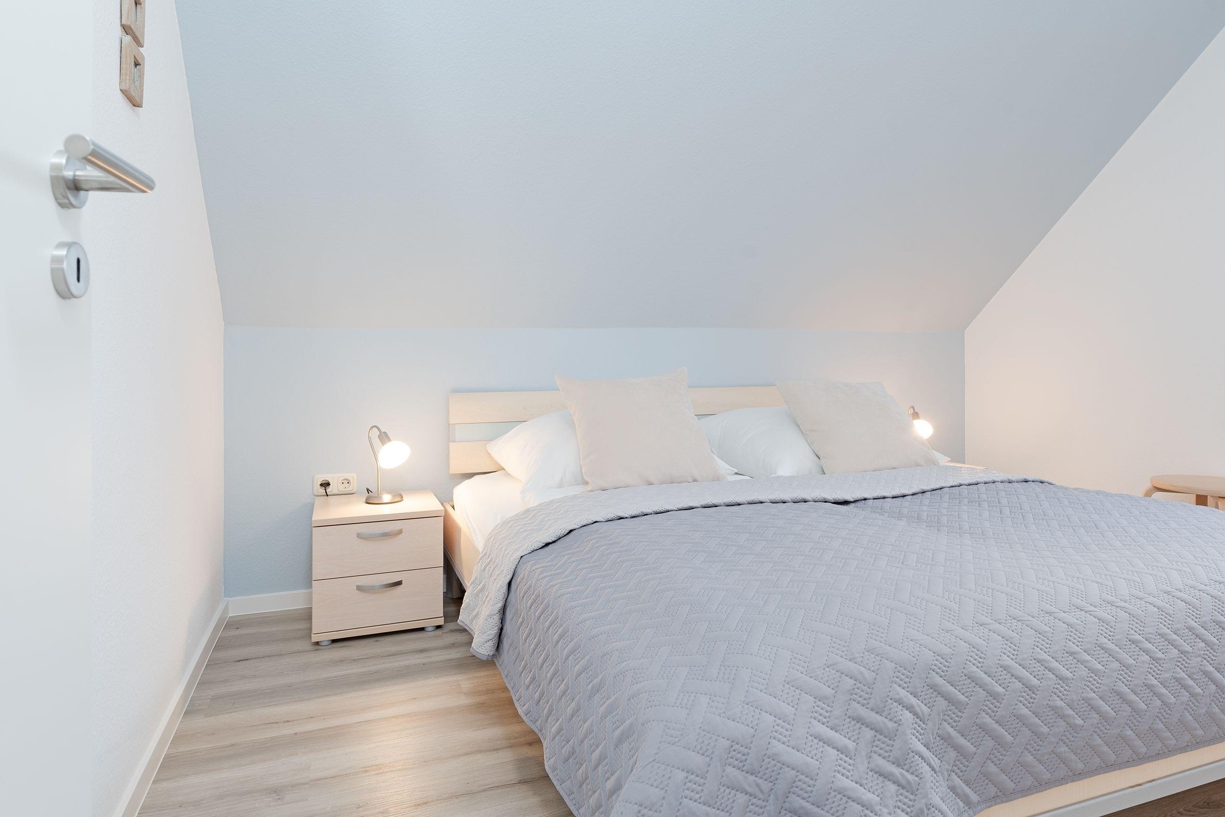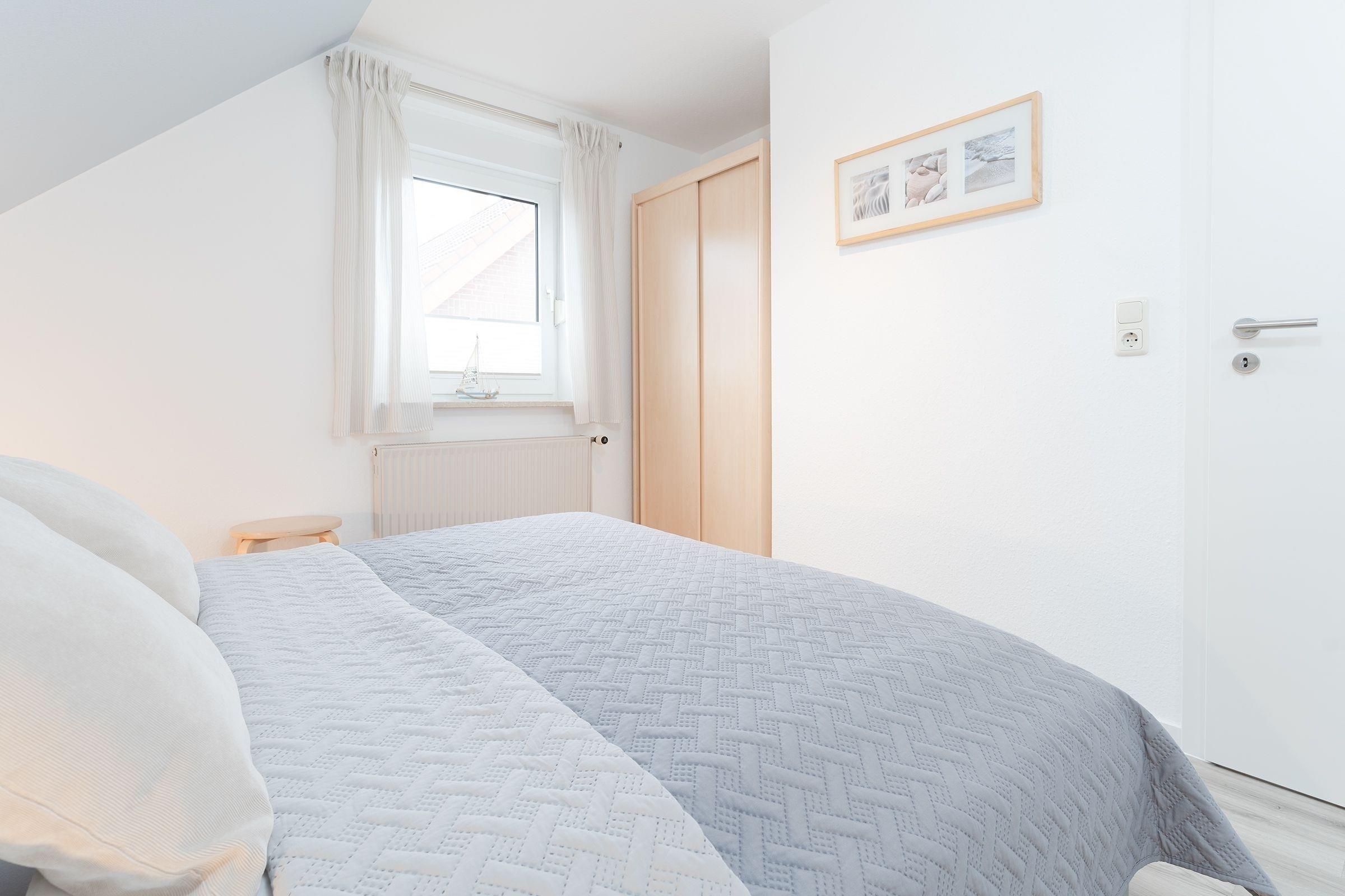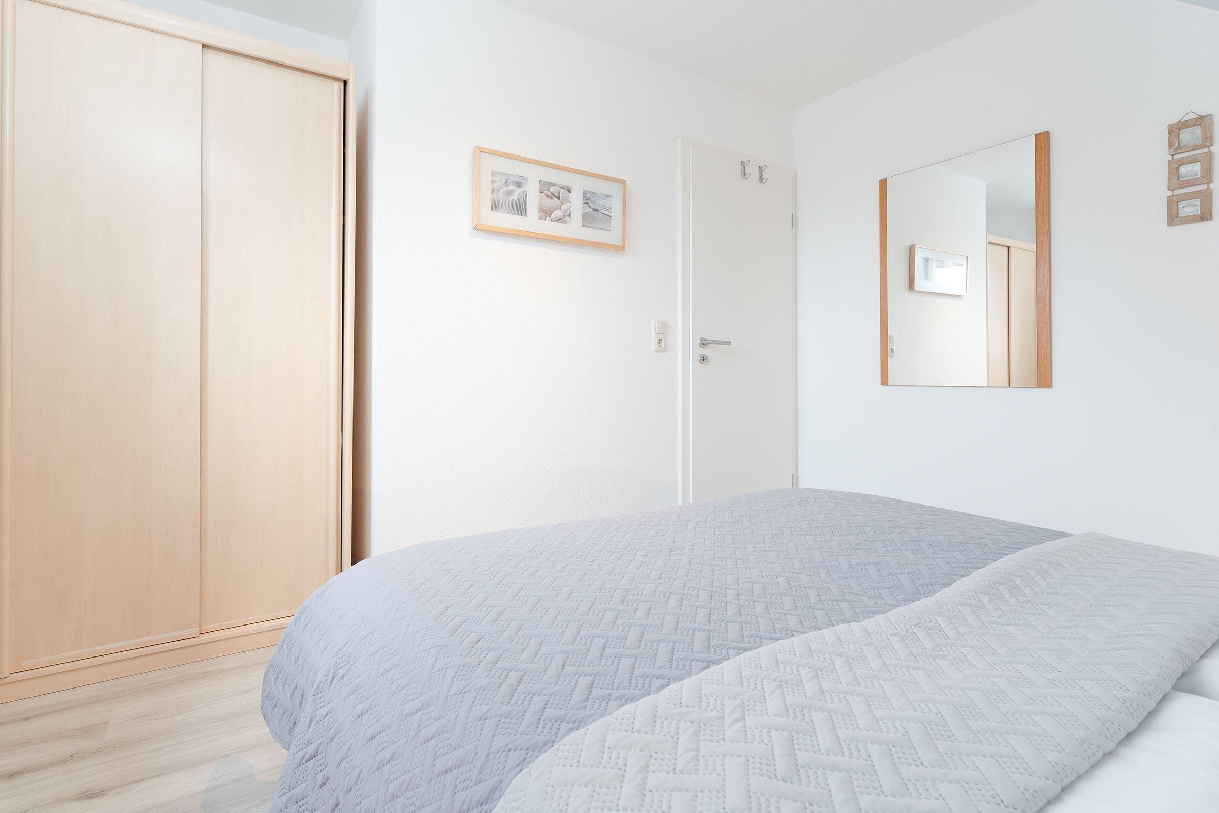 Schlafzimmer 1: 1 Doppelbett (2x 90x200 cm), Kleiderschrank, Verdunkelung (Außenrollläden), Insektenschutz am Fenster.