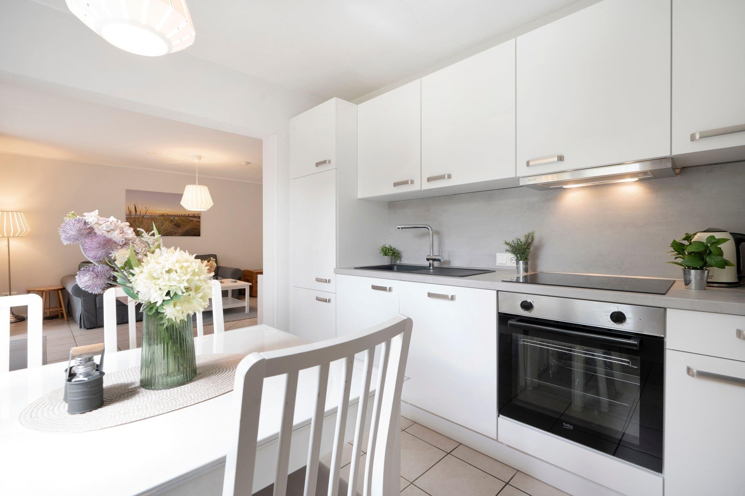 In Ihrem Zuhause auf Zeit werden Sie sich auf Anhieb wohlfühlen: Die hochwertige, moderne Ausstattung verspricht Urlaub mit Niveau. In der bequemen Sofalandschaft mit großem Flachbildschirm können Sie gemütlich entspannen. Von hier aus kommen Sie direkt auf die große Terrasse – eine schöne Sitzecke, ein Strandkorb sowie ein Elektrogrill stehen hier für Sie bereit. Lassen Sie Ihren Alltag hinter sich und genießen Sie die Urlaubssonne. Ein Sichtschutz sichert die nötige Privatsphäre. Die Küche ist offen gestaltet und bietet vom Induktionsherd über eine Nespresso-Maschine bis hin zur Mikrowelle und Spülmaschine alle Annehmlichkeiten, die man sich im Urlaub wünschen kann. Für geruhsame Nächte stehen Ihnen zwei separate Schlafzimmer zur Verfügung, in denen sich jeweils ein Doppelbett (2x 90x200 cm) befindet. Hier lässt es sich wunderbar träumen. Eins der Schlafzimmer verfügt zudem über ein TV-Gerät. Gemütlich abgedunkelt werden die Zimmer jeweils mit Gardienen. Das Duschbad ist schick, freundlich und modern eingerichtet.