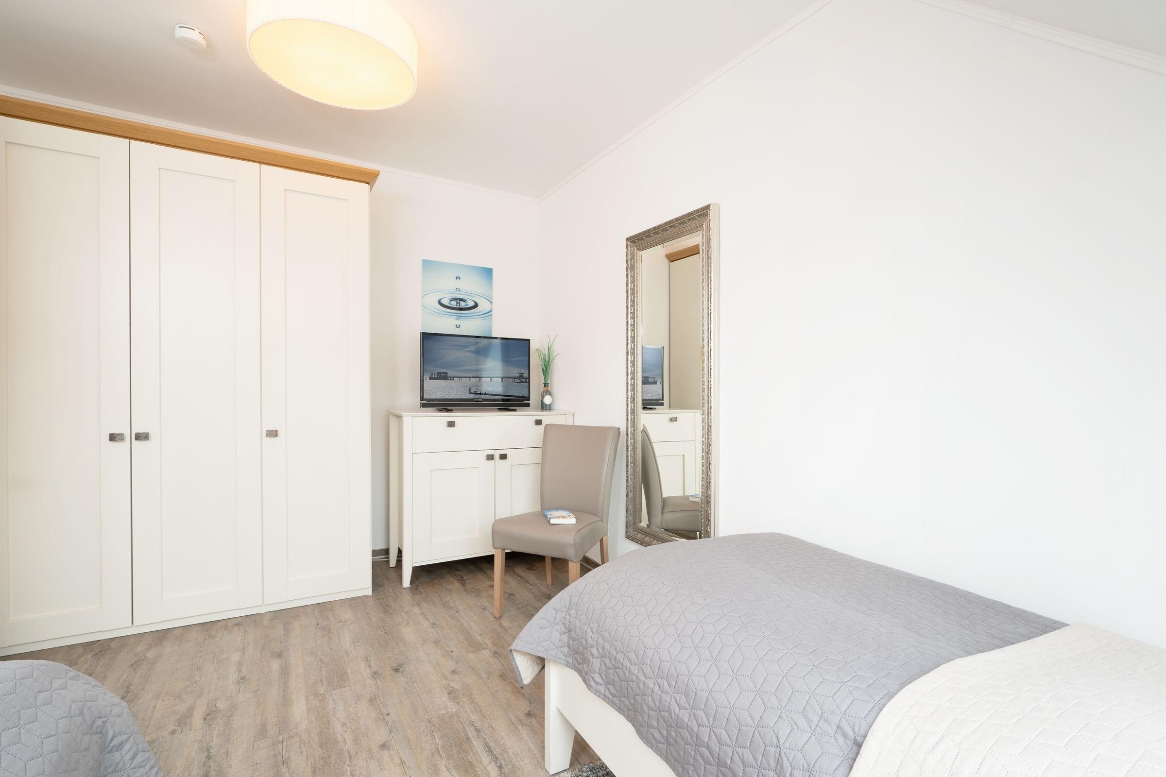 Schlafzimmer 2: 2 Einzelbetten (2x 90x200 cm), Kleiderschrank, TV, Verdunkelung (Rollos)