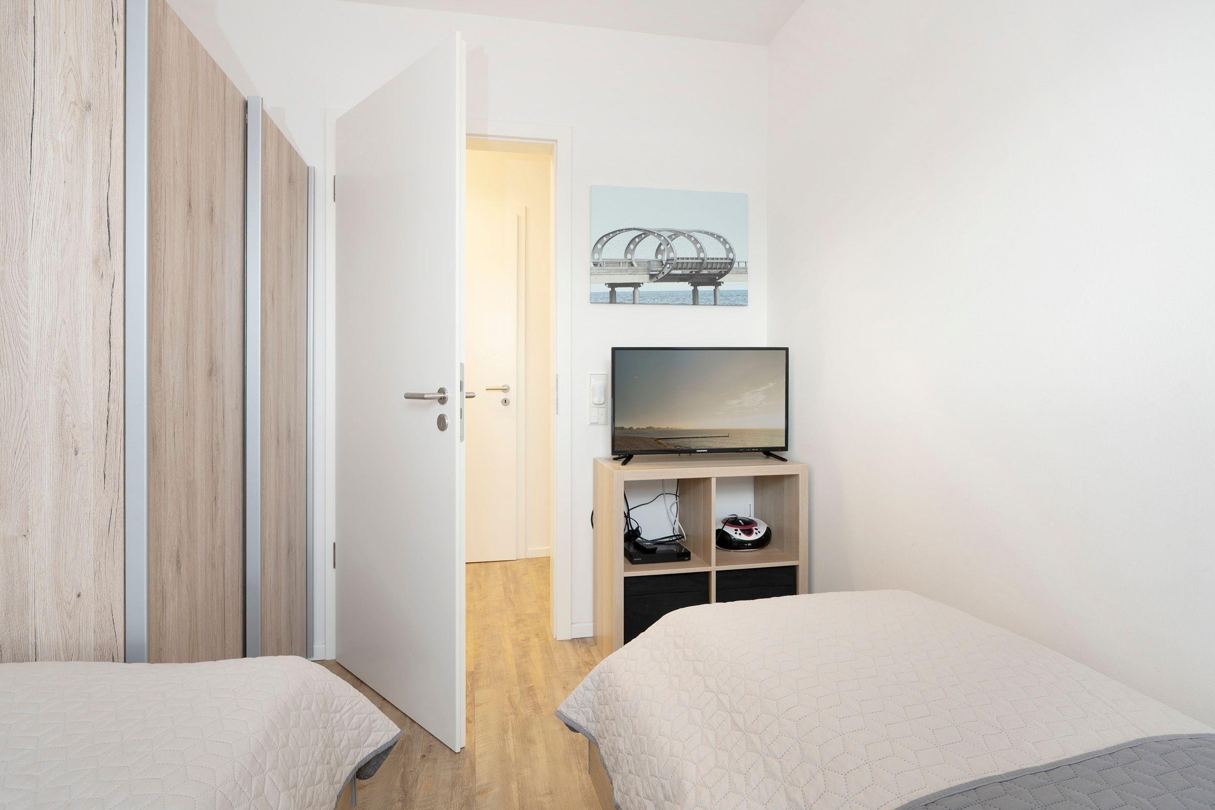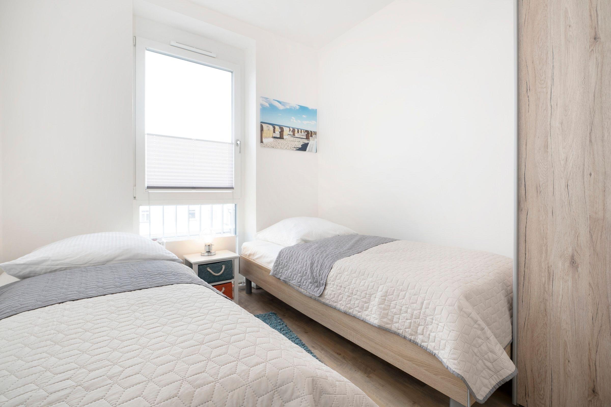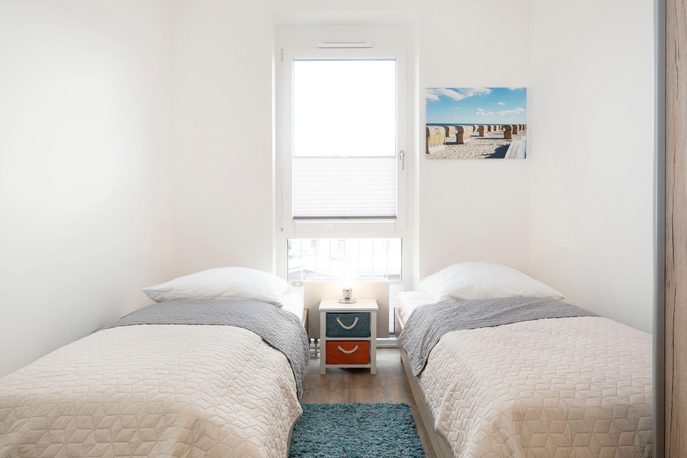 Schlafzimmer: 2 Einzelbetten (2x 90x200 cm) ,TV, DVD-Player, Außenrollläden.