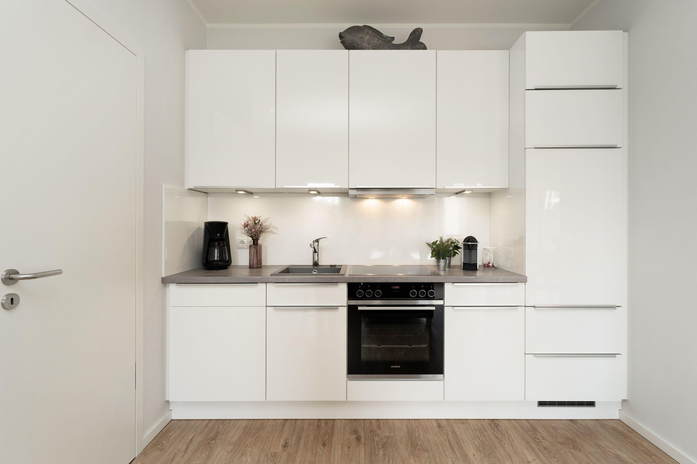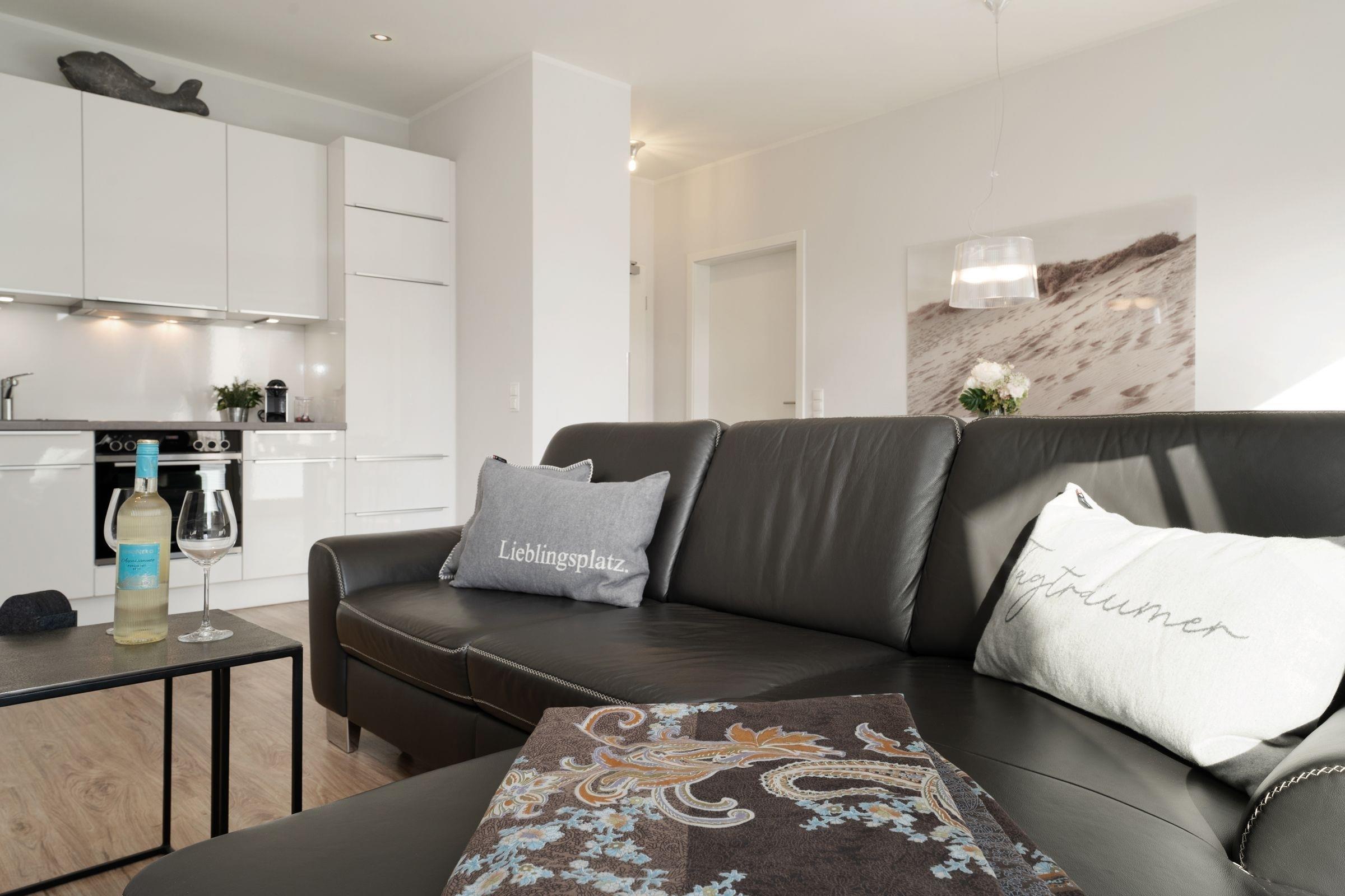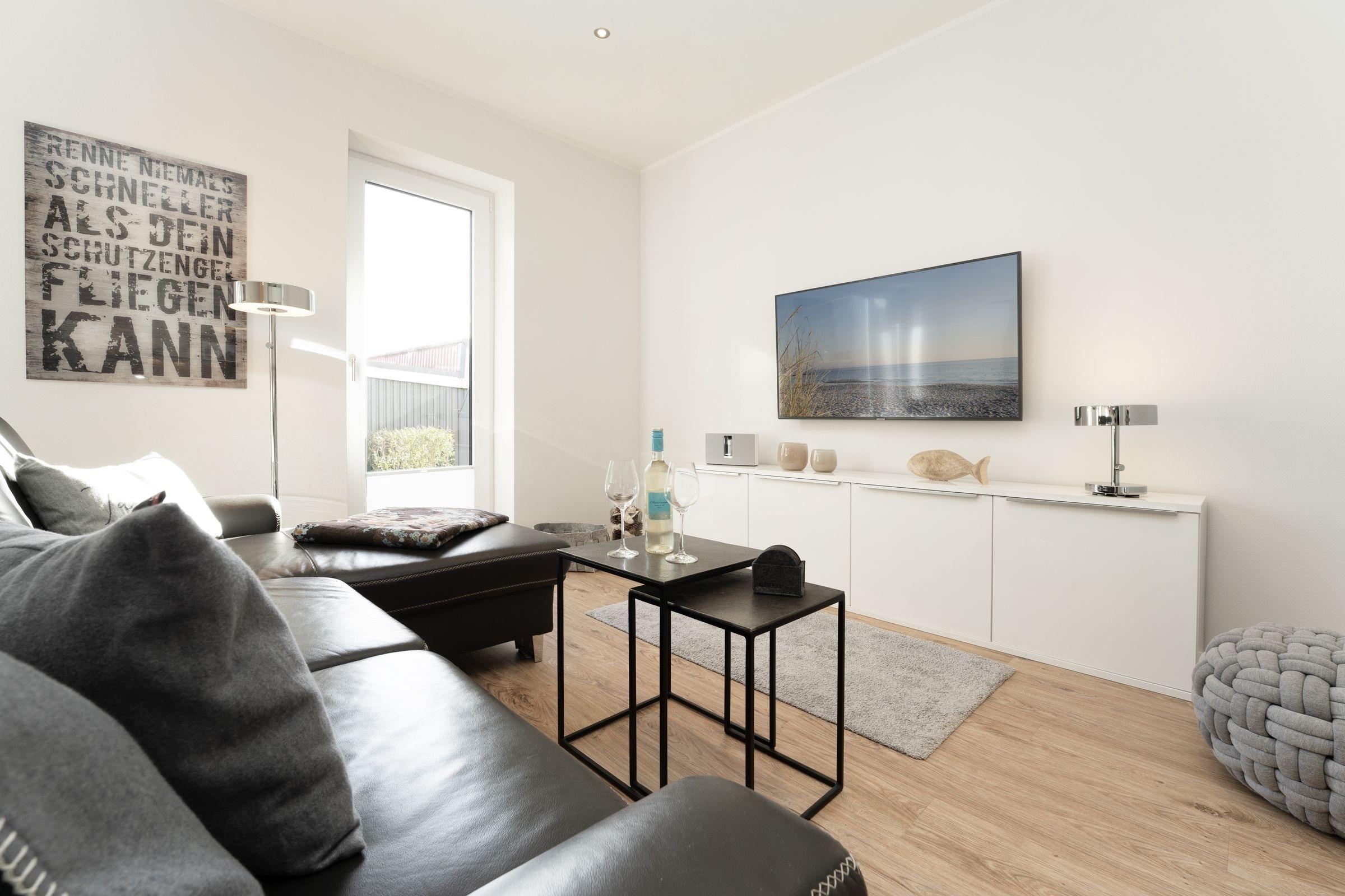 Hell, freundlich und mit bodentiefen Fenstern begrüßt Sie diese moderne, barrierearme Wohnung. Die Einrichtung ist liebevoll ausgesucht und verspricht Wohlfühl-Garantie. In dem großzügigen Wohn- und Essbereich sorgt ein Smart-TV für gute Unterhaltung. Verbringen Sie auf der bequemen Couch Ihre Abende bei einem Glas Wein. Bei gutem Wetter geht es natürlich raus auf die möblierte Terrasse. Genießen Sie hier Ihre Urlaubszeit oder planen Sie Ihre Ausflüge entlang der Ostseeküste. Die offene Küche ist hochwertig ausgestattet und bringt Hobby-Köche zum Lächeln. Nach dem Kochen und Schmausen übernimmt ein Geschirrspüler den Abwasch. Das Schlafzimmer ist mit einem Boxspringbett (180x200 cm) und einem weiteren TV-Gerät möbliert. Das großzügige Bad mit bodengleicher Dusche und Sauna sorgt auch an kälteren Tagen für Wärme und Entspannung. Die gesamte Wohnung verfügt über eine Fußbodenheizung. Im Abstellraum finden Sie einen Waschtrockner.