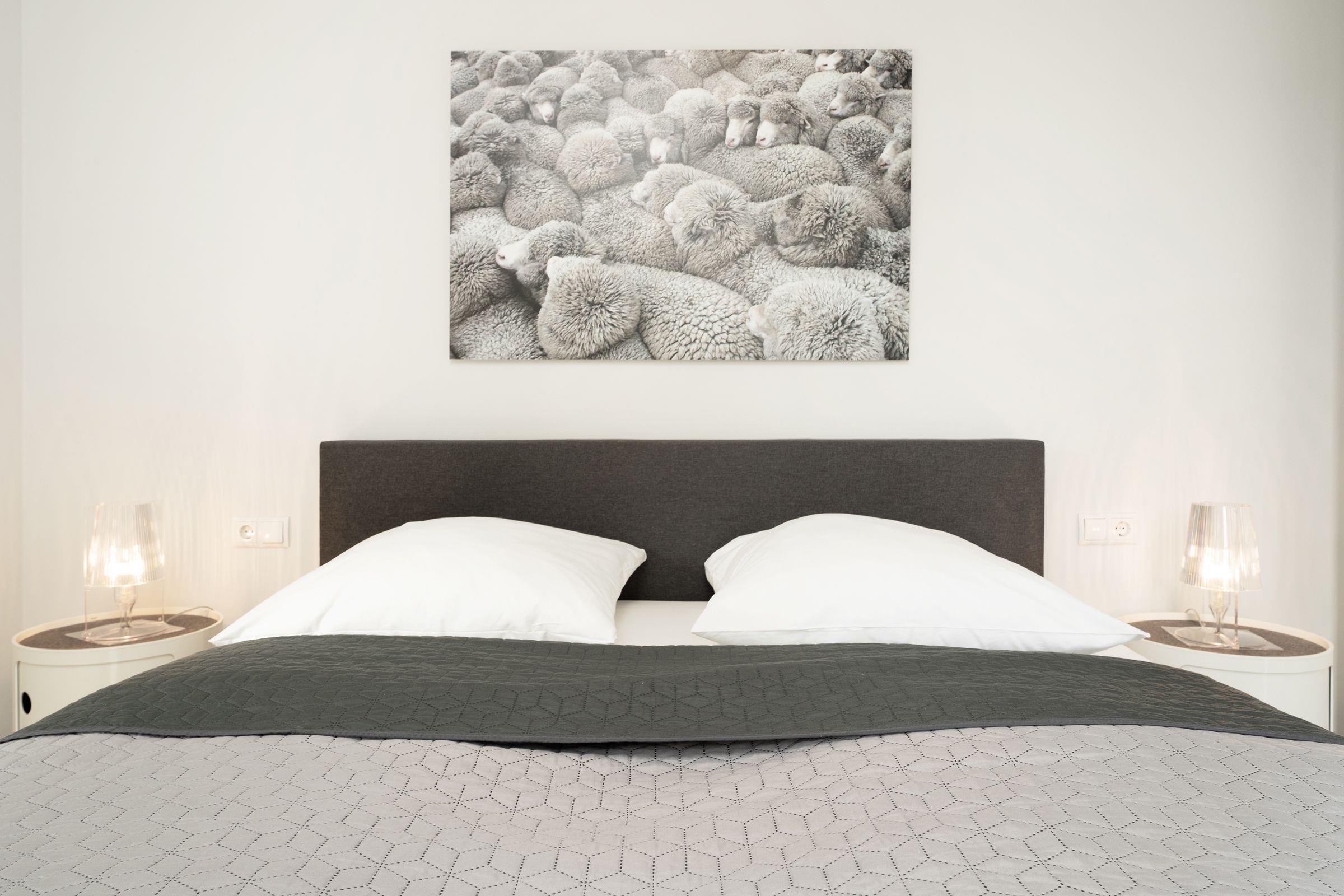 Schlafzimmer: Boxspringbett (ca. 180x200 cm), TV, Kleiderschrank, Verdunkelung (Verdunkelungsgardinen)