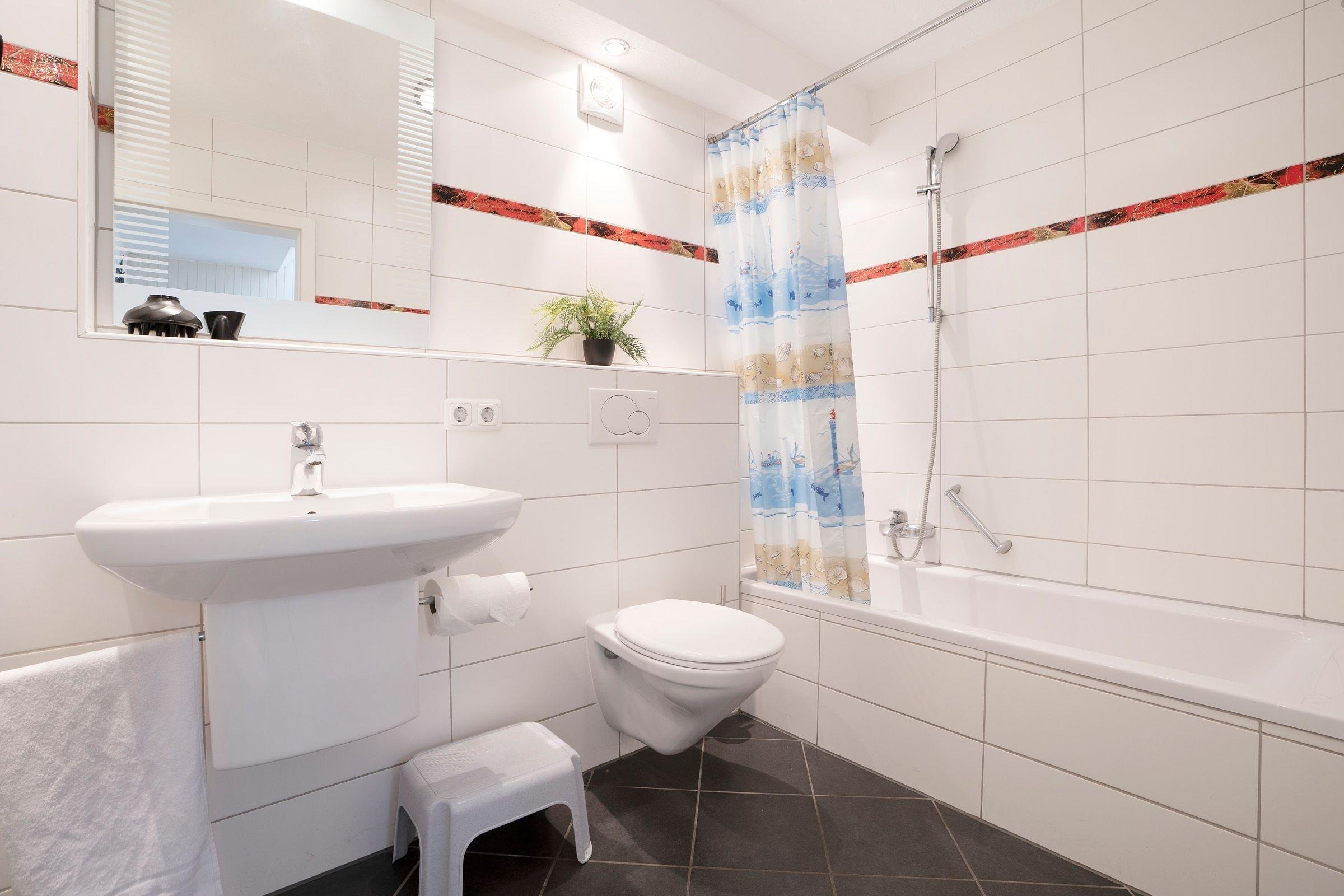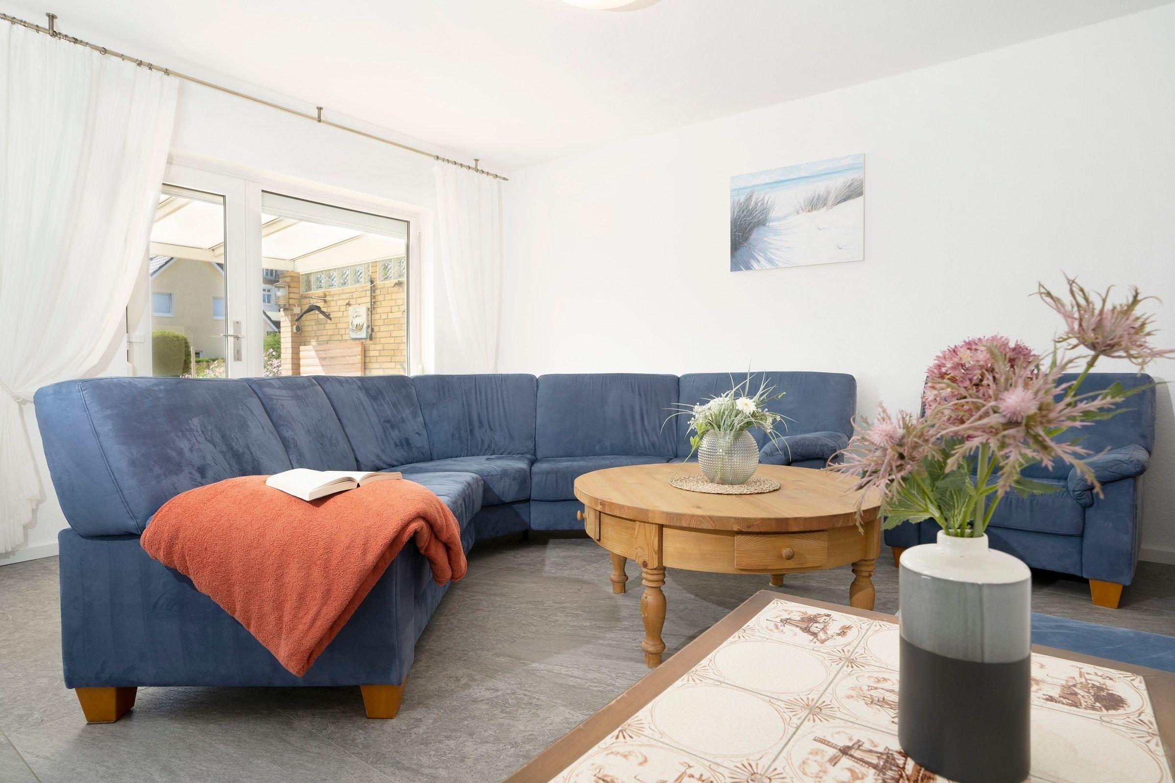 Ein kleines Reich – nur für Sie und Ihre Lieben. Herzlich willkommen im Urlaub. Der Wohnbereich besticht durch seine großzügige, himmelblaue Sofa-Landschaft, auf der jeder seinen Lieblingsplatz zum Entspannen findet. Direkt dahinter haben Sie Zutritt in den Garten. Wie wäre es hier mit einer Runde Federball? Oder soll es etwas ruhiger zugehen? Dann nutzen Sie die Sonnenliegen und nehmen ein nettes Sonnenbad. Auch die gemütliche Sitzecke mit Sonnenschirm bietet eine schöne Gelegenheit, seinen Urlaub draußen zu genießen. Und sollte das Wetter mal nicht mitspielen, sitzen Sie gut geschützt auf der überdachten Terrasse. Natürlich steht Ihnen auch im Wohnraum eine komfortable Ess-Ecke zur Verfügung. Die separate Küche mit heller Front ist mit Espressomaschine und Geschirrspüler gut ausgestattet und bereitet jedem Hobby-Koch gute Laune. Auch eine Waschmaschine sowie ein kleiner Sitzplatz für 2 stehen hier bereit. Im Erdgeschoss befinden sich außerdem ein Schlafzimmer mit einem Französischen Bett (140x200 cm) sowie ein Duschbad. Auch das Obergeschoss ist mit einem Duschbad ausgestattet. Dazu gibt es 2 Schlafzimmer, eins mit Doppelbett (2x 90x200 cm) und eins mit 2 Einzelbetten (je 90x200 cm). Sämtliche Fenster haben Außenrollläden.