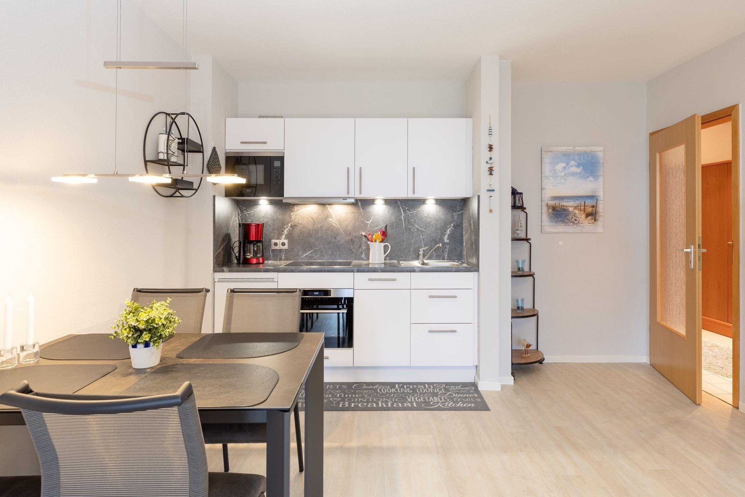 Sie suchen das Besondere? Dann sind Sie in diesem modernen Ferienobjekt genau richtig. Die Ferienwohnung Wellenrauschen befindet sich im Ferien-Wohnpark Kaiserhof – nur 100 Meter vom Strand entfernt. Die geschmackvolle Einrichtung wird Sie begeistern, Sie werden sich sofort wohlfühlen. Im Wohnbereich begrüßt Sie eine gemütliche Couch sowie ein schöner Fernsehsessel. Bei warmem Wetter lockt sicher die großzügige, möblierte Terrasse, auf der Sie gut geschützt sitzen können. Wie wäre es hier mit etwas Zitronen-Wasser als Erfrischung? Dank der Überdachung lässt es sich hier auch bei Nieselwetter wunderbar aushalten. Die moderne Einbauküche ist im Wohnraum integriert und macht durch ihre gute Ausstattung sicher Lust aufs Kochen. Zaubern Sie hier Ihre Menüs und genießen Sie diese in der schicken Ess-Ecke. Eine Spülmaschine erledigt derweil den Abwasch. Wunderwolle Nächte verbringen Sie im Schlafzimmer im bequemen Doppelbett (2x 90x200 cm). Das helle Duschbad mit Fenster verspricht einen guten Start in den Tag.