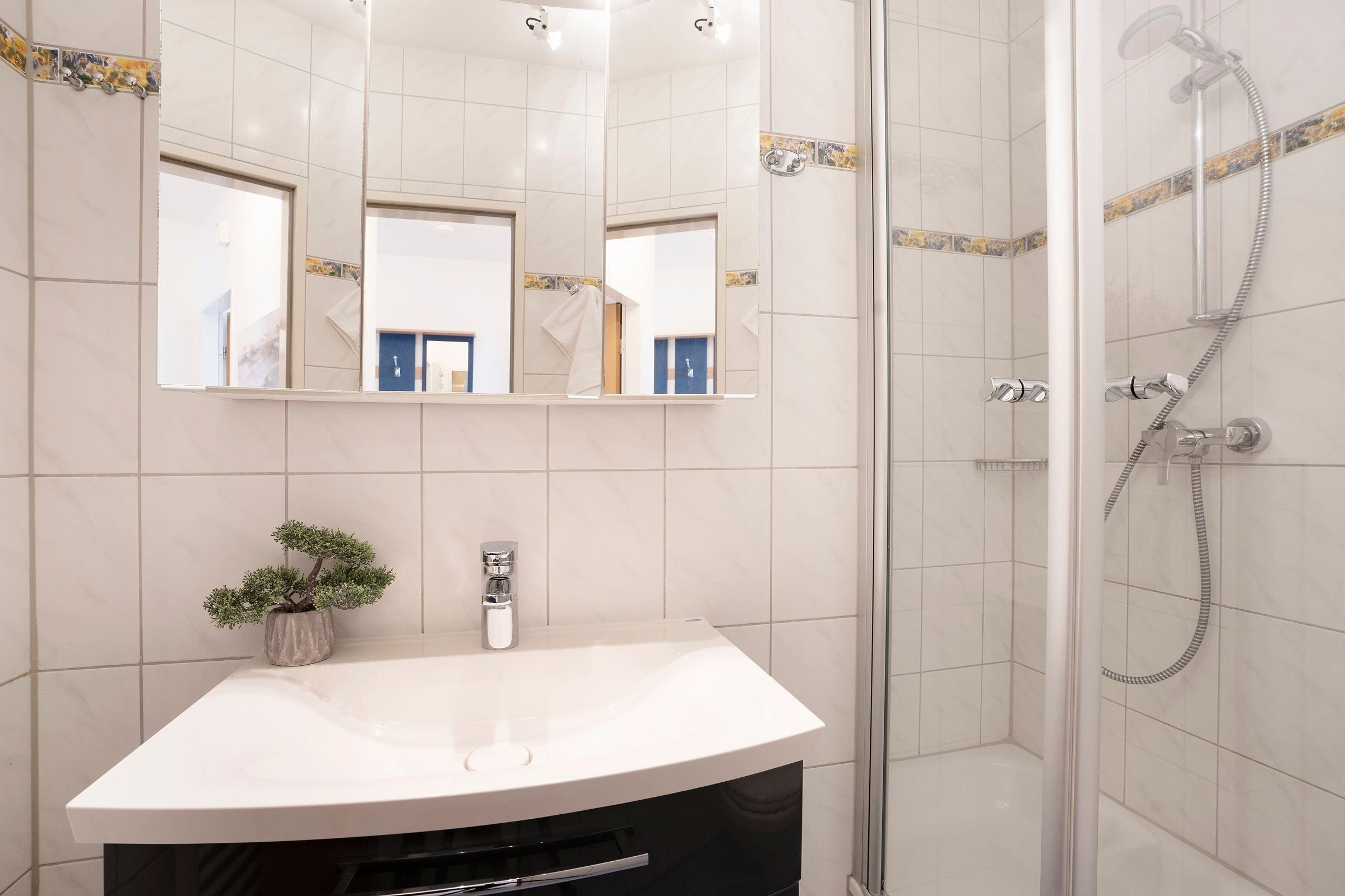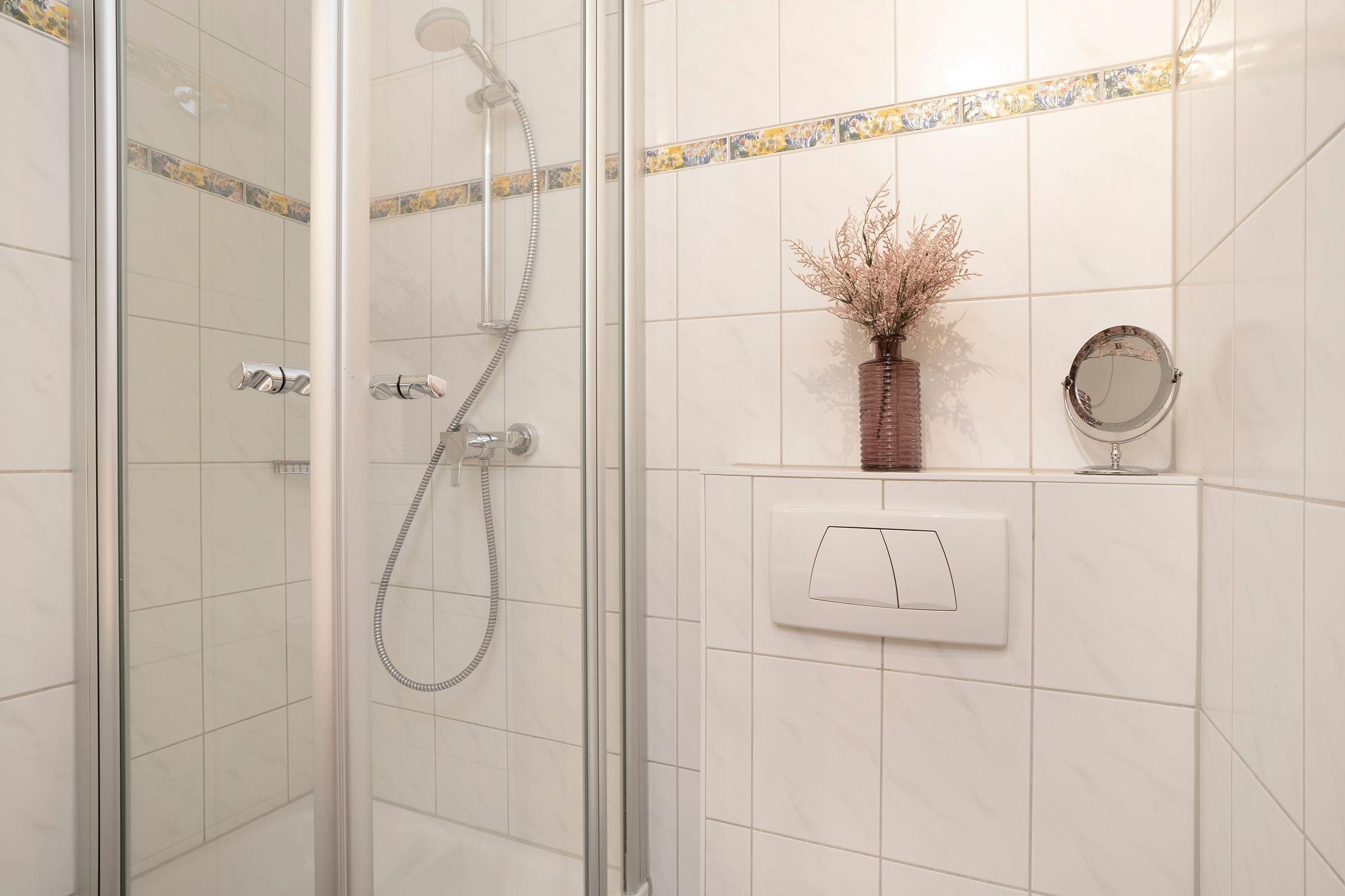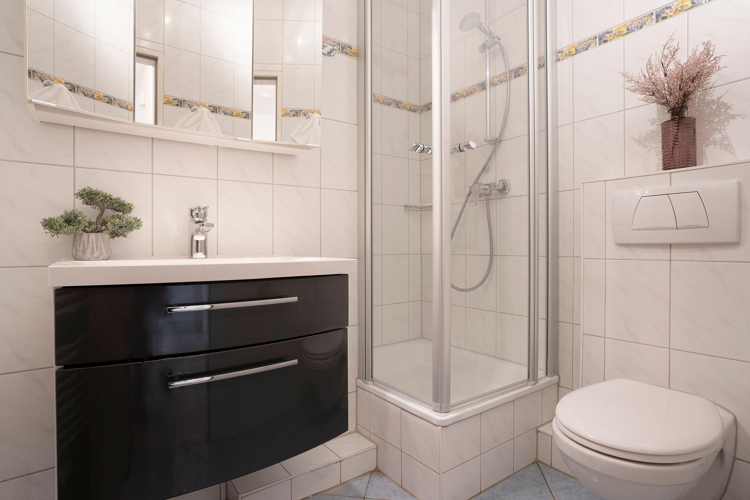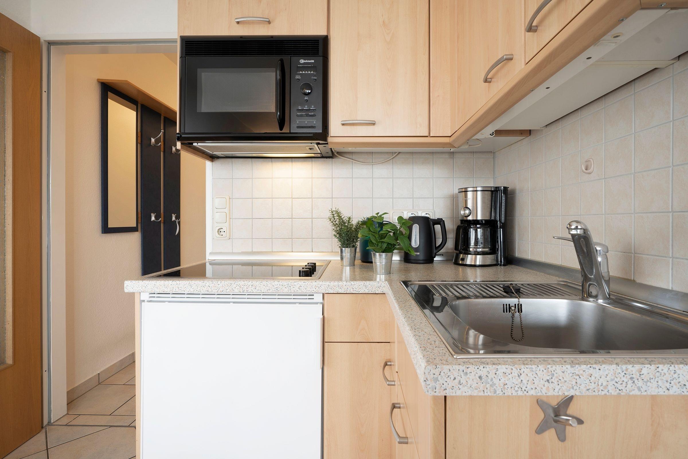 Treten Sie ein und lassen Sie den Alltag hinter sich . Es erwartet Sie ein großzügiger Wohn- und Essbereich mit einer gemütlichen Doppelbettcouch (150x190 cm), die nach einem schönen Urlaubstag für Entspannung und reichlich Platz für kuschelige Filmabende auf dem Kabel-TV (Flachbild 81er Bild) bietet. Auf der sonnigen Terrasse können Sie bei einem leckeren Frühstück die ersten Sonnenstrahlen des Tages genießen. Die kleine Küche ist in das Wohnzimmer integriert, bietet mit 4-Platten-Herd, Kaffeemaschine, Toaster, Wasserkocher, Eierkocher, Kühlschrank mit Gefrierfach etc. alle Annehmlichkeiten, um köstliche Mahlzeiten zuzubereiten. Höchsten Schlafkomfort für zwei Personen finden Sie im separaten Schlafzimmer mit einem Doppelbett (2x 90x200 cm), das mit großem Kleiderschrank auch Stauraum für Ihre Urlaubsgarderobe bietet. Ein schönes helles Bad mit Dusche/WC rundet diese Wohnung ab.