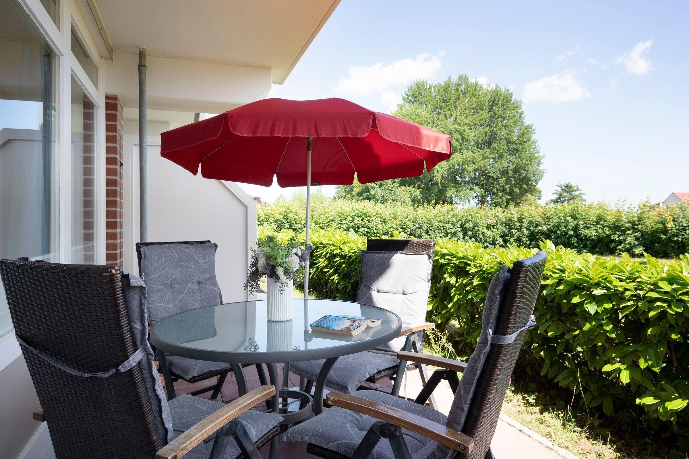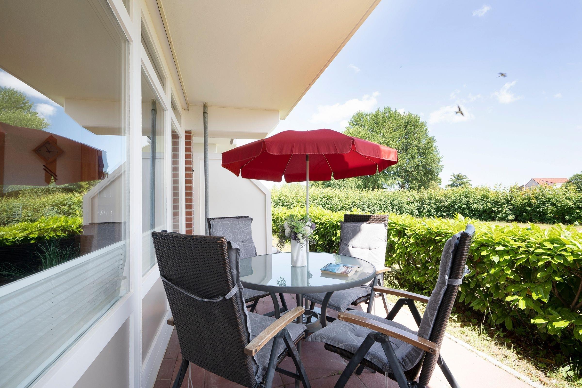 Gemütliche Ferienwohnung mit Terrasse und Seeblick in Kellenhusen, strandnah und hundefreundlich.