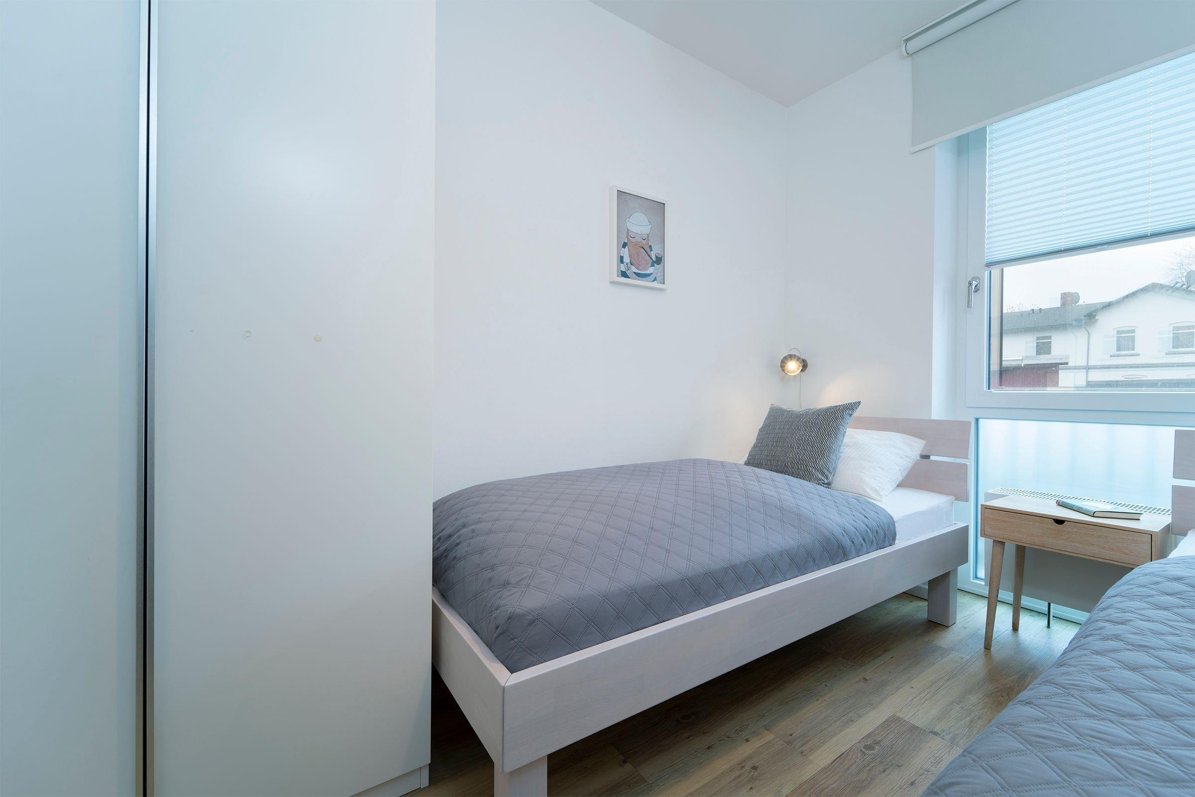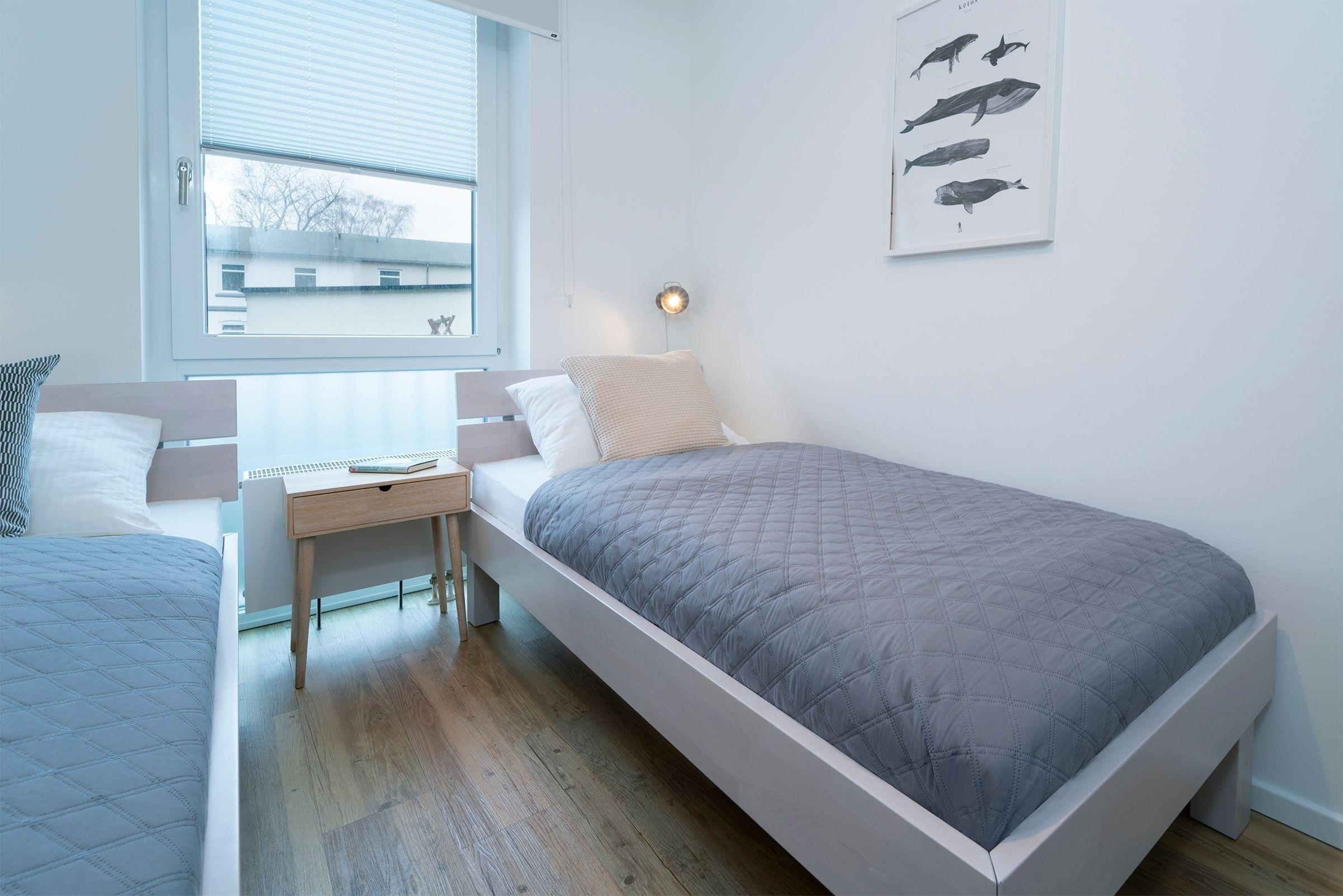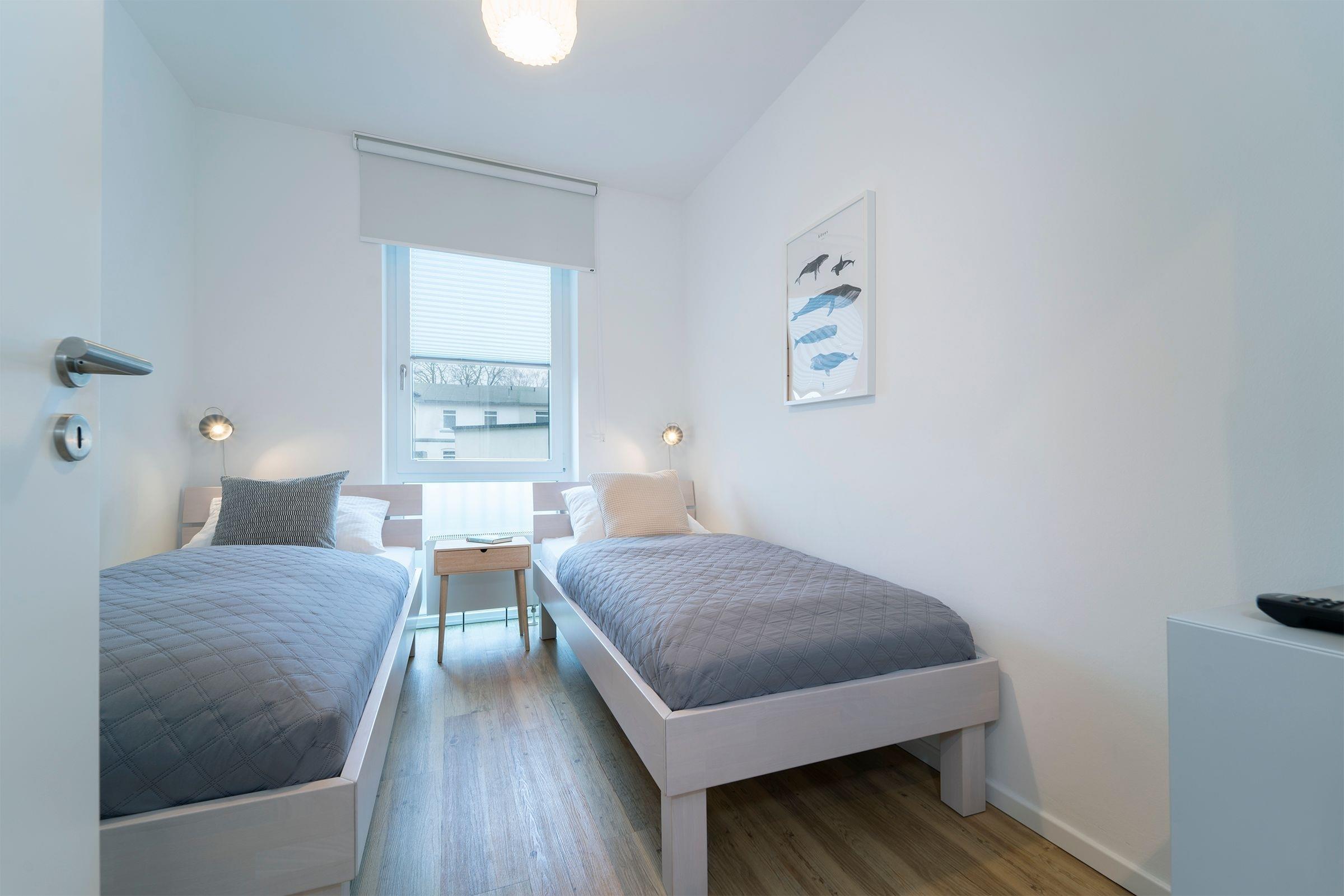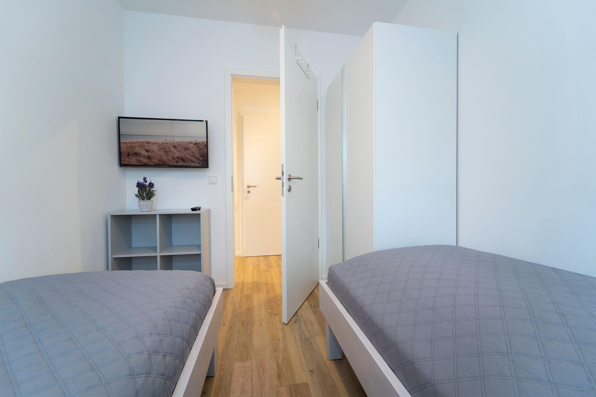 Schlafzimmer 2: 2 Einzelbetten (2x 90x200 cm), TV, Kleiderschrank, Verdunkelung (Plissee, Innenrollo)