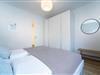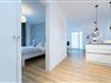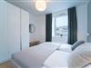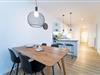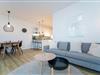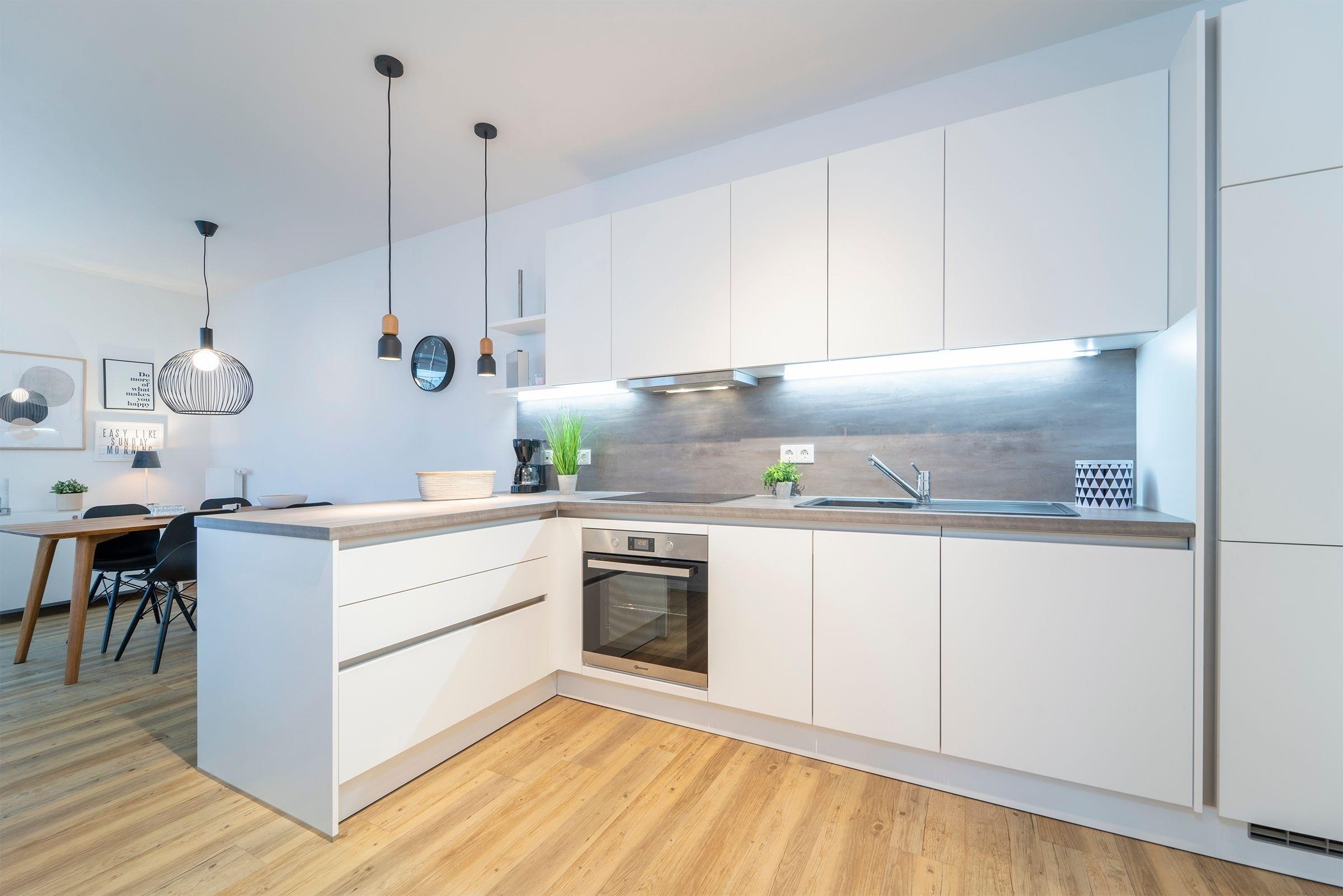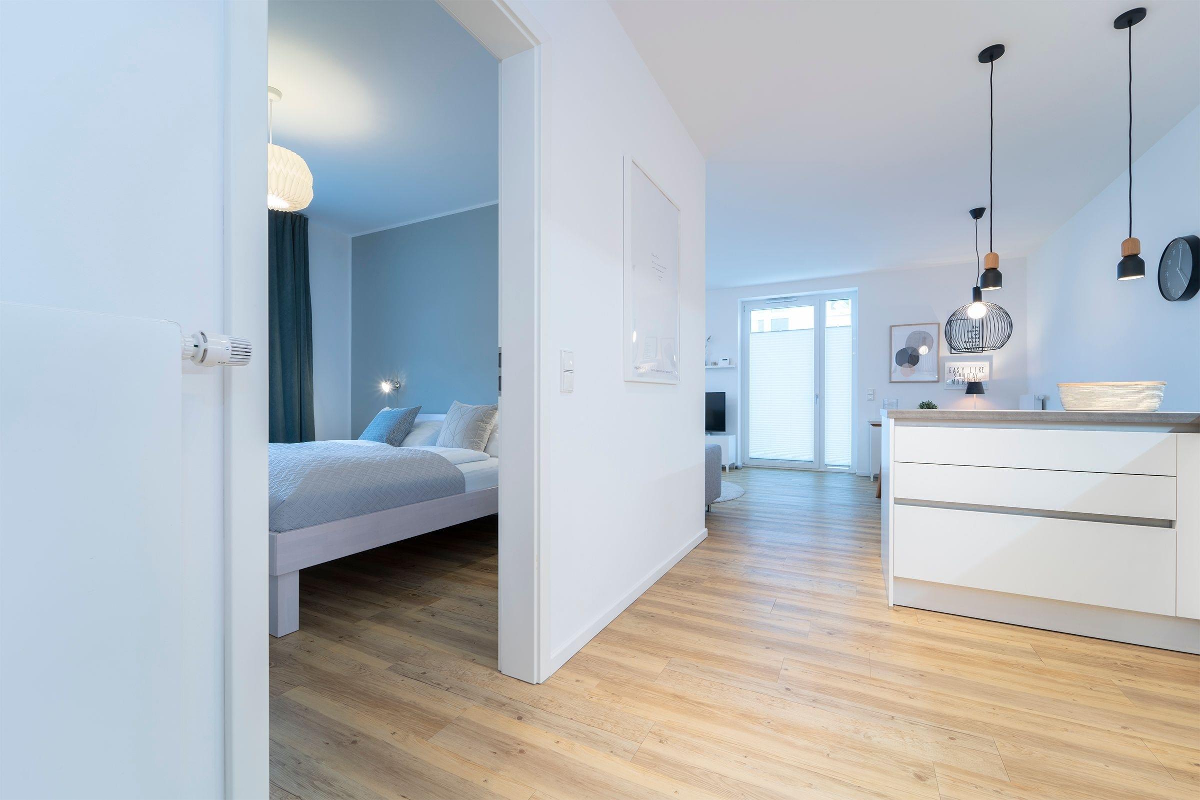 Zurück im Wohnraum erwartet Sie eine offene Küche mit Tresen. Die Ausstattung mit Induktionsherd und Spülmaschine bietet alles, was man zum leidenschaftlichen Kochen braucht. Bei einem Glas Wein kann man hier gemeinsam seine Menüs zaubern und nimmt dann in der angrenzender Essecke Platz. Das fühlt sich wie Urlaub an. Wunderbar zur Ruhe kommen Sie in den beiden separaten Schlafräumen: Ein Schlafzimmer verfügt über ein Doppelbett (180x200 cm) und das zweite Schlafzimmer über 2 Einzelbetten (je 90x200 cm) sowie einem zusätzlichem Smart-TV. Passend zur gesamten Einrichtung der Wohnung lässt auch das Duschbad mit Handtuchwärmer und Fußbodenheizung keine Wünsche offen.