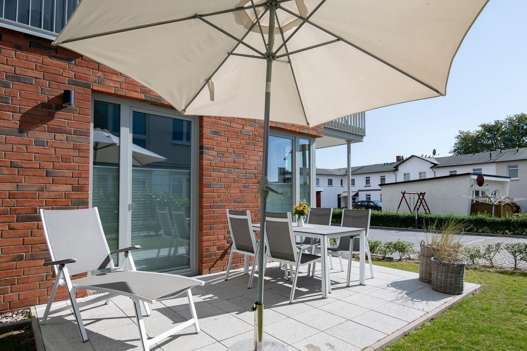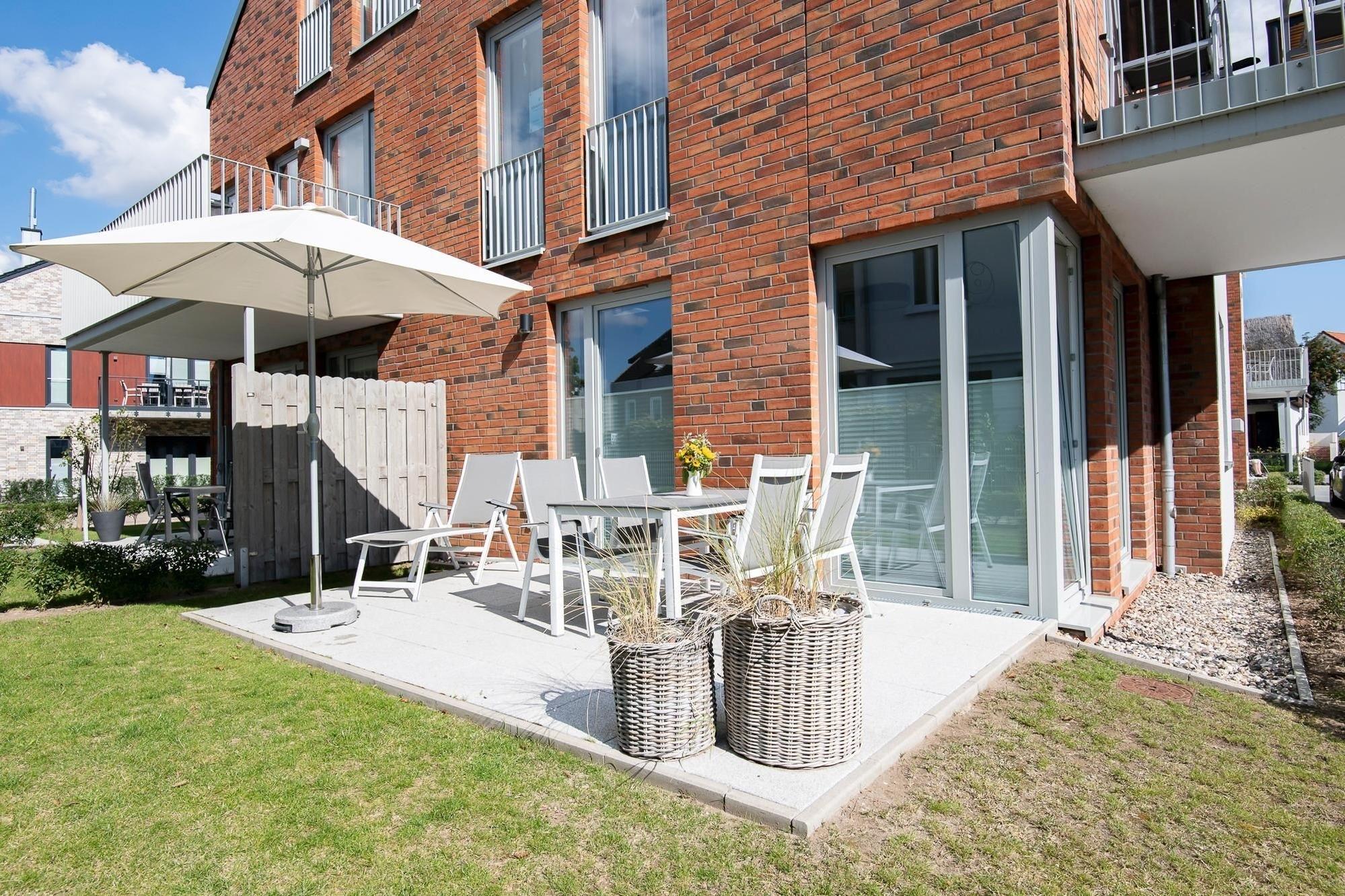 Moderne Ferienwohnung mit Terrasse und Strandnähe im KellenHus, ideal für einen entspannten Urlaub an der Ostsee.