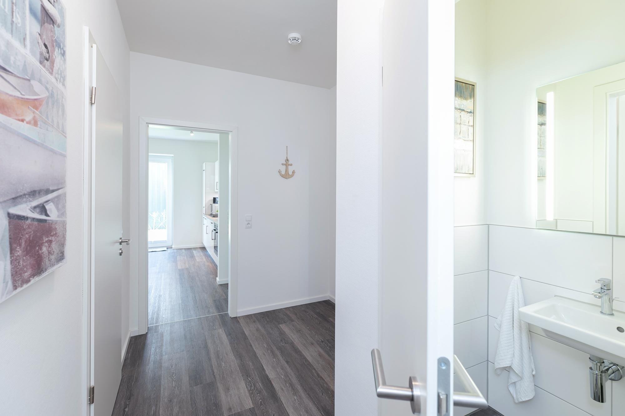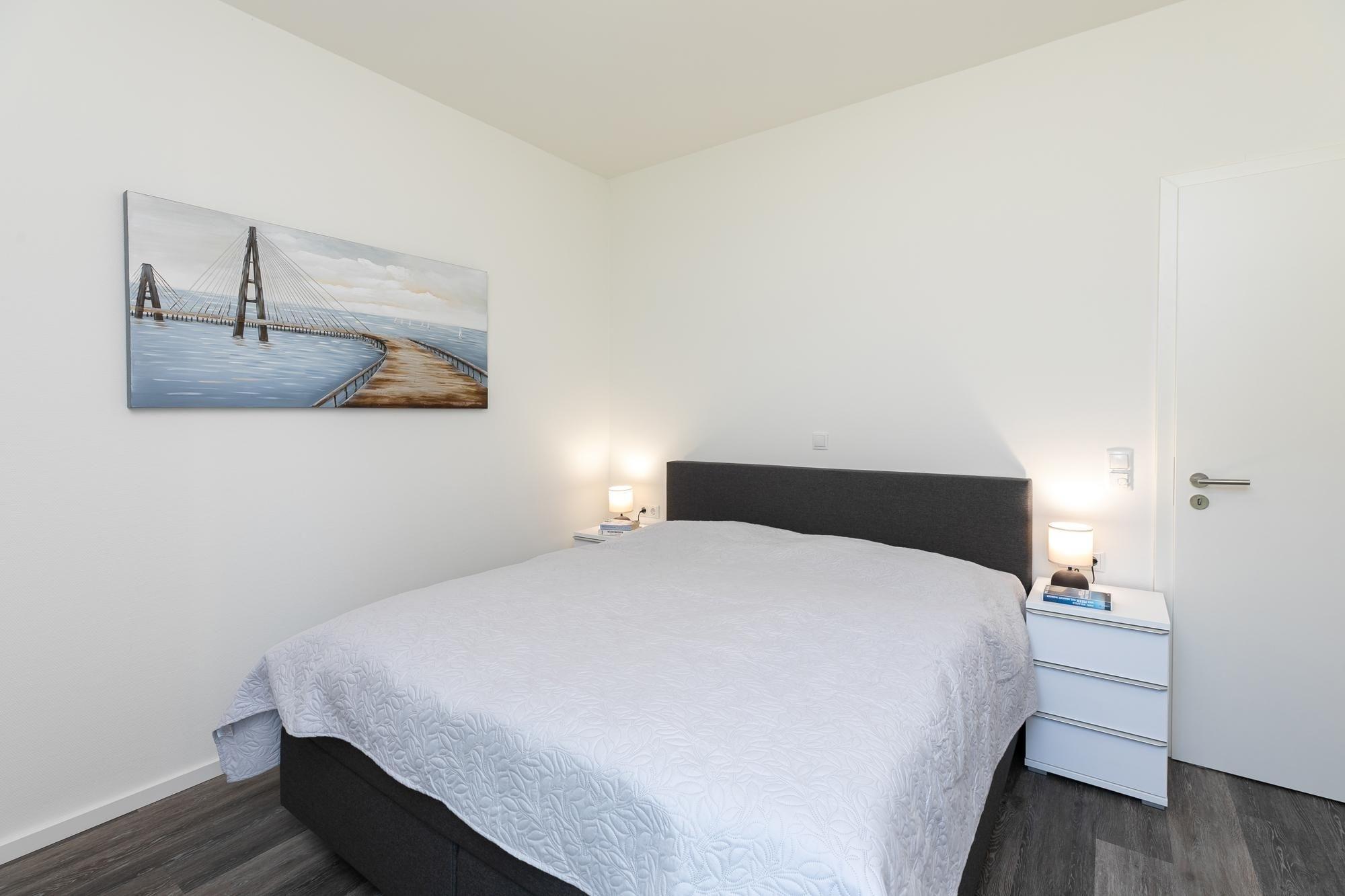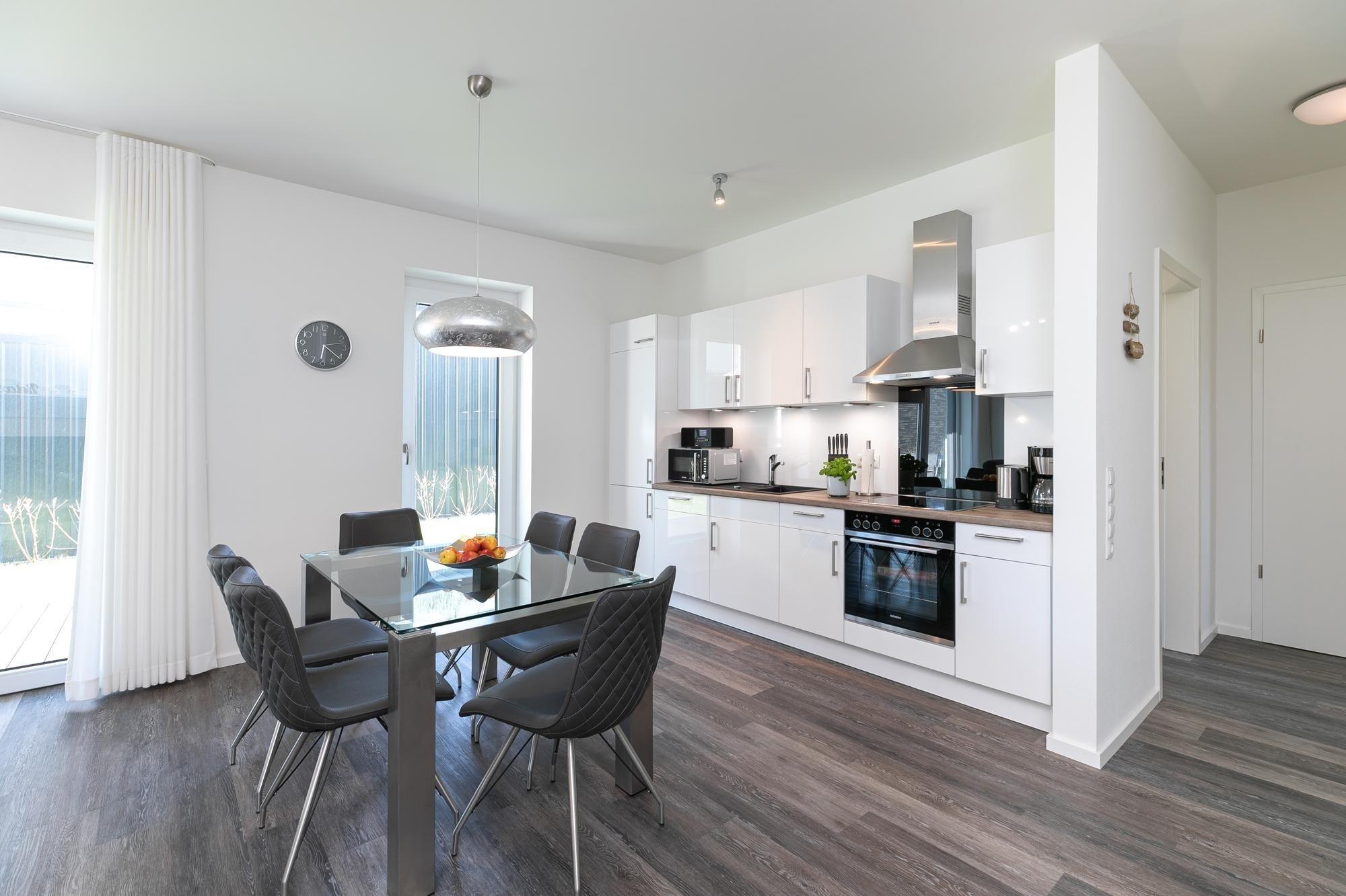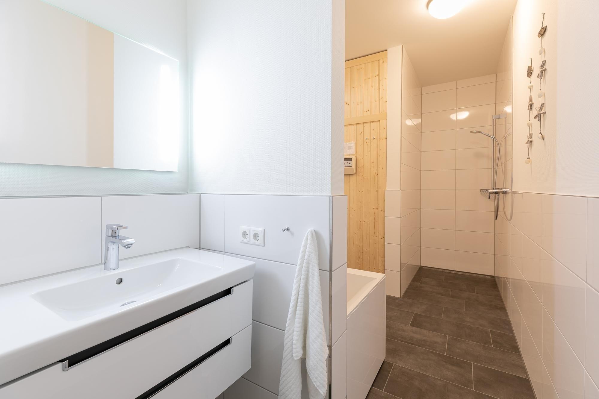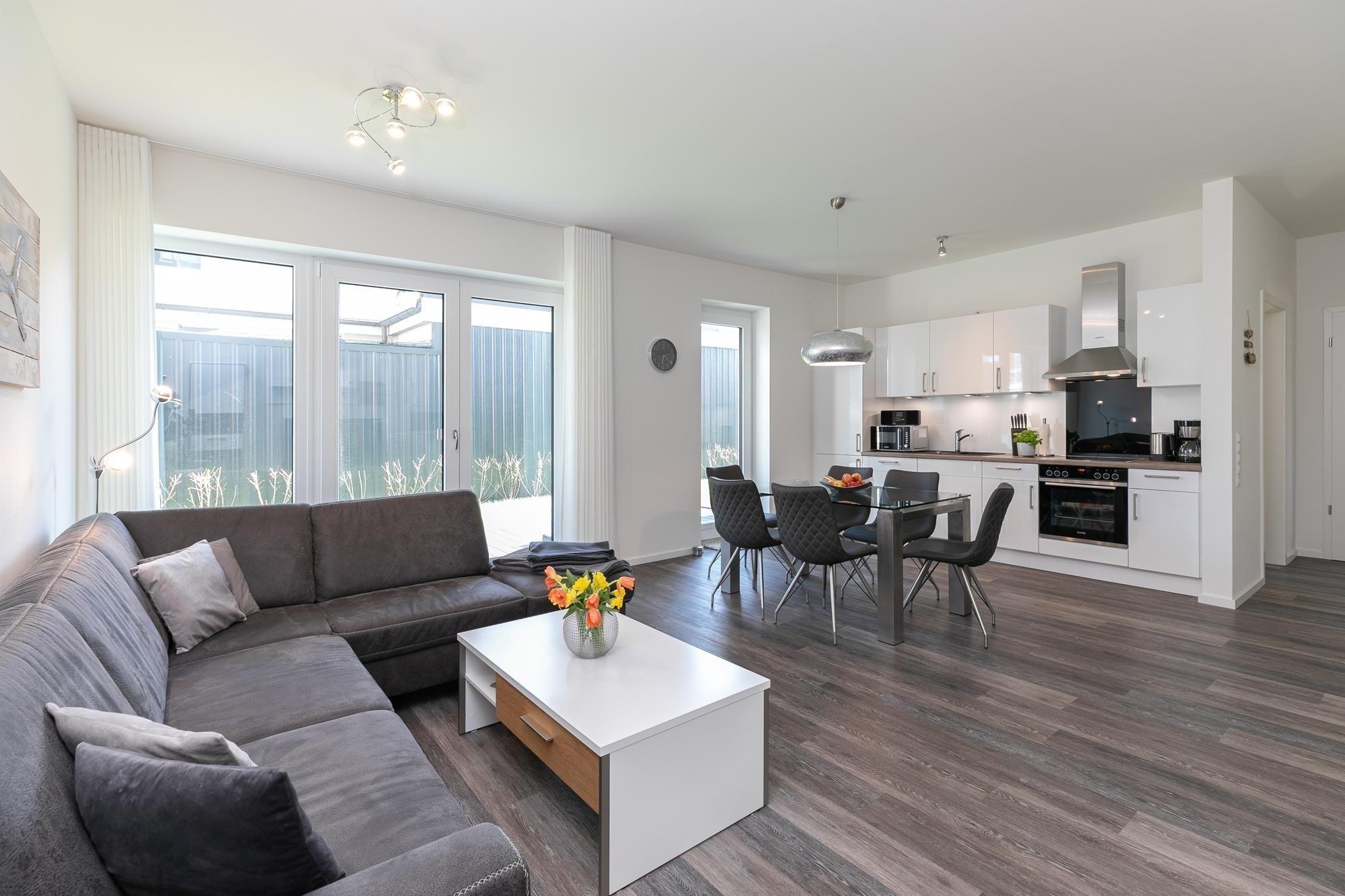 Ein perfekter Ort zum Erholen und Entspannen – die Ferienwohnung begrüßt Sie mit einer modernen Sofa-Landschaft mit TV-Gerät und einer schicken Ess-Ecke, die gleichzeitig als origineller Raumteiler fungiert. Die Küche mit Geschirrspüler ist offen gestaltet und gut ausgestattet, sodass Sie Ihre Lieblings-Gerichte auch im Urlaub wunderbar zubereiten können. Zum Speisen eignet sich natürlich gut die möblierte Terrasse. Hier können Sie gemütlich zusammensitzen und den Abend bei einem Glas Wein und guten Gesprächen ausklingen lassen. Für die Nacht stehen 2 Schlafräume bereit: Ein Zimmer verfügt über ein Boxspringbett (180x200 cm), das zweite über 2 Einzel-Boxspringbetten (je 90x200 cm). In beiden Schlafzimmern steht jeweils ein TV-Gerät. Das komfortable Badezimmer bietet Ihnen mit Sauna und Whirlwanne eine kleine eigene Wellness-Oase. Genießen Sie hier Ihre Auszeit vom Alltag. Zusätzlich verfügt die Wohnung über ein Gäste-WC und einen kleinen Abstellraum mit Waschmaschine. Ein bequemes Plus ist der Personenaufzug im Hause.