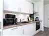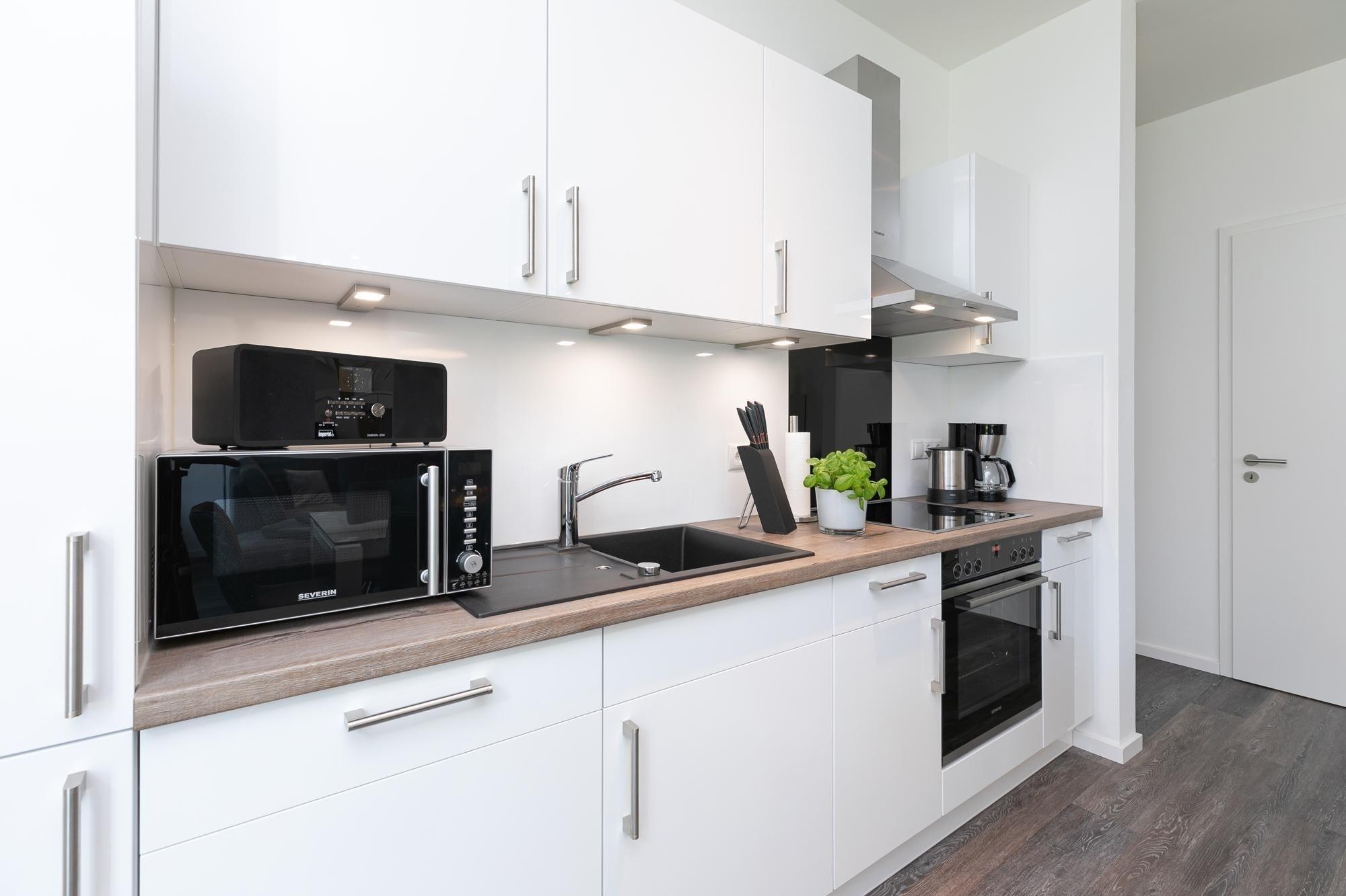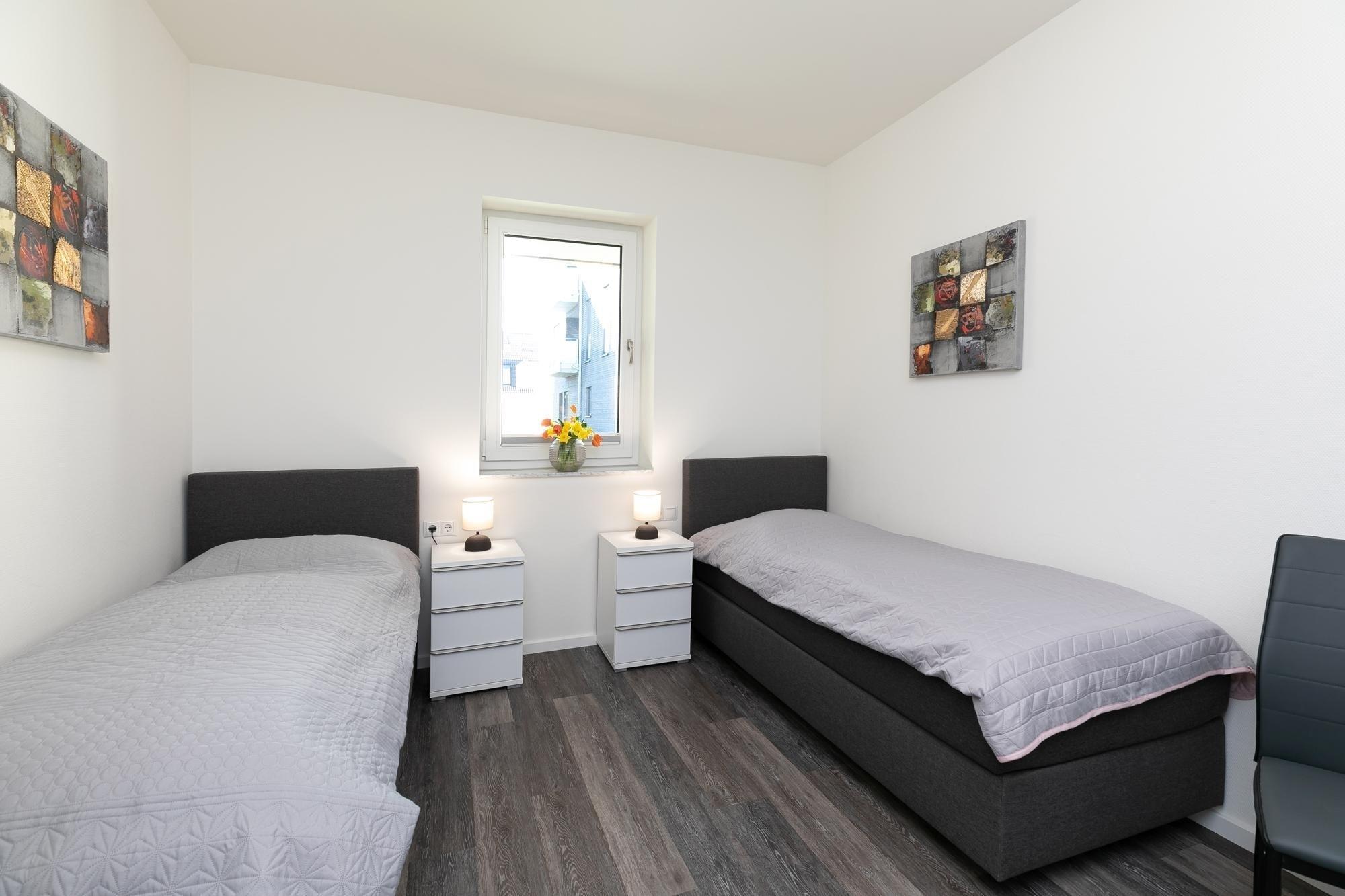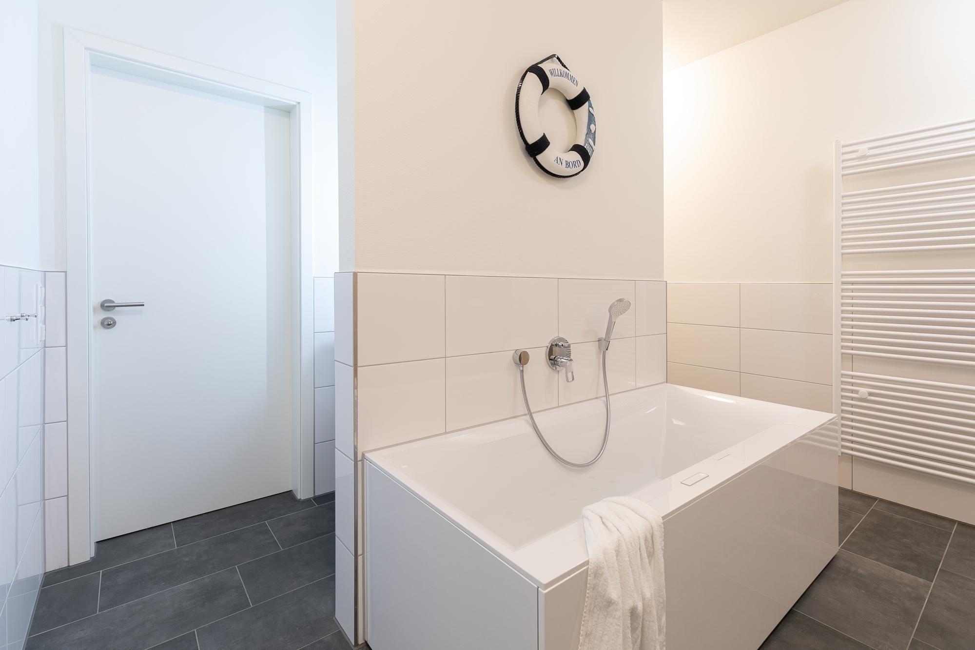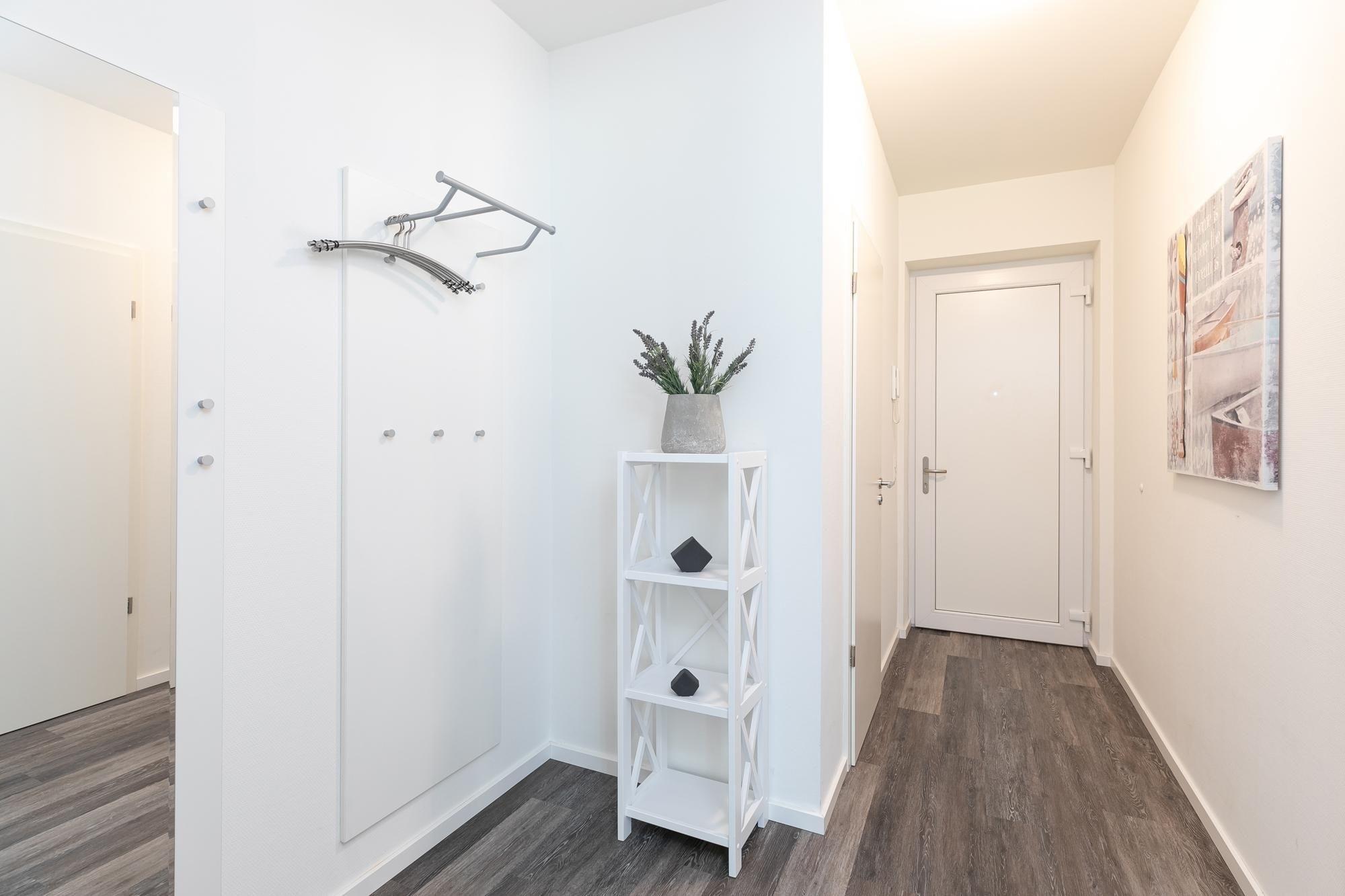 Ein perfekter Ort zum Erholen und Entspannen – die Ferienwohnung begrüßt Sie mit einer modernen Sofa-Landschaft mit TV-Gerät und einer schicken Ess-Ecke, die gleichzeitig als origineller Raumteiler fungiert. Die Küche mit Geschirrspüler ist offen gestaltet und gut ausgestattet, sodass Sie Ihre Lieblings-Gerichte auch im Urlaub wunderbar zubereiten können. Zum Speisen eignet sich natürlich gut die möblierte Terrasse. Hier können Sie gemütlich zusammensitzen und den Abend bei einem Glas Wein und guten Gesprächen ausklingen lassen. Für die Nacht stehen 2 Schlafräume bereit: Ein Zimmer verfügt über ein Boxspringbett (180x200 cm), das zweite über 2 Einzel-Boxspringbetten (je 90x200 cm). In beiden Schlafzimmern steht jeweils ein TV-Gerät. Das komfortable Badezimmer bietet Ihnen mit Sauna und Whirlwanne eine kleine eigene Wellness-Oase. Genießen Sie hier Ihre Auszeit vom Alltag. Zusätzlich verfügt die Wohnung über ein Gäste-WC und einen kleinen Abstellraum mit Waschmaschine. Ein bequemes Plus ist der Personenaufzug im Hause.