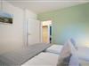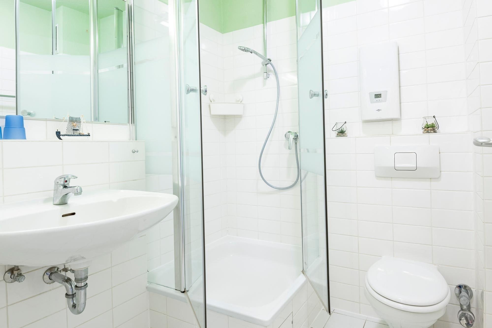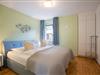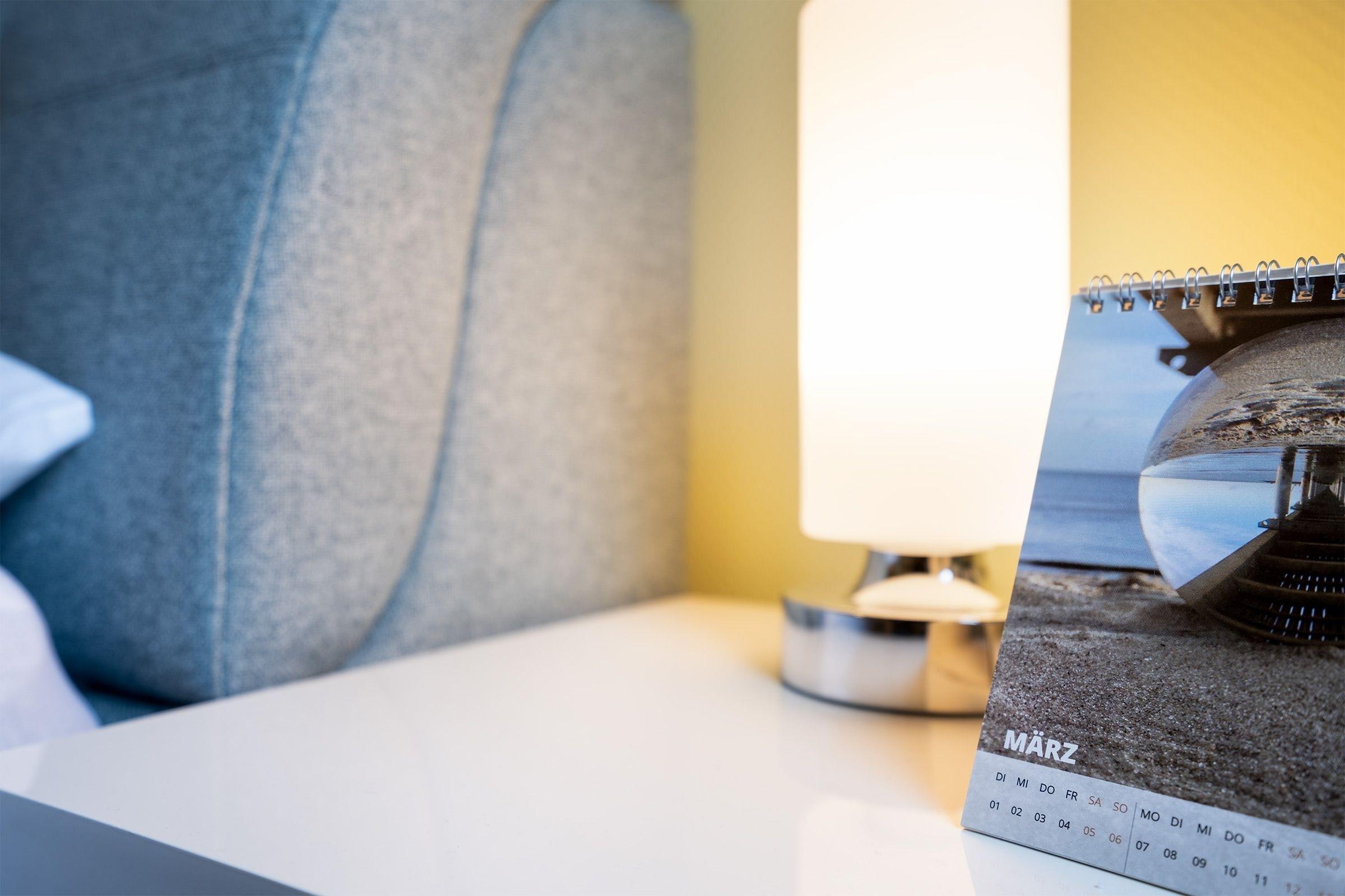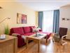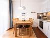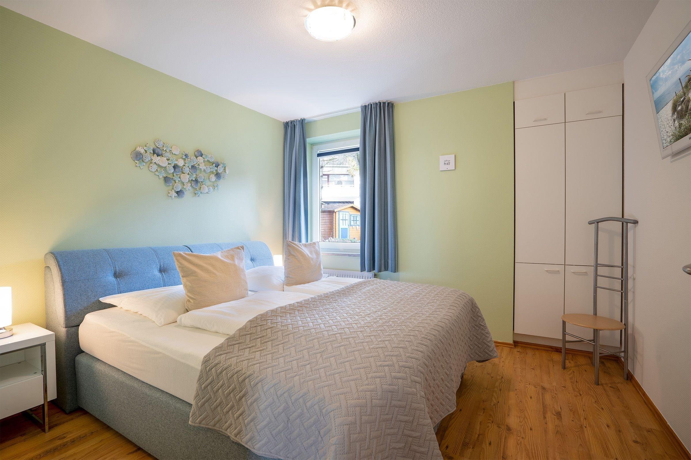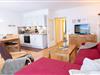 Das Herzstück der Wohnung ist der großzügige Wohn-/Essbereich mit hochwertiger Schlafcouch, Sessel, Flachbild-TV (SAT) und gemütlichen Essplatz für vier. Von hier aus führt ein direkter Zugang auf den möblierten Balkon mit Sonnenschirm. Die in den Wohnraum integrierte Küchenzeile bietet Annehmlichkeiten wie einen 4-Platten-Herd, Backofen und Spülmaschine. Im separaten Schlafzimmer sorgt das bequeme Boxspring-Doppelbett (180x200 cm) für erholsame Nächte, ein zweites TV-Gerät bietet Unterhaltung. Das hell geflieste Badezimmer ist mit Eckdusche, WC und Waschbecken klassisch ausgestattet.