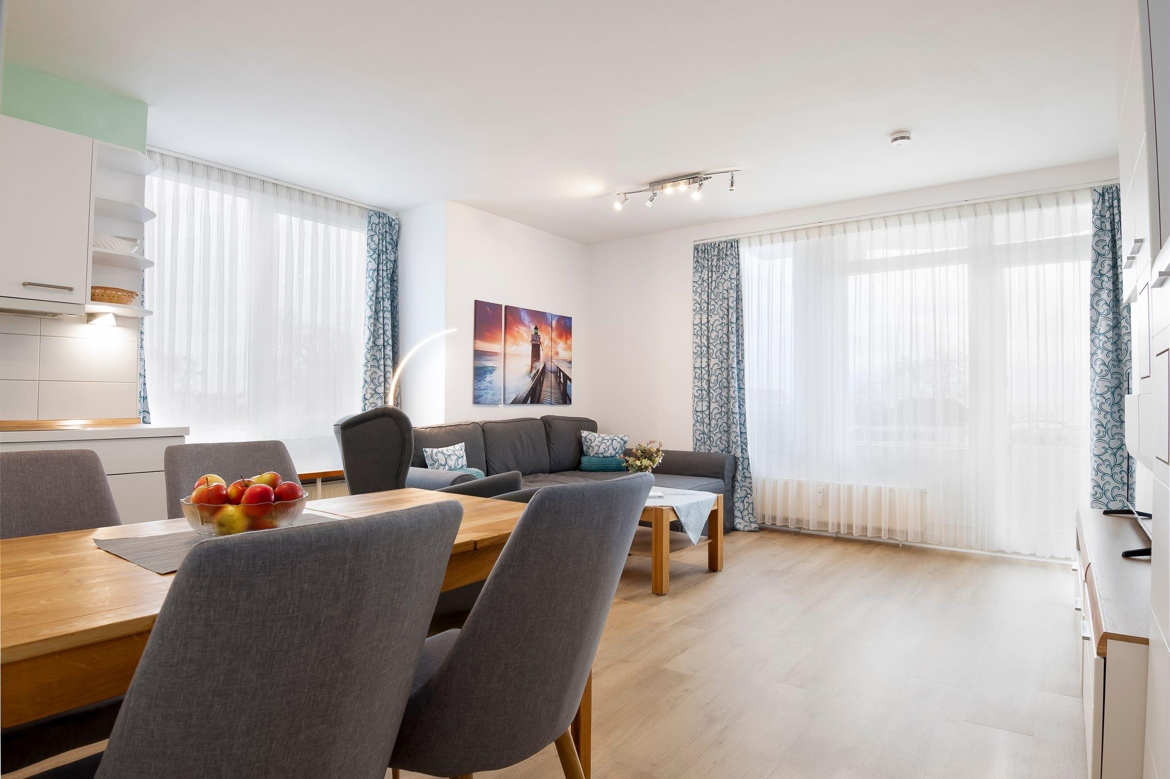 Der modern eingerichtete Wohnbereich wurde mit einem komfortablen Ecksofa, einem Esstisch sowie einem Flachbildfernseher ausgestattet. Dieser Bereich ist hell und freundlich gestaltet und lädt dazu ein, eine schöne Urlaubszeit mit Ihrer Familie oder Ihren Freunden zu verbringen. In einer Nische im Wohnbereich befindet sich die offene, bestens ausgestattete Küche. Ihnen stehen z. B. eine Kühl-/Gefrierkombination, ein 4-Platten-Cerankochfeld sowie ein Geschirrspüler zur Verfügung. Als Schlafmöglichkeiten dienen das Doppelbett (2x 90x190 cm) im separaten Schlafzimmer und das ausziehbare Ecksofa (ca. 140x200 cm) im Wohnbereich. In beiden Räumen sind Gardinen als Verdunkelungsmöglichkeit vorhanden. Ihre Urlaubsgarderobe können Sie bequem im großen Kleiderschrank im Schlafzimmer verstauen. Im innenliegenden, hell gefliesten Badezimmer mit Dusche ist ebenfalls ausreichend Stauraum für Ihre Badutensilien vorhanden. Auf dem möblierten Balkon können Sie viele schöne Stunden verbringen und den Blick auf das Meer genießen. Der WLAN-Anschluss ist für Sie selbstverständlich kostenfrei.
