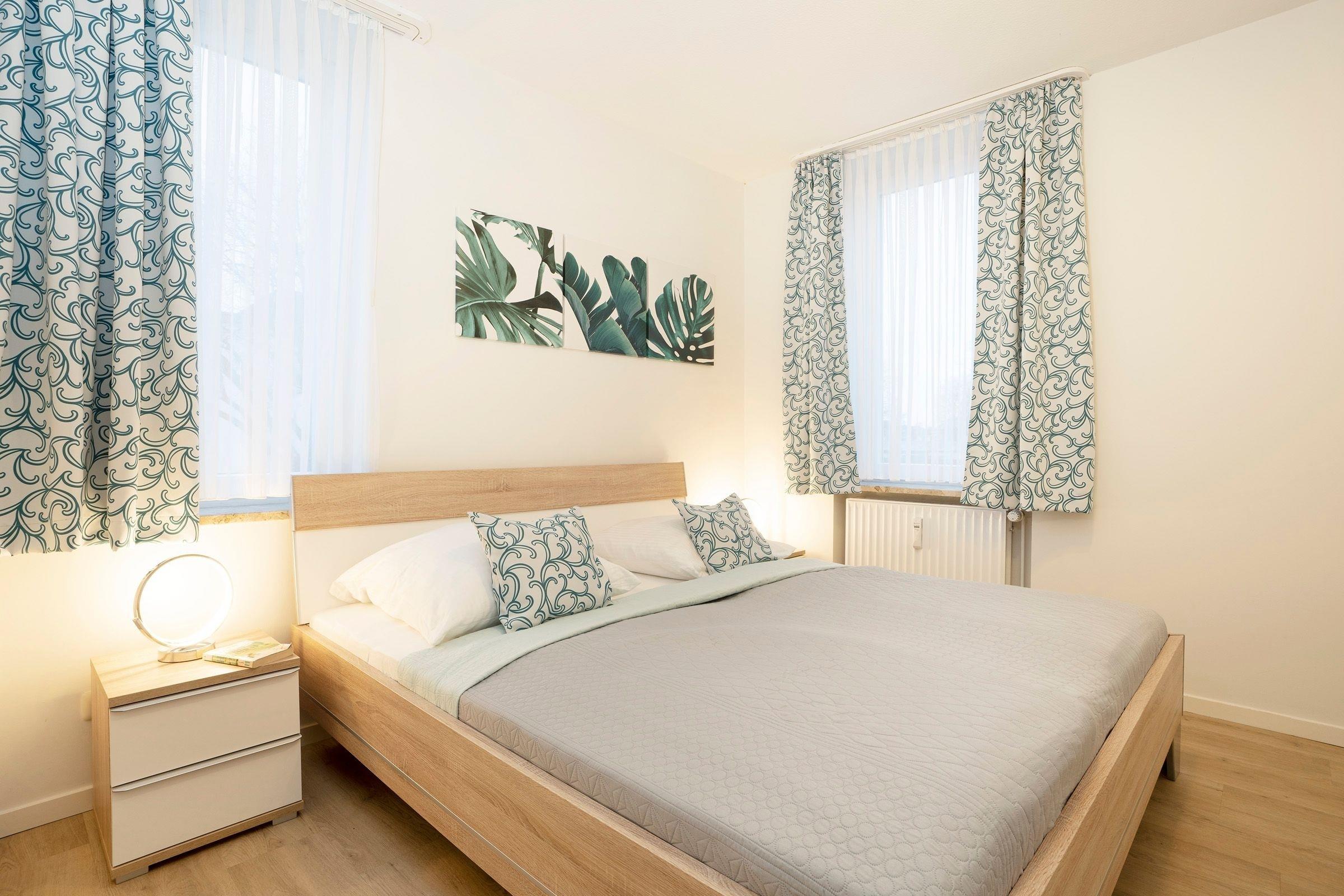 Schlafzimmer: 1 Doppelbett (2x 90x190 cm), Kleiderschrank, Verdunkelungsgardinen