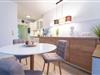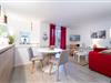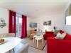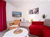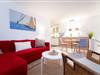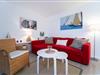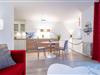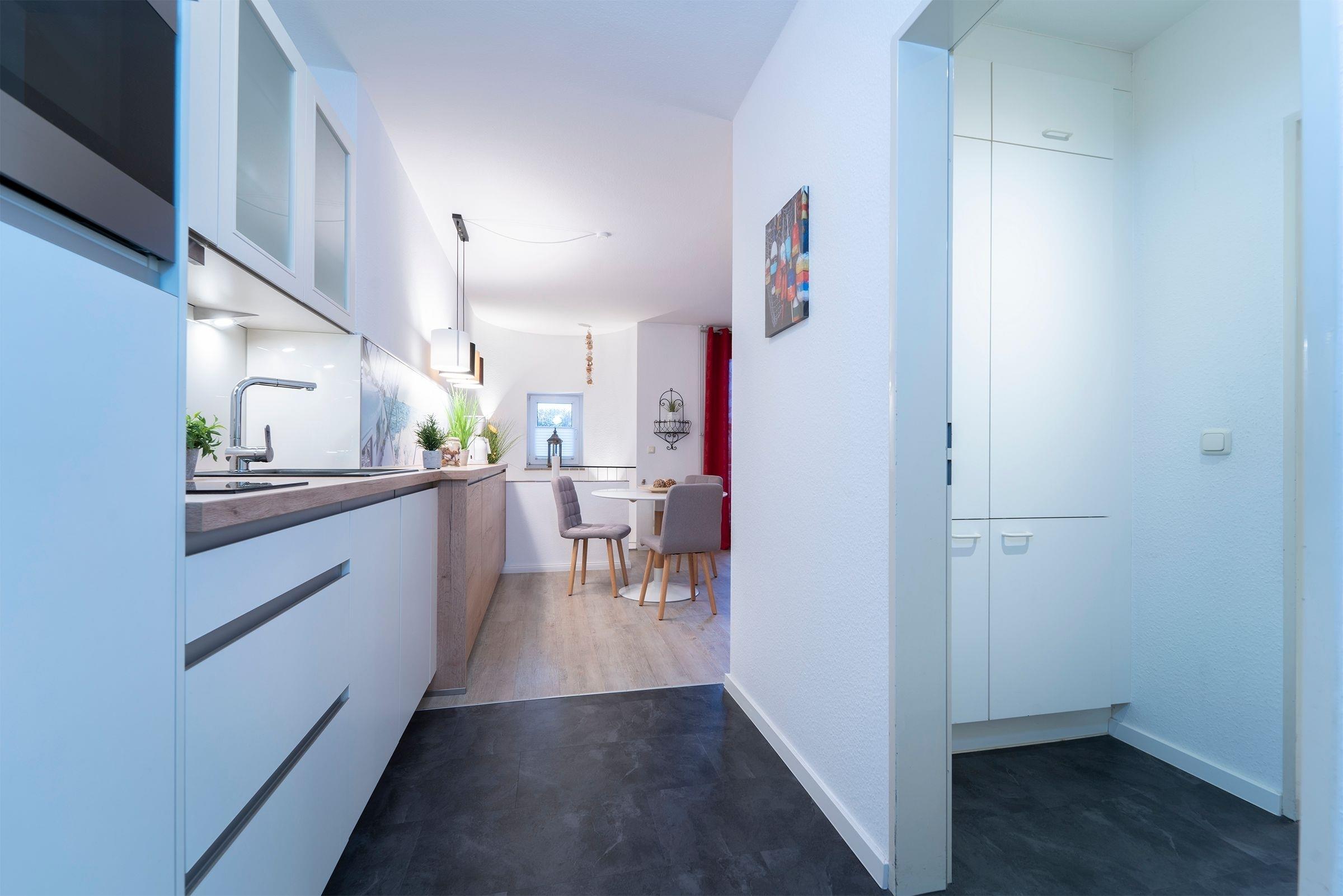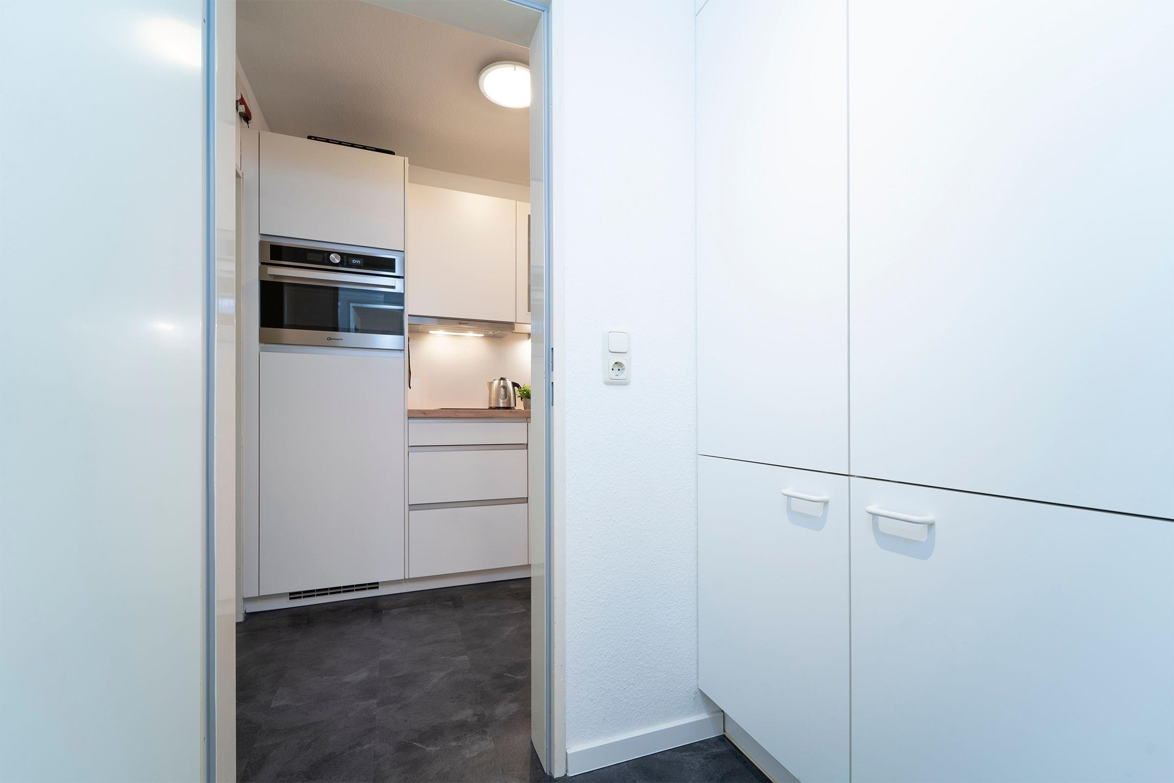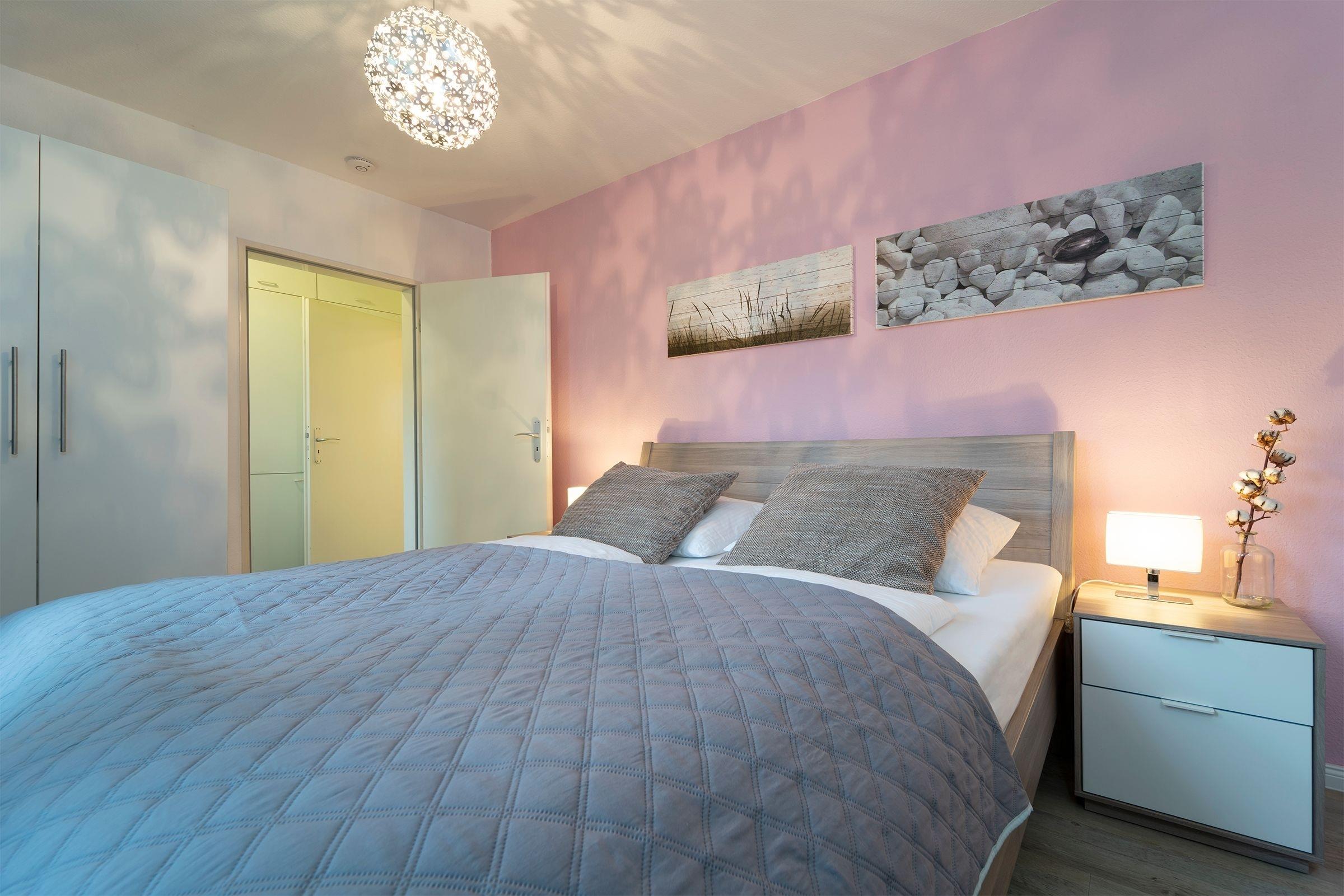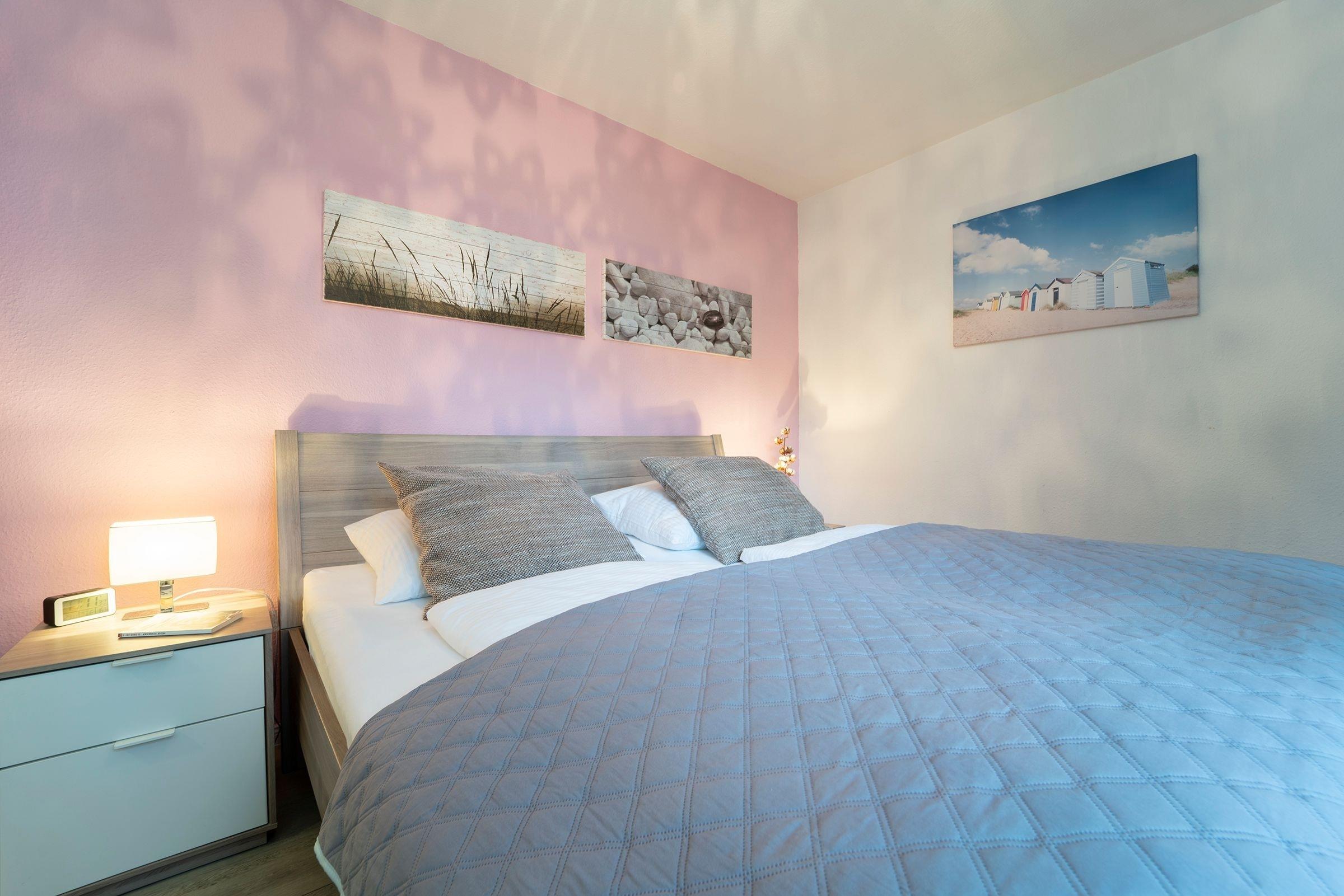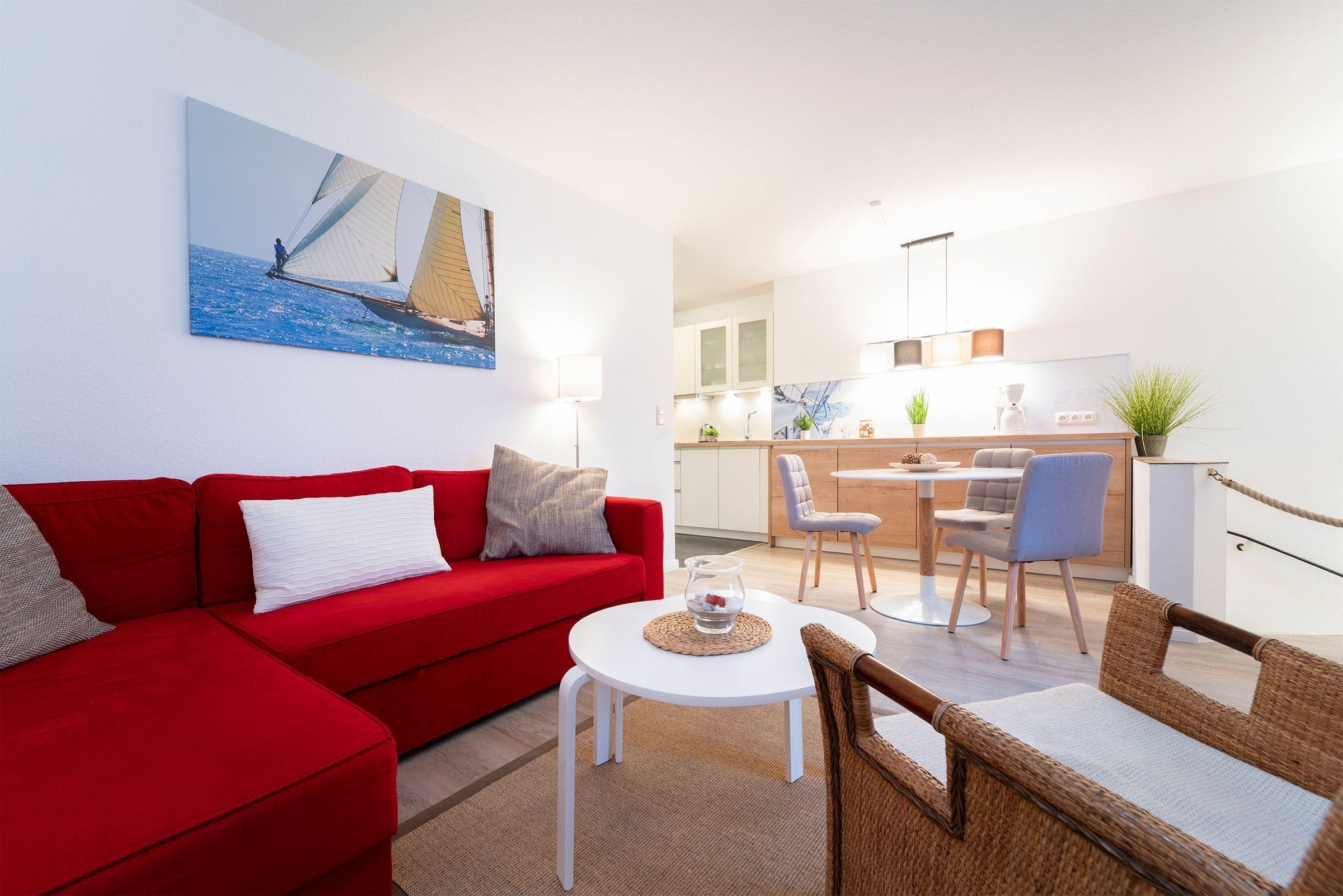 Über einige Stufen gelangen Sie in den modernen, freundlichen Wohnbereich mit Schlafcouch (ca. 140x200 cm), TV, Sony Micro-Stereoanlage und Zugang zum möblierten Balkon mit Südausrichtung. Eine zum Wohnzimmer hin offene Küche mit Cerankochfeld, Backofen, Kühlschrank, Kaffeemaschine (Kapsel & Filter), Wasserkocher und Toaster bietet alles, um sich komfortabel verpflegen zu können. Im separaten Schlafzimmer mit gemütlichem Boxspring-Doppelbett können Sie sich zur Nachtruhe begeben. Das freundliche Tageslichtbad mit Dusche und WC rundet dieses Feriendomizil ab.