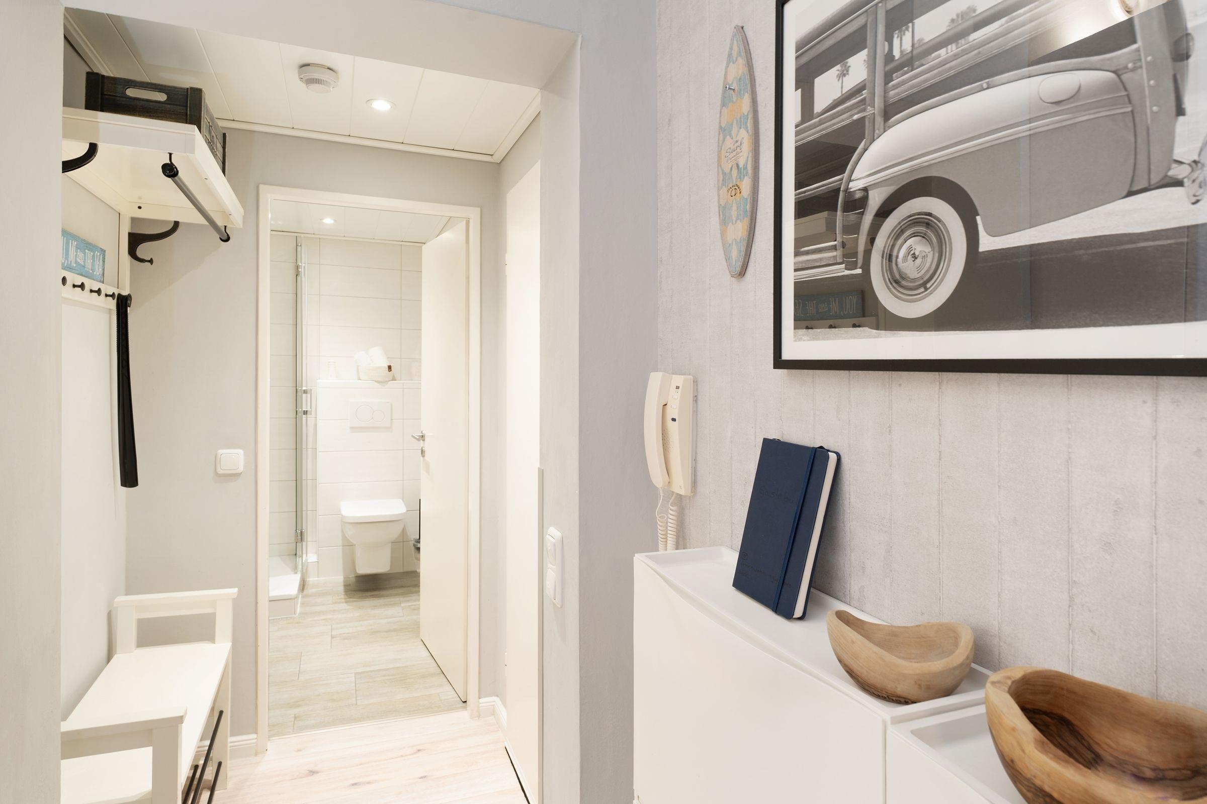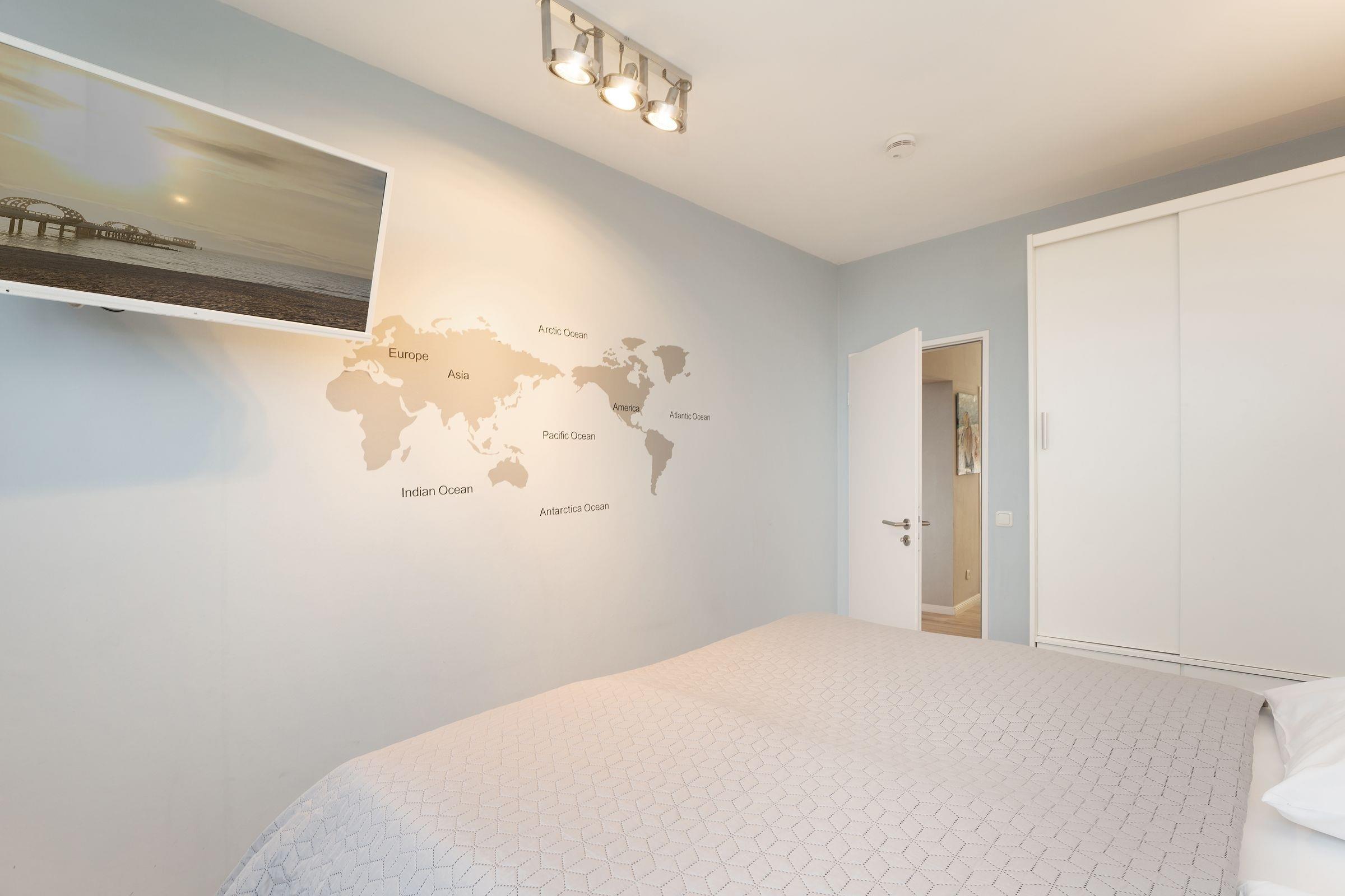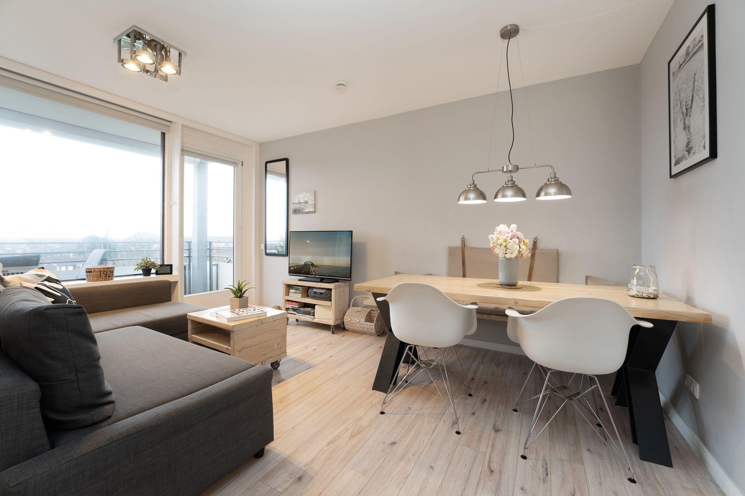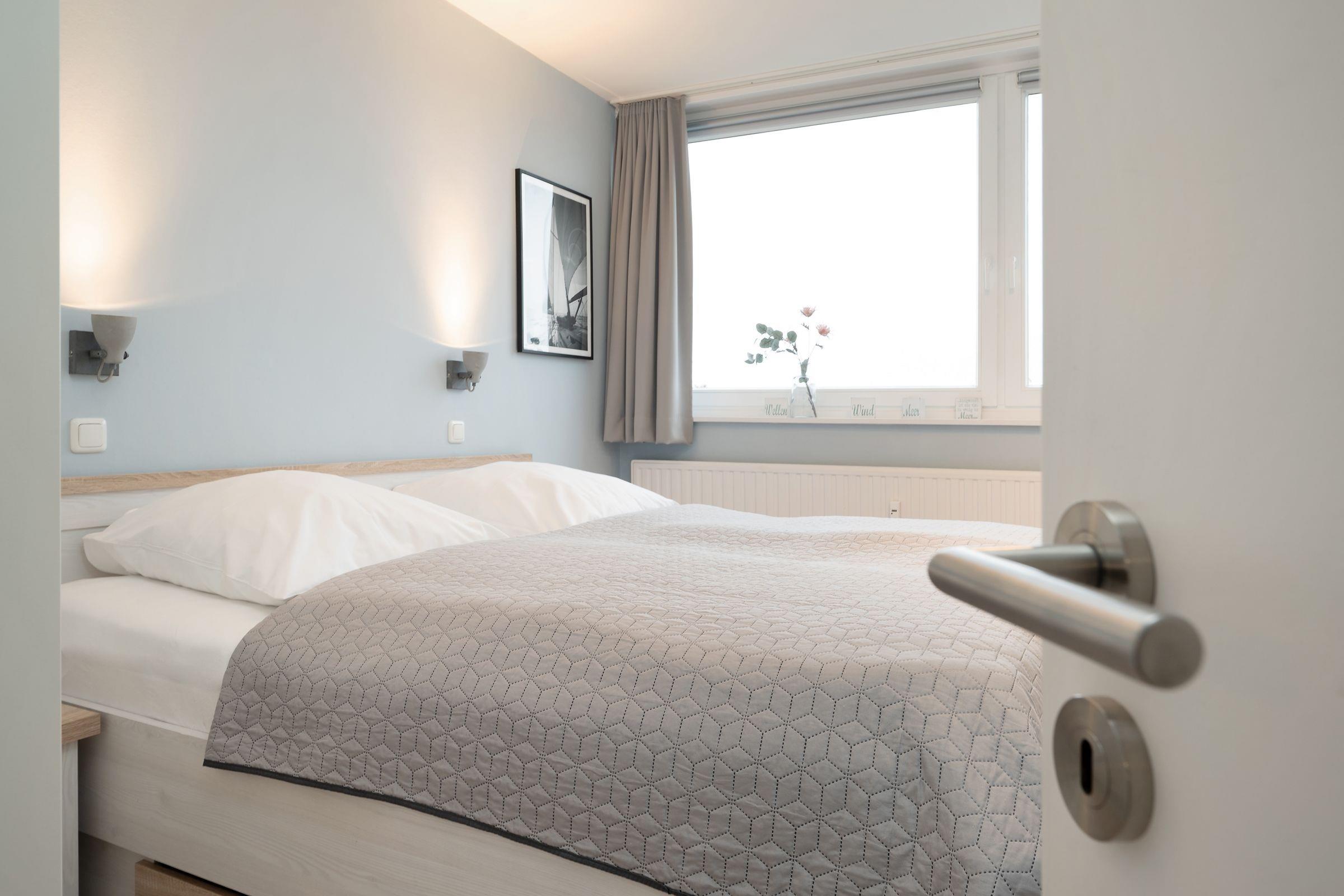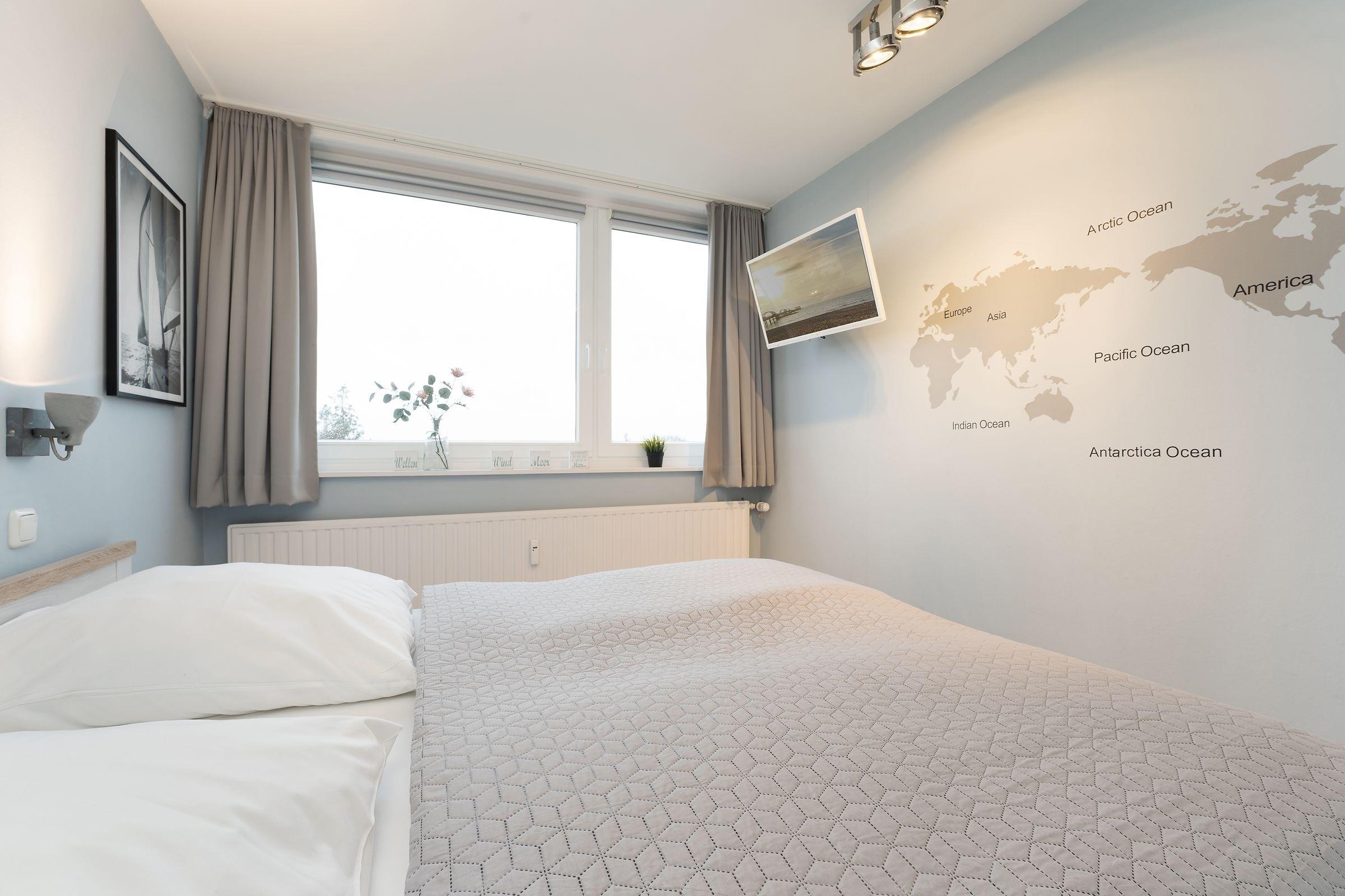 Ein traumhaft schönes und strandnahes Urlaubsdomizil erwartet Sie im Haus Meeresblick. Die Wohnung verfügt über eine pfiffig aufgeteilte EBK mit Backofen, Geschirrspüler, Kühlschrank mit separatem Gefrierschrank (2 Schubladen), Kaffeemaschine, Toaster etc. Vom offen gestalteten Wohnbereich mit Sofalandschaft und großem Essbereich gelangen Sie zum sonnigen Eckbalkon. Ein Schlafzimmer ist mit einem Doppelbett (je ca. 90x200 cm) und zusätzlichem TV-Gerät, ein weiteres Schlafzimmer mit Etagenbett (je ca. 90x190 cm) ausgestattet - hier kann auch bequem ein Kinderbettchen aufgestellt werden. Das moderne Duschbad mit WC komplettiert das Angebot. Ein WLAN-gratis-Angebot ist eine weitere Annehmlichkeit.